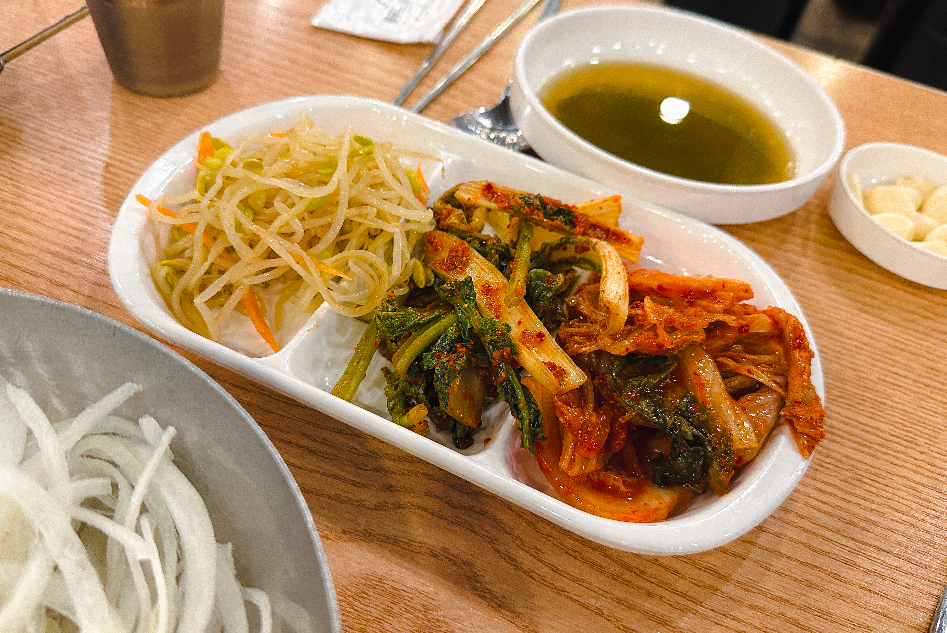 먹고 싶었던 고기와 반찬을 접시에 덜어서 자리에 가져왔습니다. 기본적으로 상추와 양파는 제공해주고 있었고 나머지 반찬들을 가져다 먹었습니다. 저희는 처음으로 갈매기살을 구웠고, 나중에 양념갈비를 추가로 구웠습니다.