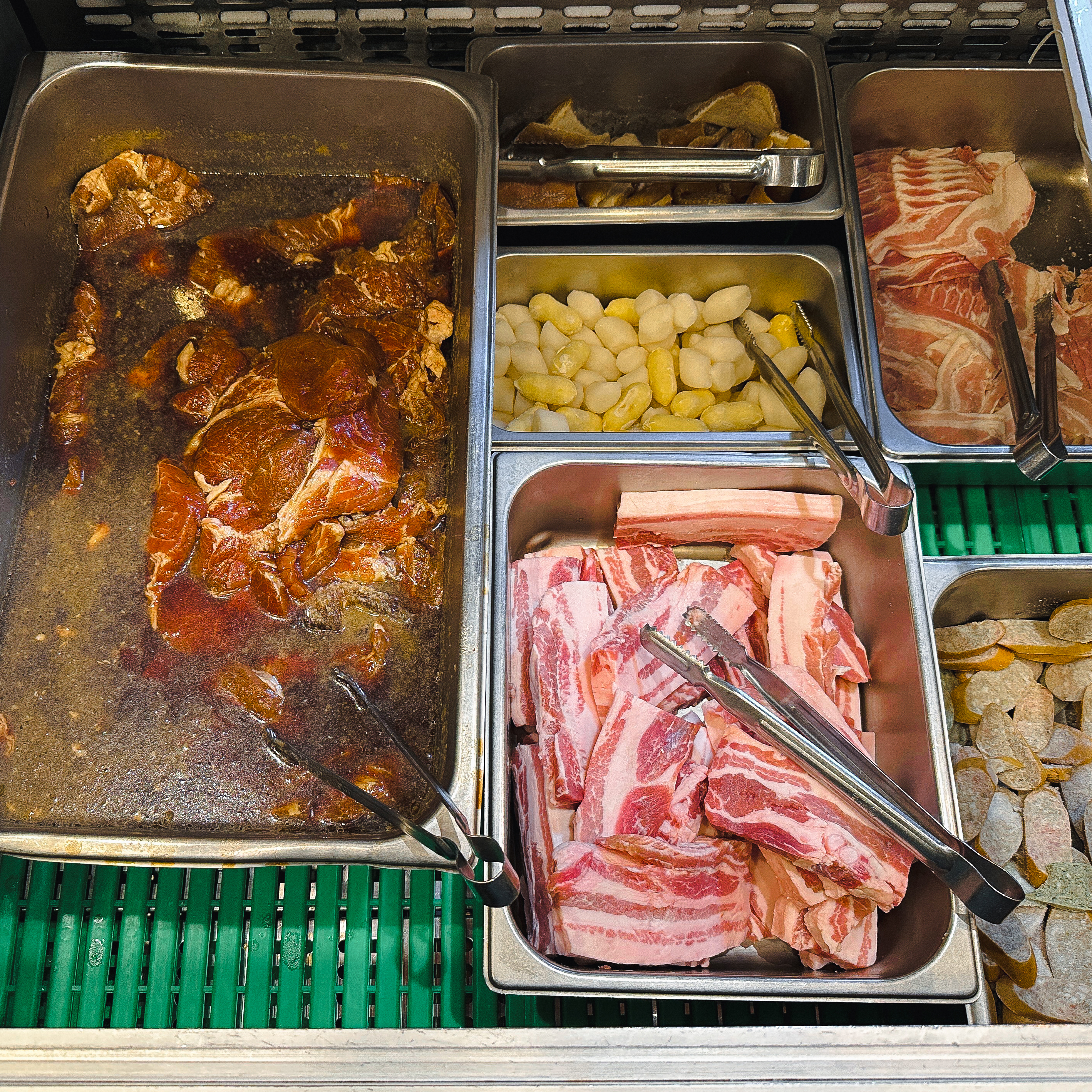 고기의 종류는 주로 양념갈비, 껍데기, 떡, 소시지, 삼겹살, 갈매기살 등이 있었습니다. 종류가 다양하지는 않았지만, 가게의 주력인 갈매기살과 양념갈비 위주로 골라먹을 수 있도록 되어있었습니다.