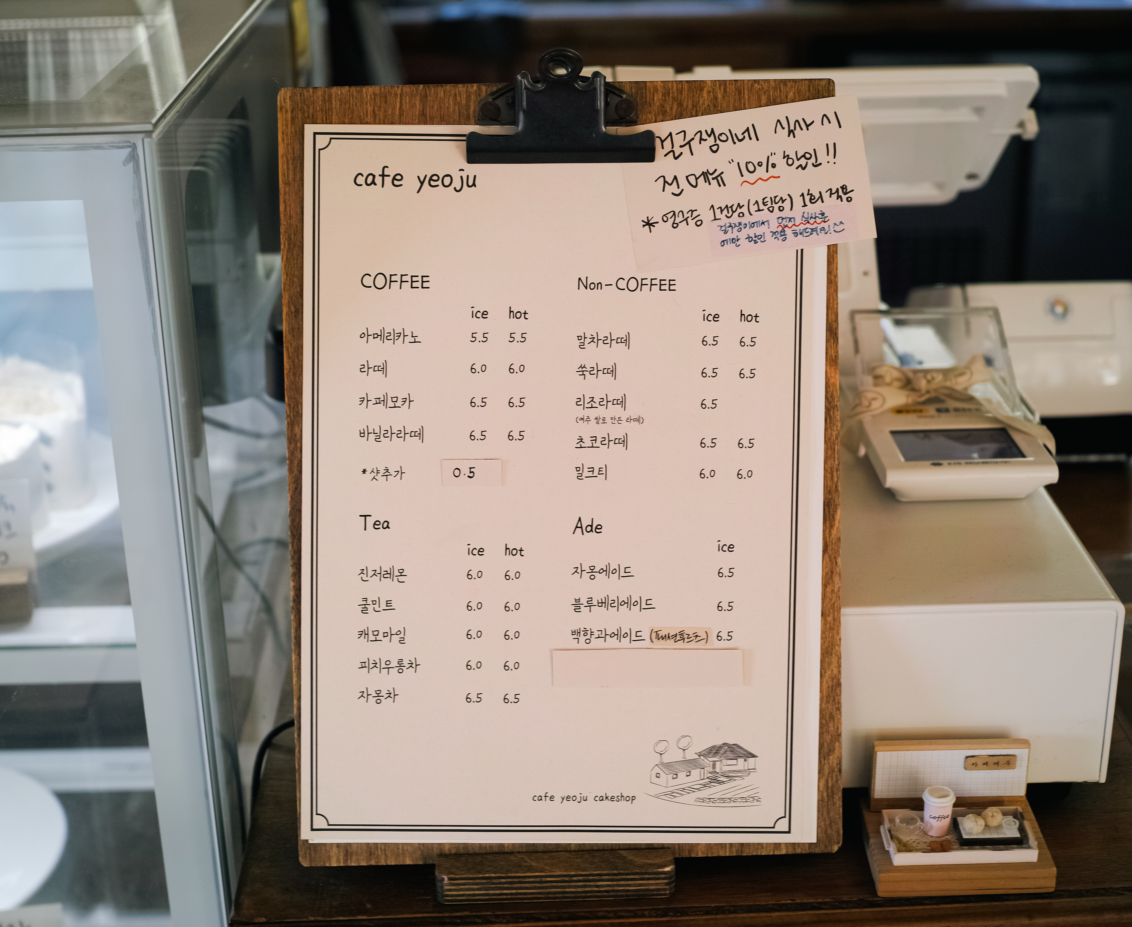 카페여주의 메뉴는 위와 같습니다. 아메리카노, 라떼, 카페모카, 바닐라라떼, 말차라떼, 쑥라떼, 리조라떼, 초코라떼, 밀크티, 진저레몬, 쿨민트, 캐모마일, 피치우롱차, 자몽차, 자몽에이드, 블루베리에이드, 백향과에이드 등이 있었고, 스콘이나 케이크같은 디저트들도 있었습니다. 저는 아메리카노 아이스로 1잔을 주문했습니다.