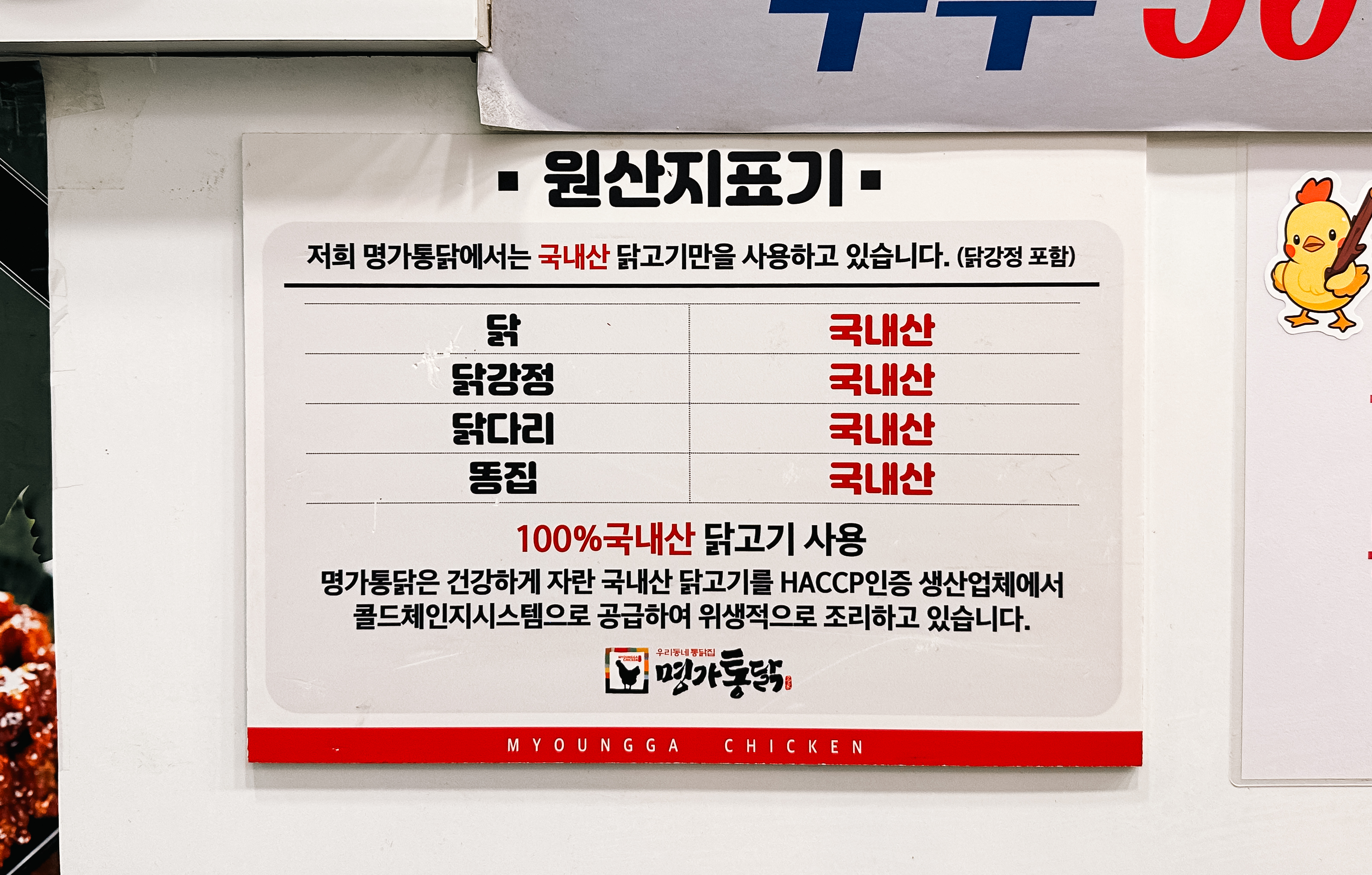 명가통닭의 메뉴는 명가통닭, 양념통닭, 간장통닭, 마늘통닭, 닭강정, 똥집, 양념똥집이 있었습니다. 참고로 이곳은 명가통닭으로 불리는 옛날통닭을 9,000원에 판매중이었습니다. 물론, 앞서 설명드린 것처럼 카드와 현금가격이 동일했습니다. 명가통닭의 닭고기는 국내산을 사용하고 있었습니다. 저가형 치킨집답게 소스는 별도판매중이었습니다.