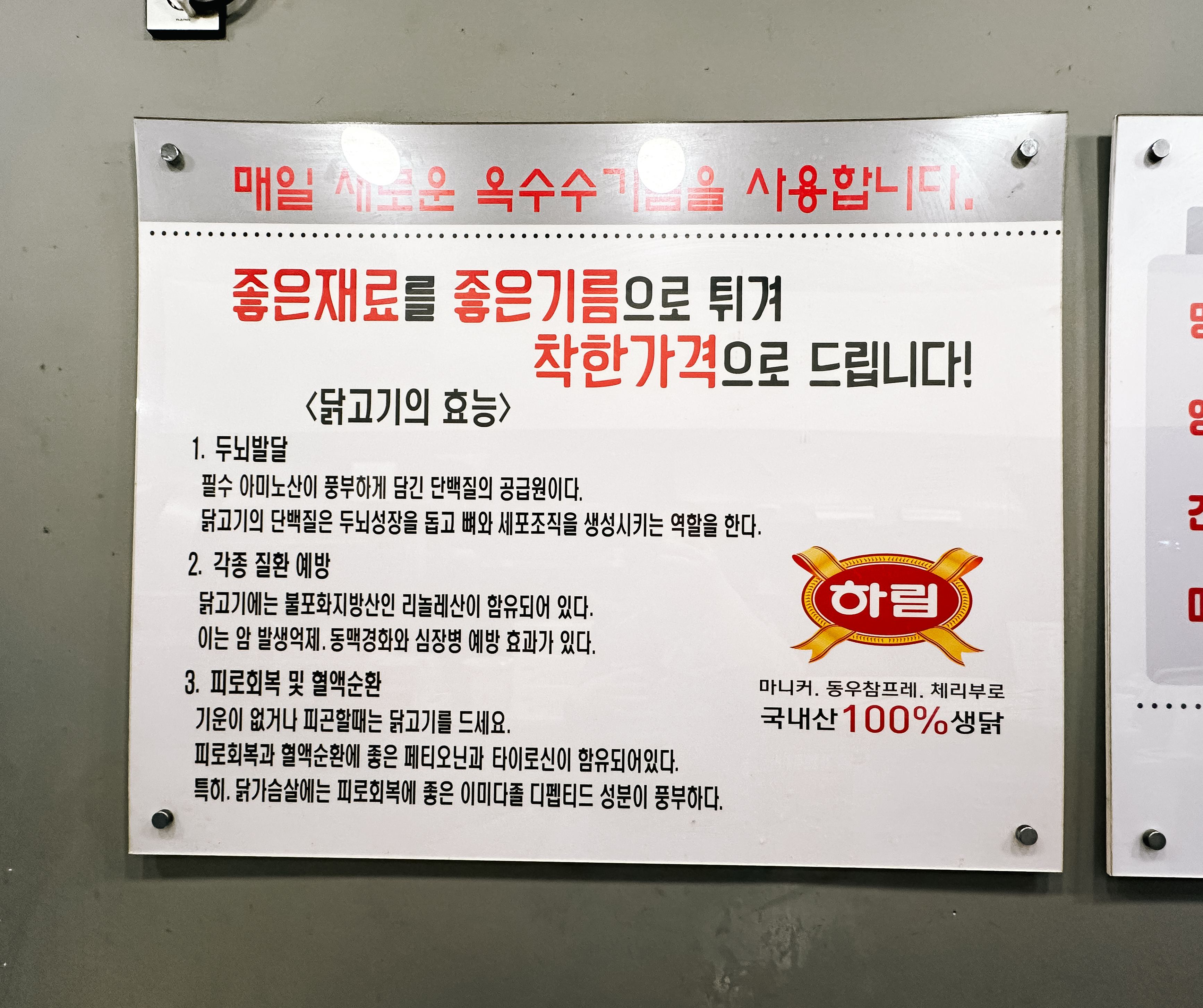 명가통닭 거여점은 서울 송파구 거여동 21, 1층 104호에 위치해 있었습니다. 이곳은 대로변에 위치해 있어서 그런지 주차는 어려웠습니다. 대부분의 음식점마다 붙어있는 미스터리. ⎡ㅇㅇ의 효능⎦도 게시되어 있었습니다. 그럼 이제 명가통닭의 메뉴를 살펴보시죠.