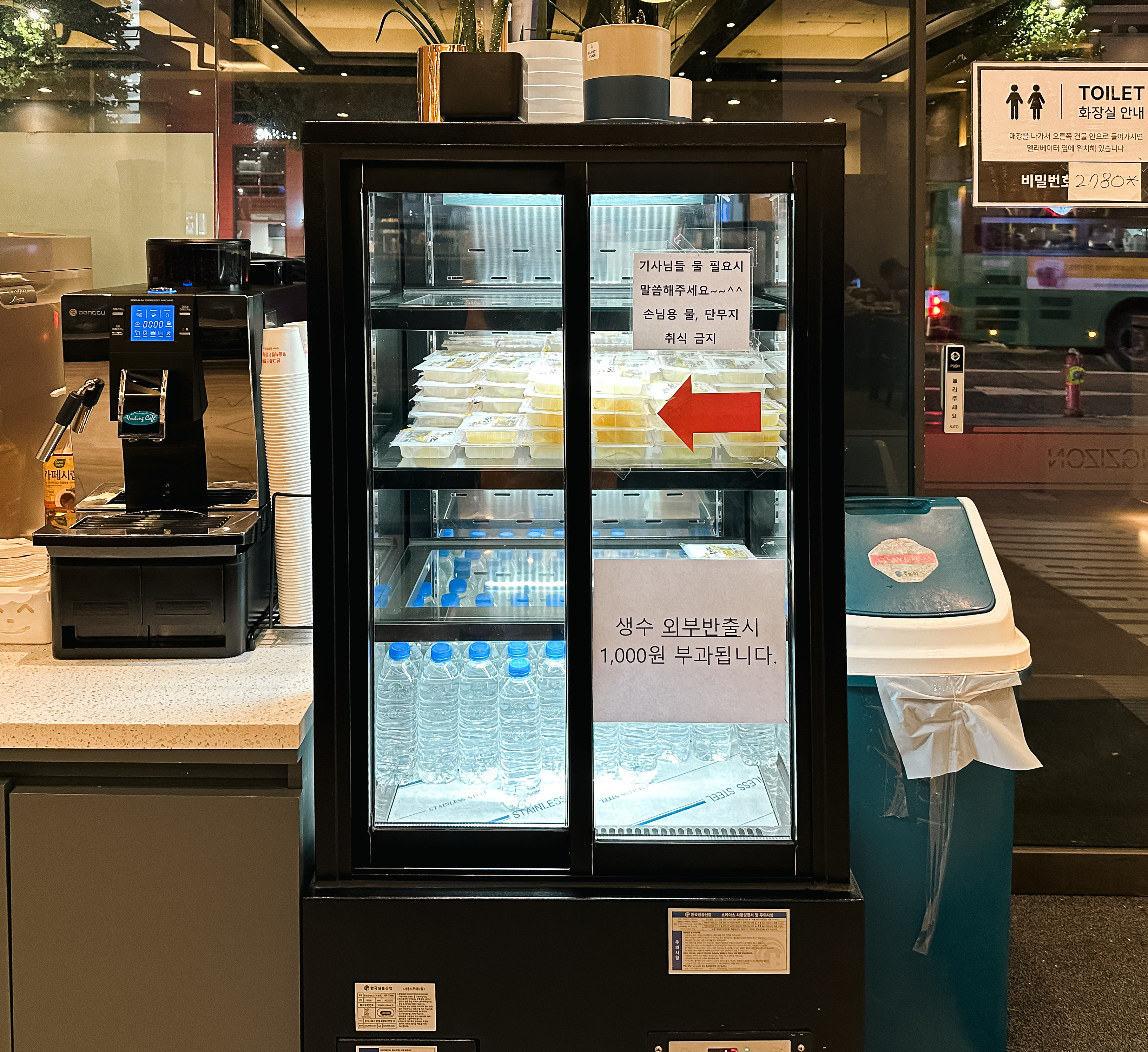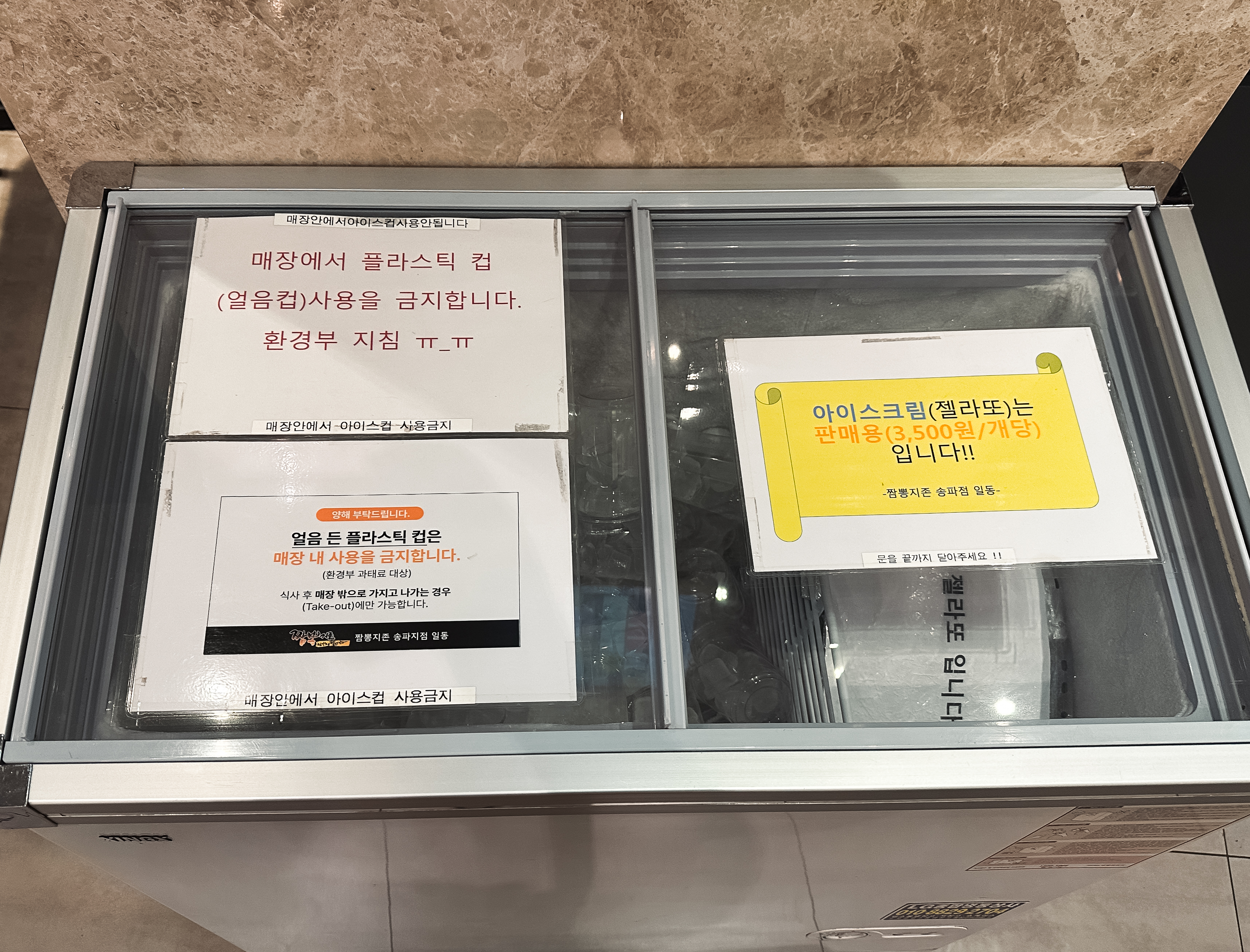 가게에는 셀프바가 있었는데, 공기밥과 생수, 단무지를 원하는 만큼 가져다 먹을 수 있도록 되어있었고, 후식으로 아이스티나 커피, 음료를 마실 수 있도록 서비스하고 있었습니다.