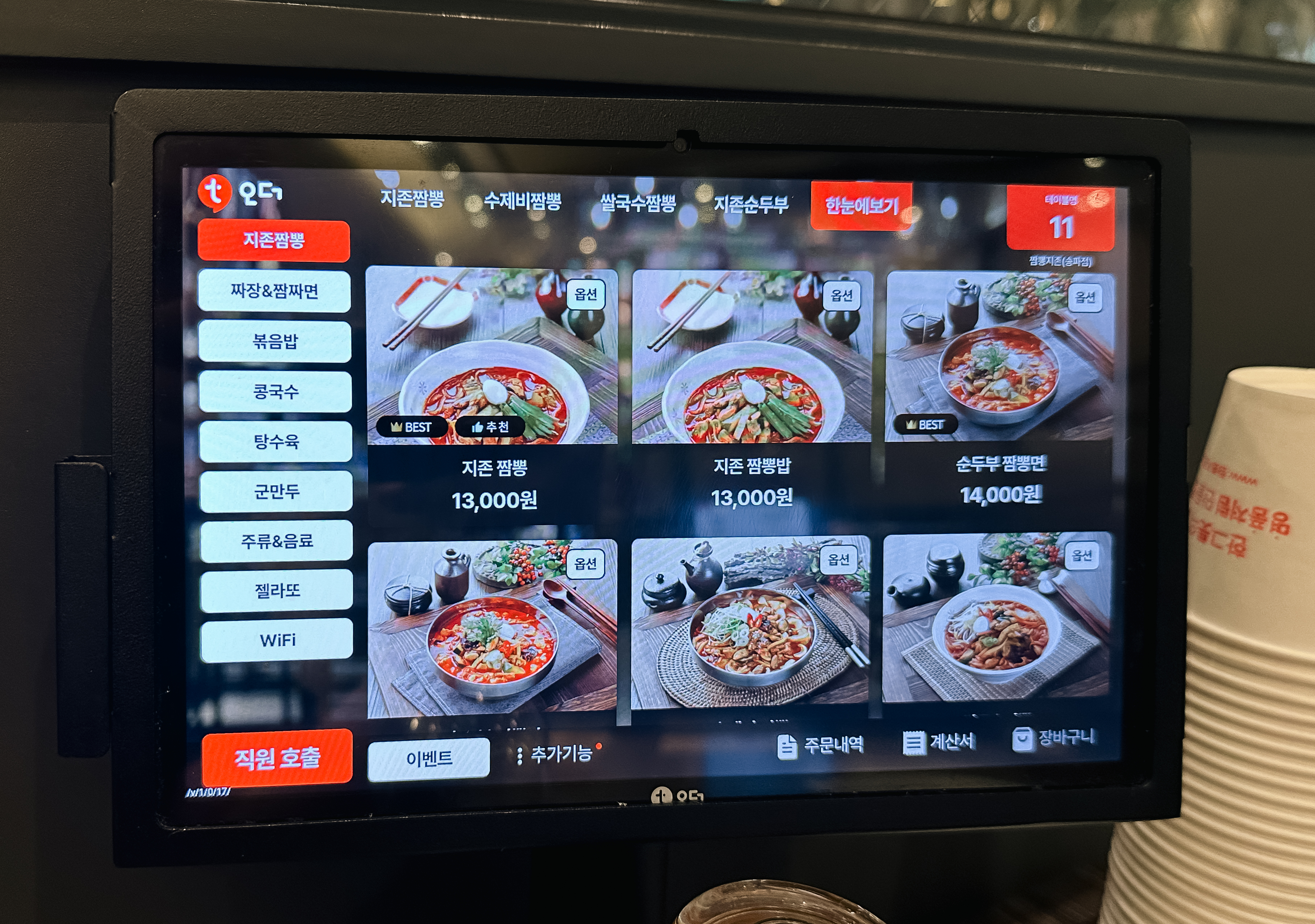 짬뽕지존의 메뉴는 자리에 위치한 태블릿을 통해 주문할 수 있었습니다. 메뉴는 지존짬뽕, 지존짬뽕밥, 순두부짬뽕면, 순두부짬뽕밥, 수제비짬뽕, 쌀국수짬뽕, 지존짜장, 지존짜장밥, 지존짬짜면, 새우볶음밥, 게살볶음밥, 사천탕수육, 찹쌀탕수육, 군만두 등이 있었습니다.