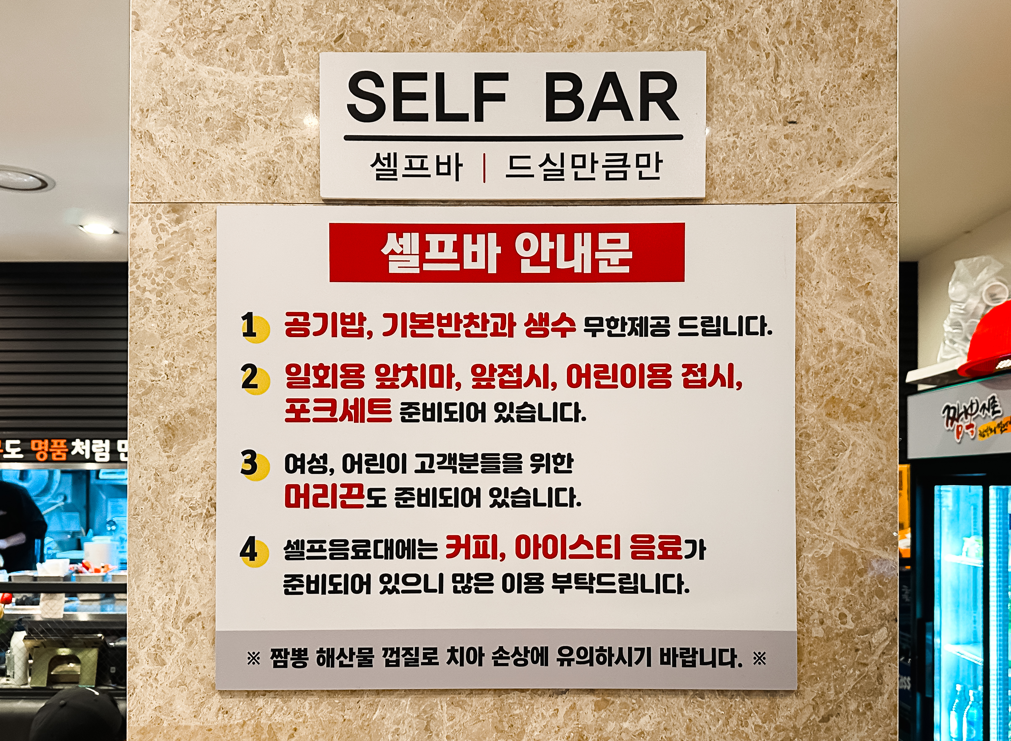 가게에는 셀프바가 있었는데, 공기밥과 생수, 단무지를 원하는 만큼 가져다 먹을 수 있도록 되어있었고, 후식으로 아이스티나 커피, 음료를 마실 수 있도록 서비스하고 있었습니다.