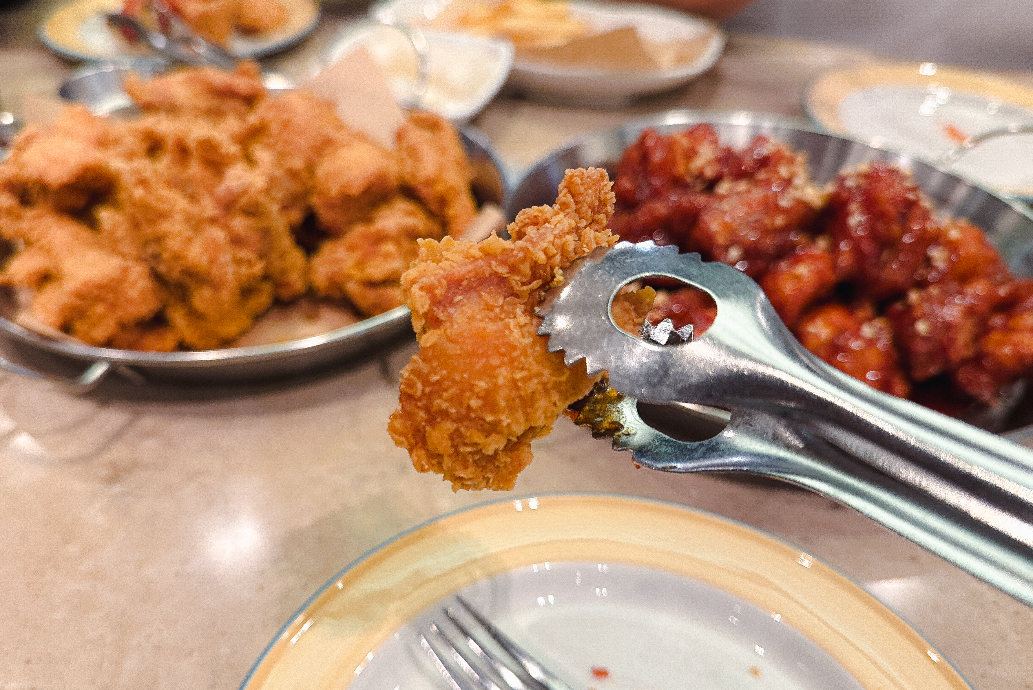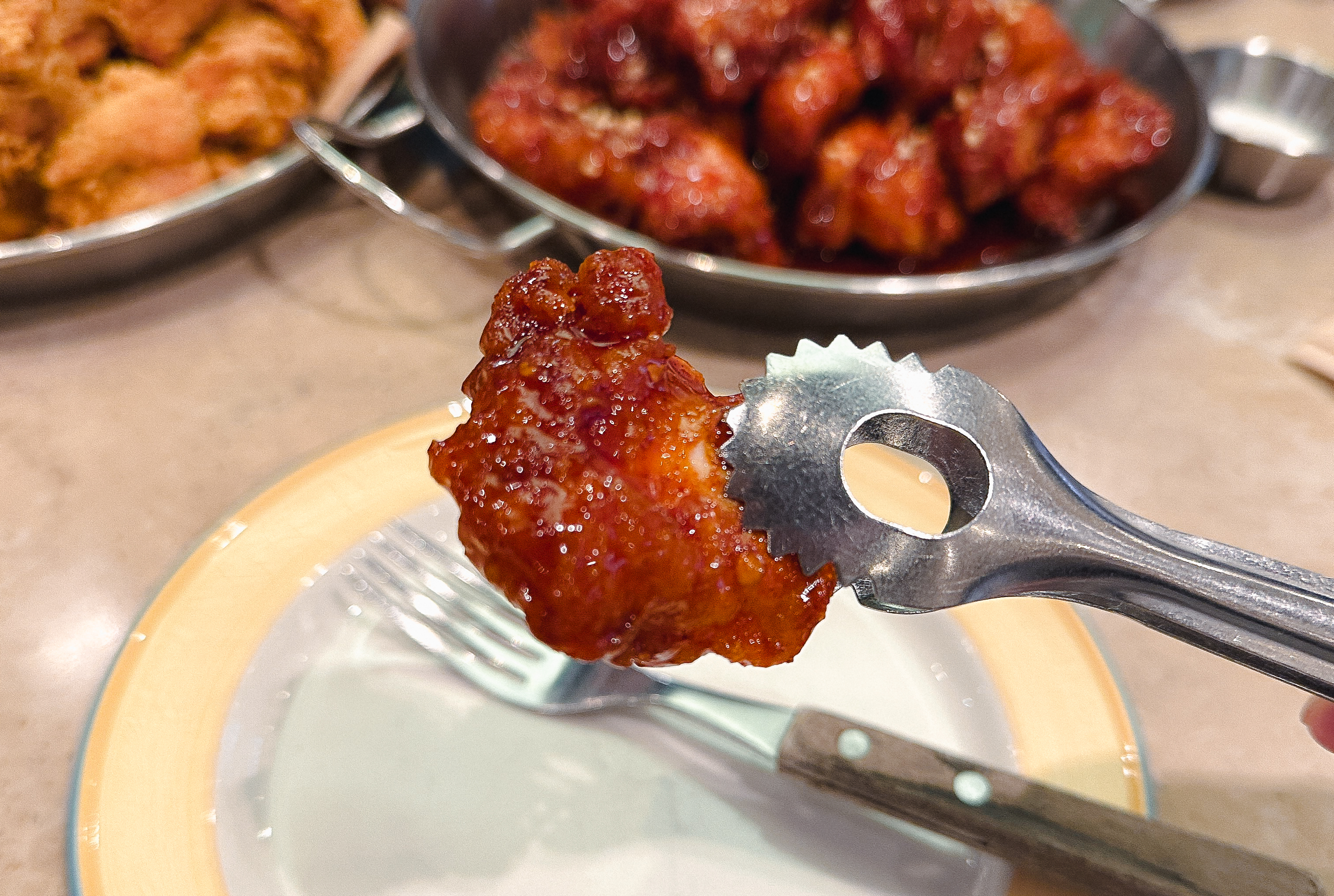 원래는 접시를 사용하기보다는 치킨 접시에서 직접 집게로 가져다 먹었는데, 외국인 친구에게 맞춰주어 치킨을 접시에 따로 덜어낸 다음 포크로 먹었습니다. 평소 습관이 들어있다면 편했을 텐데, 안 하던걸 하려니 어색하긴 했지만, 나중에 이탈리아에 가게 되면 가이드해준다는 말에 열심히 적응하려 노력했습니다.