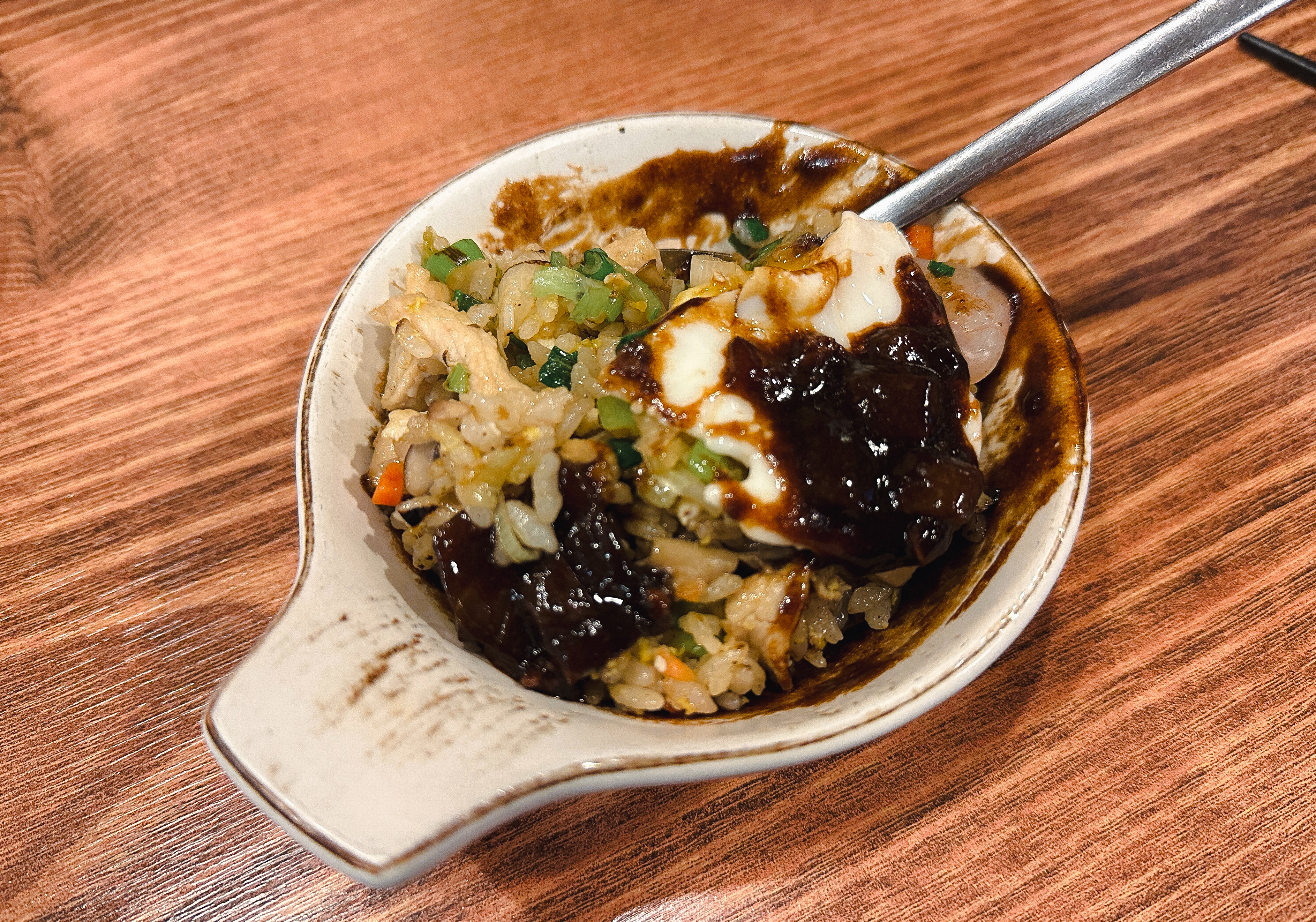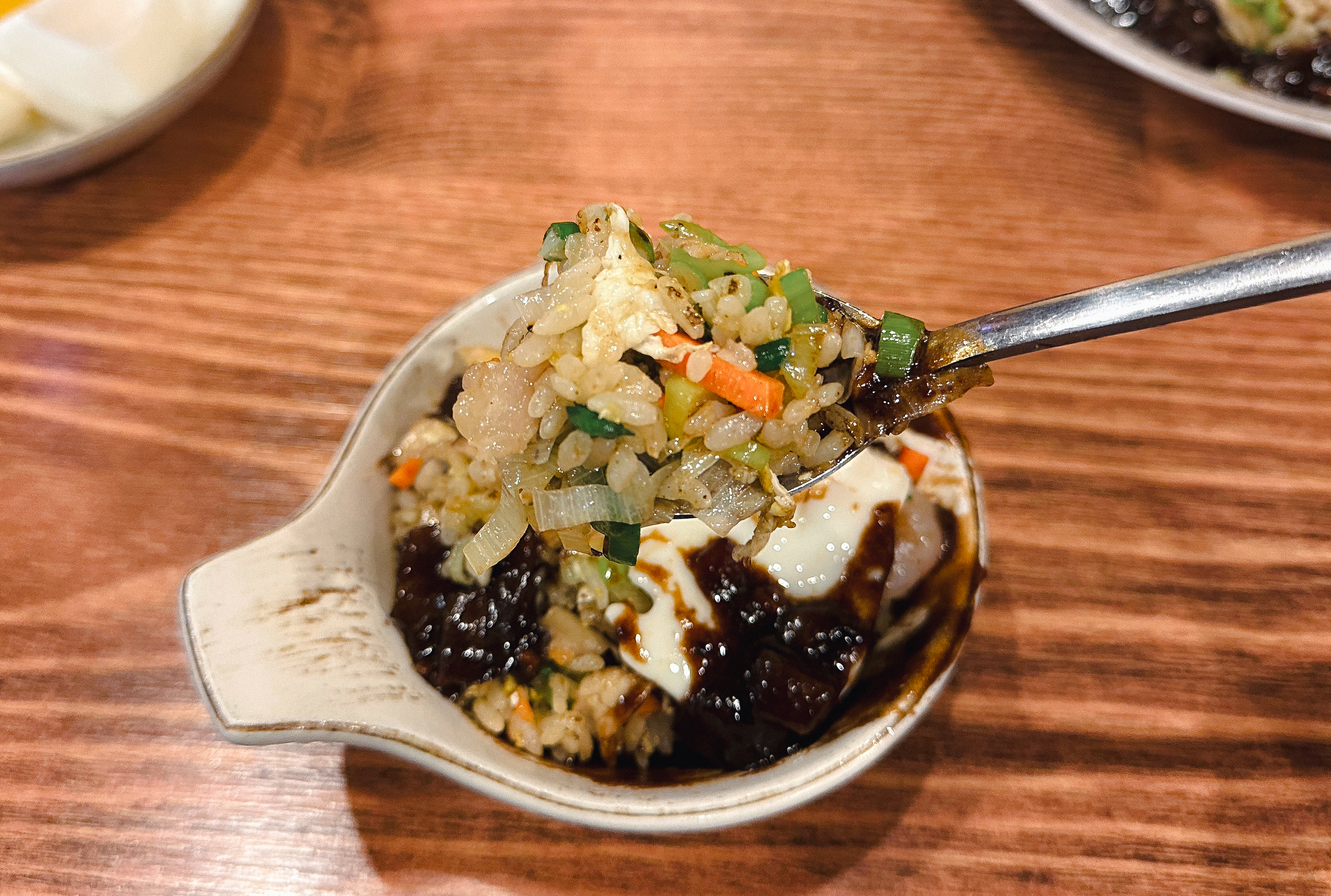 오향가 볶음밥을 주문하면 볶음밥에 곁들일 짜장소스와 짬뽕국물을 같이 제공해 줍니다. 볶음밥은 고슬고슬하게 잘 볶아낸 것이 특징인데, 새우와 버섯, 대파, 당근등을 넣고 불맛까지 입혀서 한 번 맛보면 중독성이 아주 강한 메뉴입니다. 같이 주는 짜장 소스와 비벼서 먹어도 되고 따로 먹어도 괜찮은데,