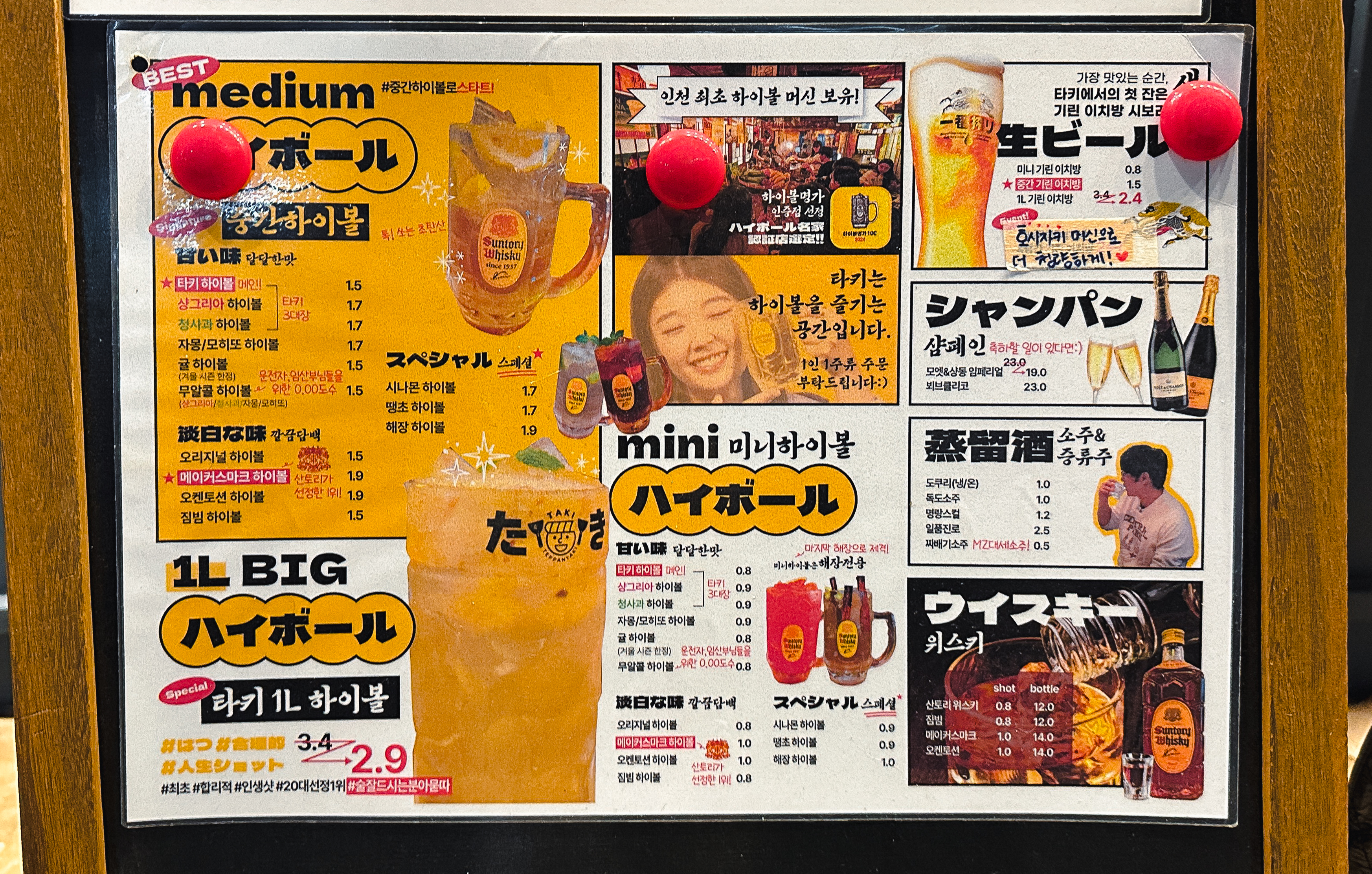 성수역 이자카야 타키의 메뉴는 위와 같았습니다. 와규블랙타이거, 호르몬구이, 토마토오코노미야끼, 가리비관자버터구이, 참치타르타르, 참치타다끼, 모츠나베, 우삼겹스키야키, 우삼겹마라탕, 오사카식철판볶음, 야끼소바, 갓김치라구파스타, 수제치즈&크래커, 숙성명란구이&오이 등이 있었습니다.