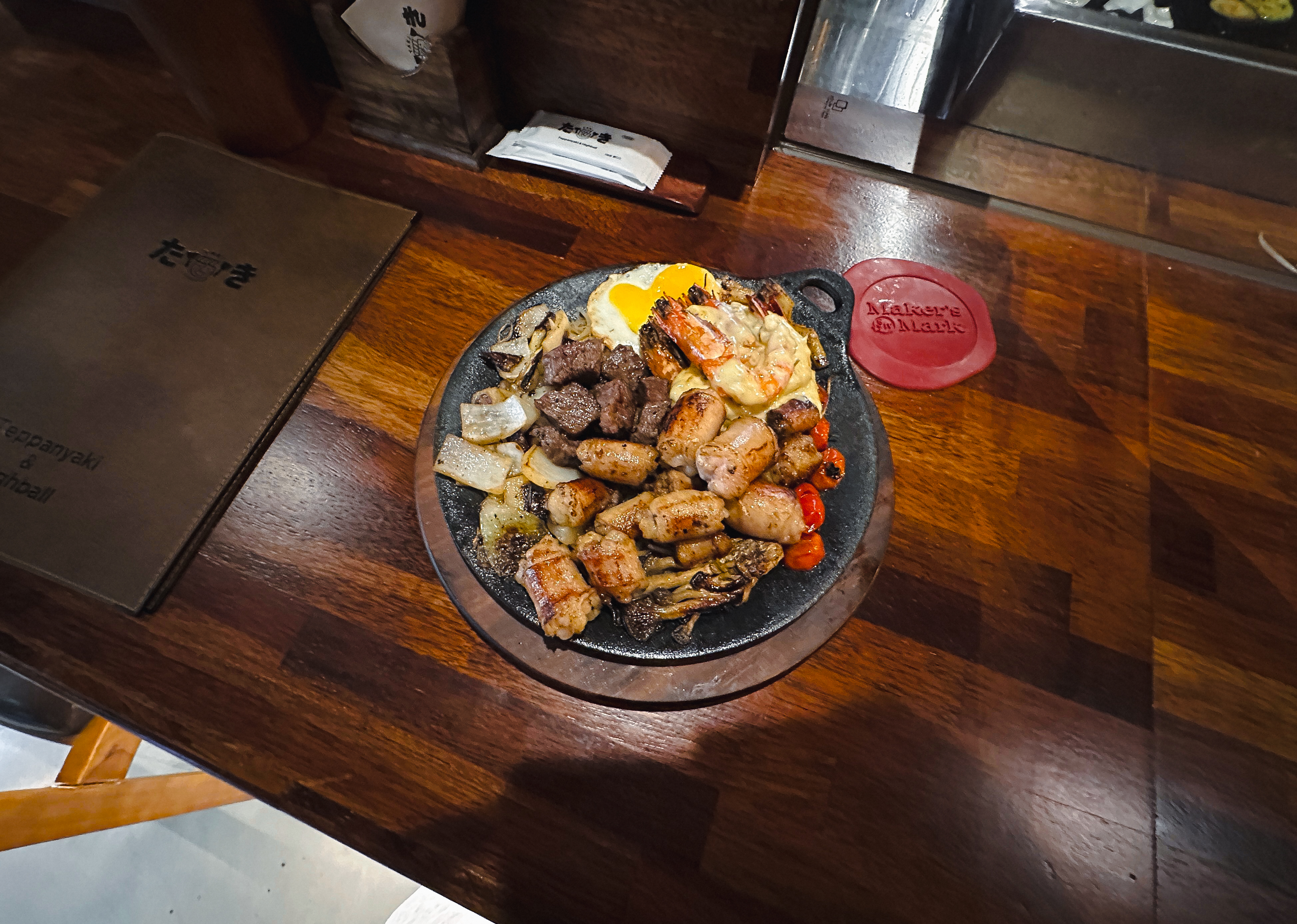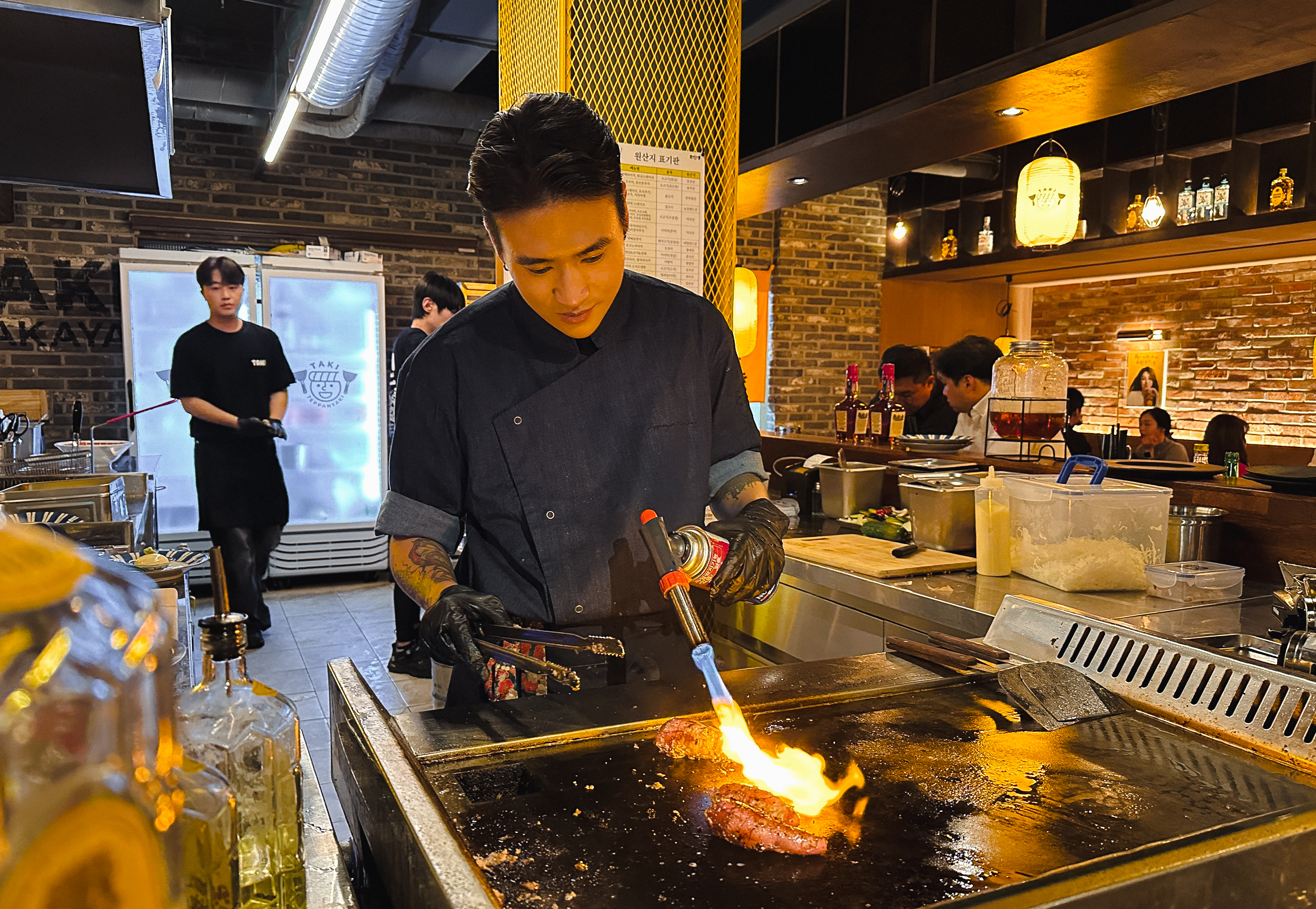 참고로, 저의 추천은 철판요리가 전체적으로 기름을 많이 쓴 요리이기 때문에 자칫 느끼하게 느낄 수 있는데, 여기에 시원한 하이볼을 같이 곁들이면 기름진 것도 잡아주고 맛있게 먹을 수 있었습니다. 타키의 와규블랙타이거를 어느 정도 먹은 다음 오사카식철판볶음을 먹었습니다.