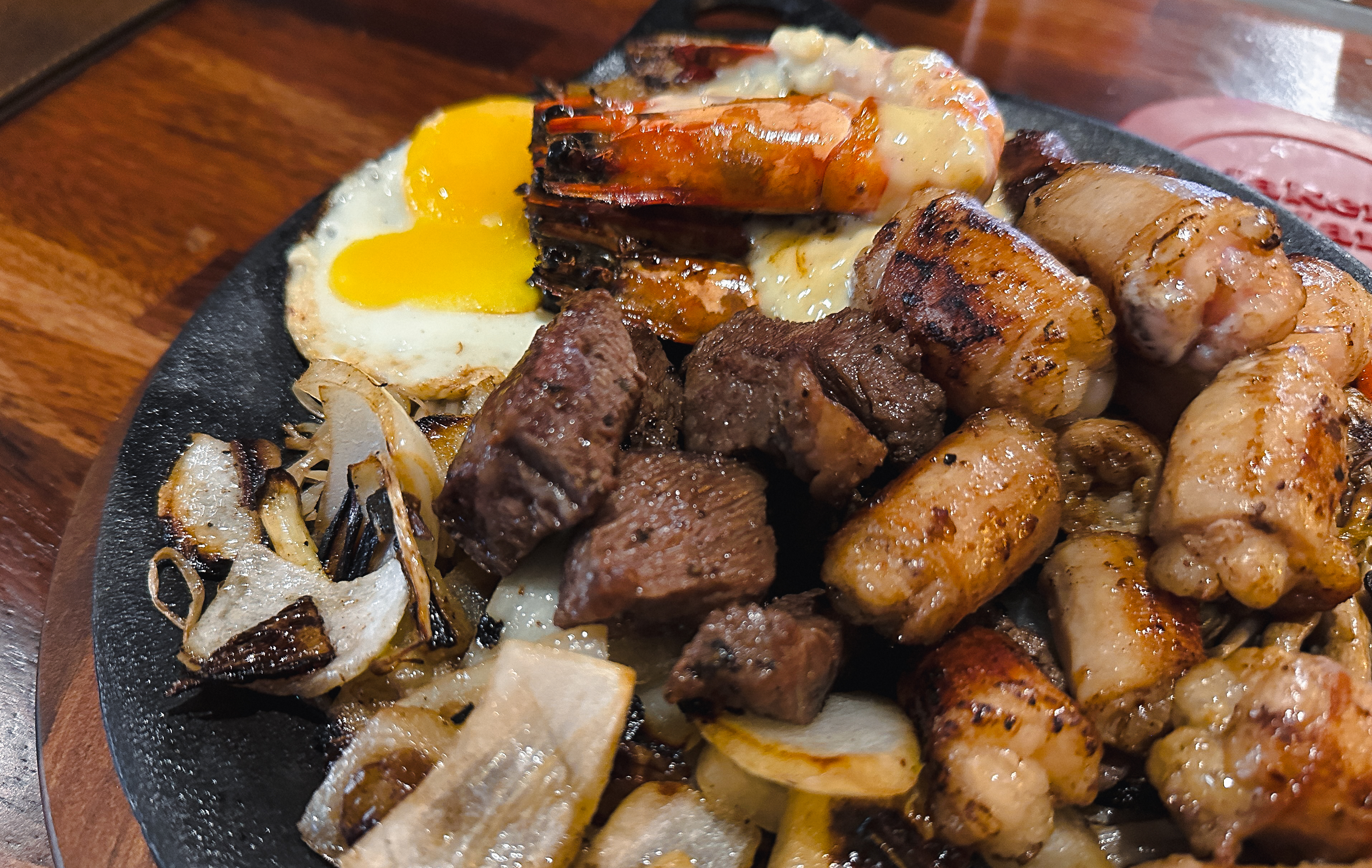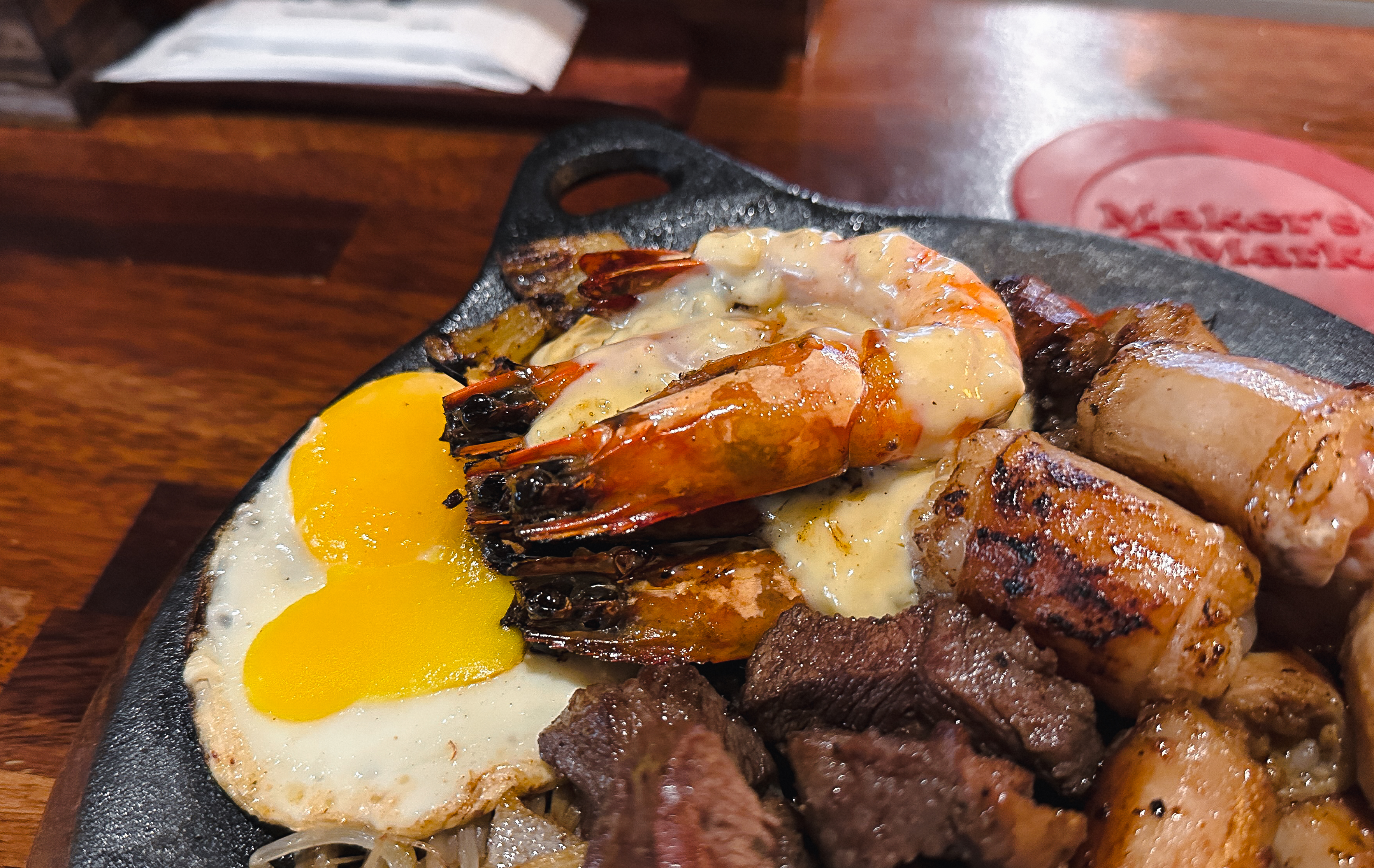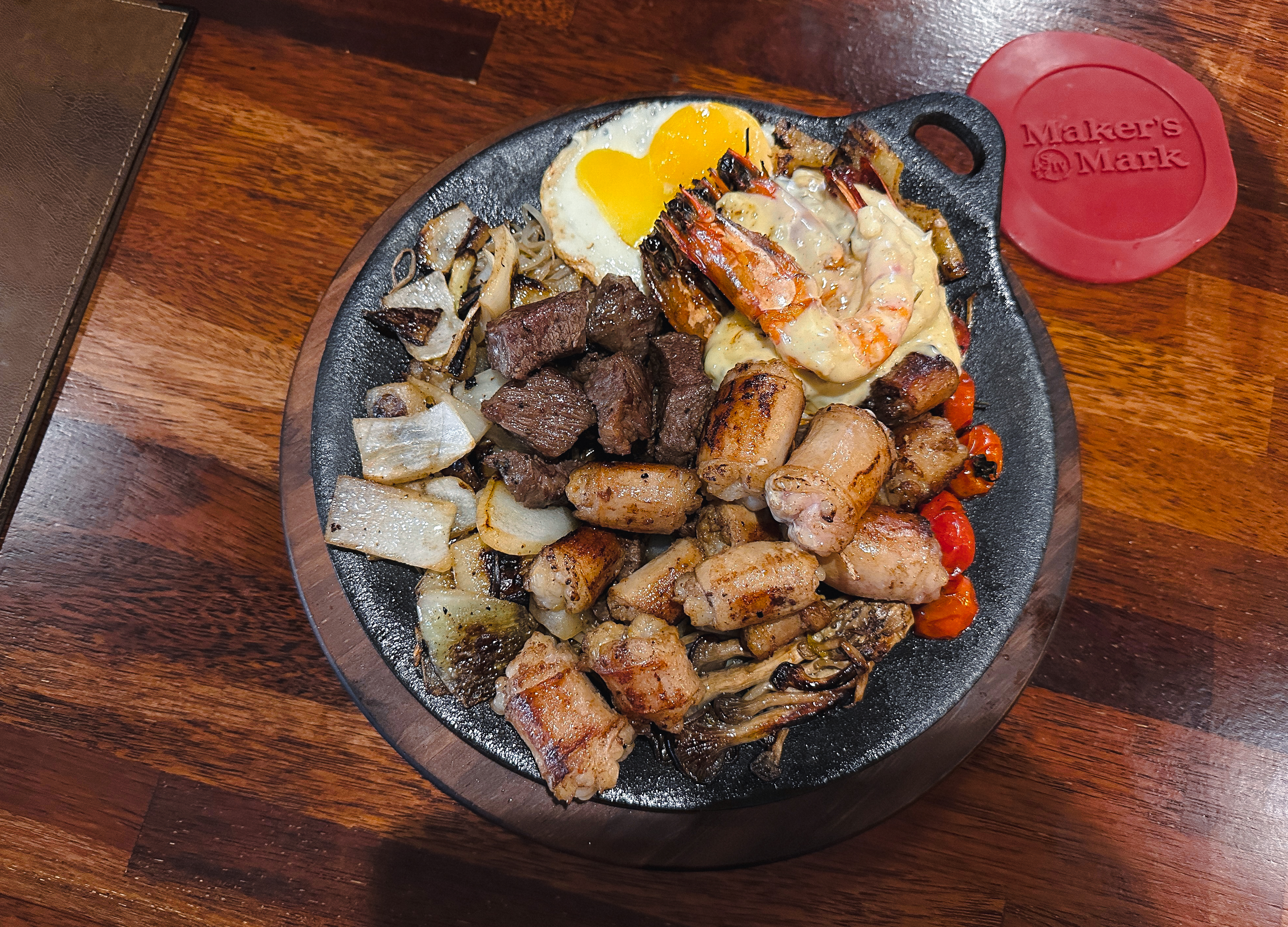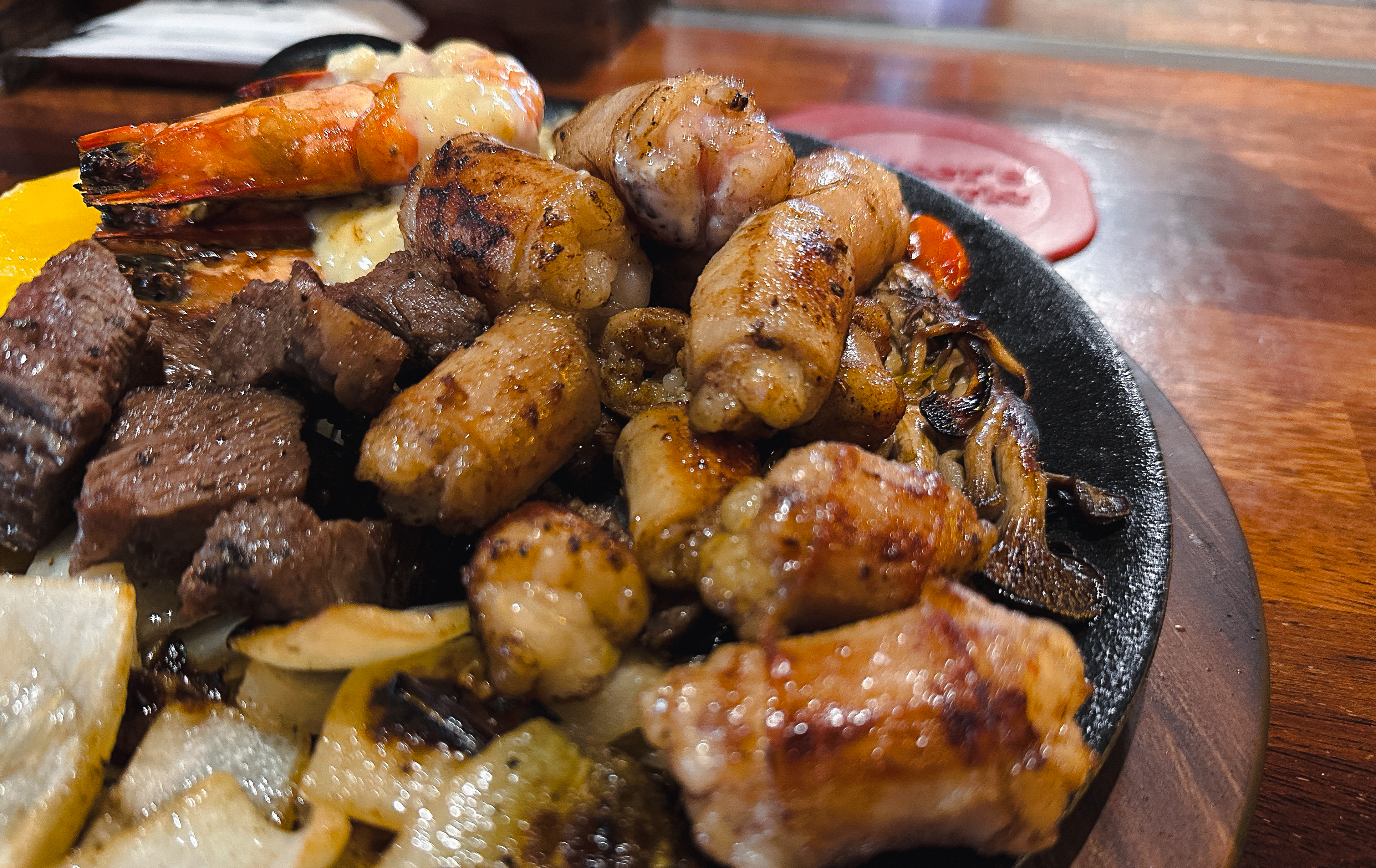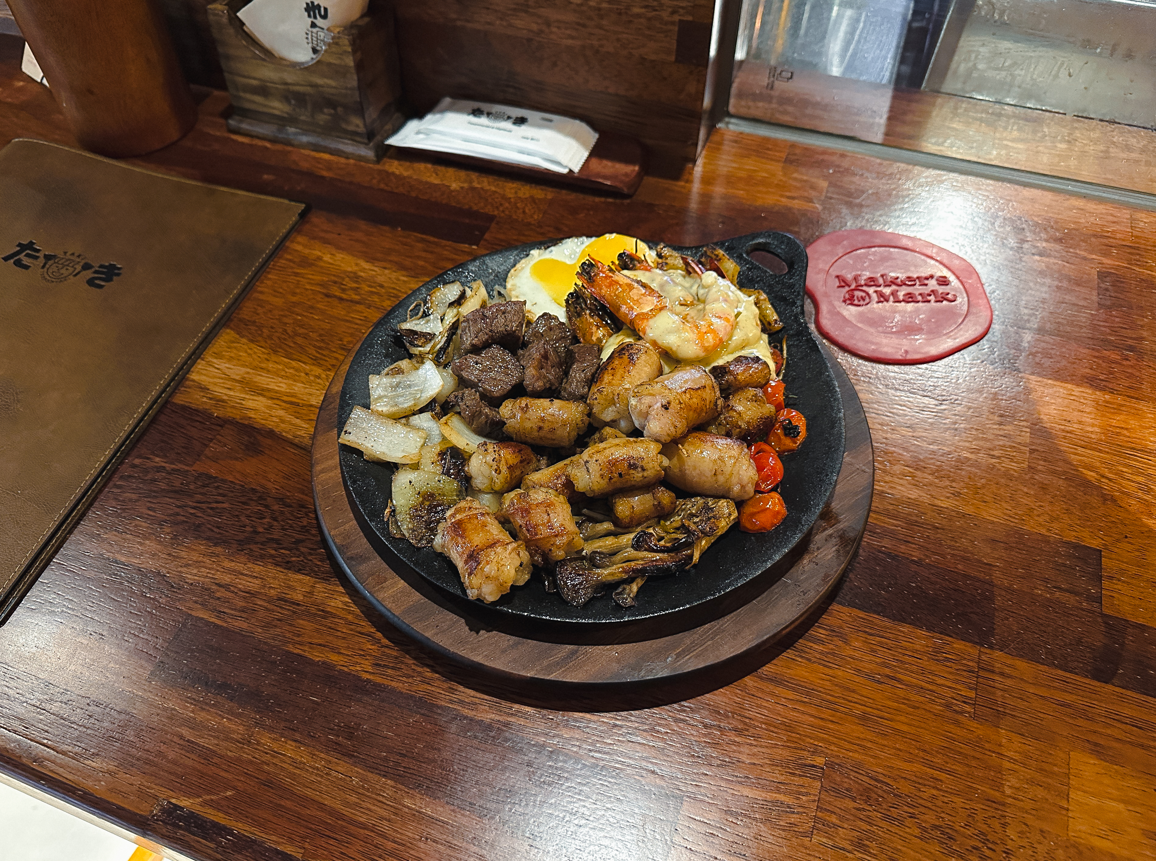 철판요리 전문 이자카야 타키의 베스트메뉴인 와규블랙타이거의 모습입니다. 와규블랙타이거에는 와규 소고기와 새우, 달걀, 양파, 호박, 버섯, 숙주나물, 파인애플, 방울토마토 등이 들어간 메뉴였습니다. 저희는 호르몬(대창)구이도 추가했습니다.