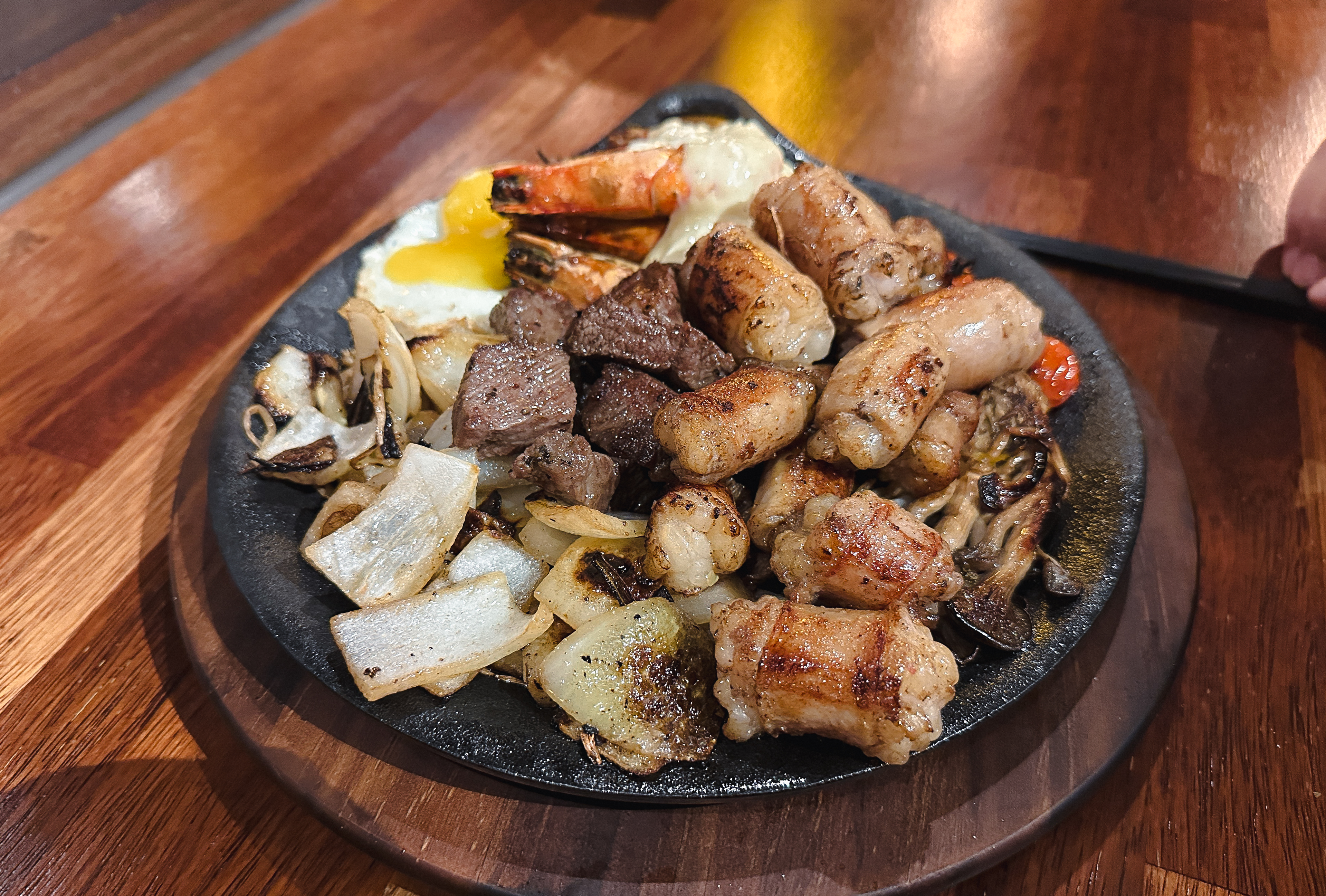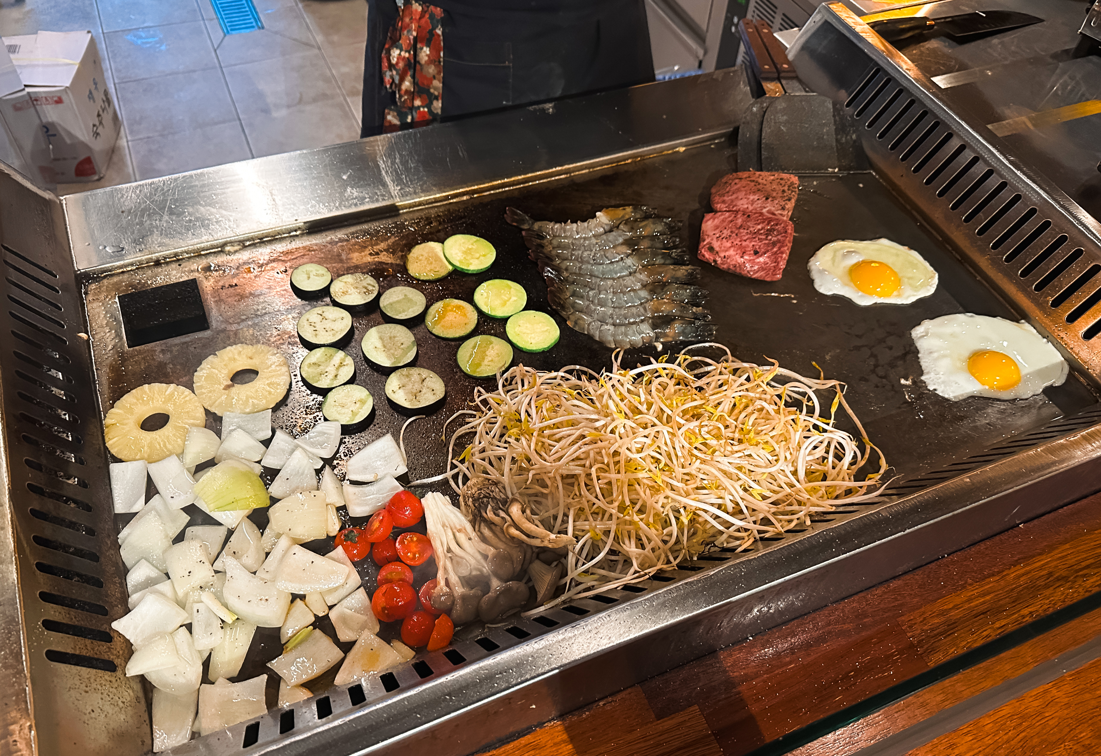 철판요리 전문 이자카야 타키의 베스트메뉴인 와규블랙타이거의 모습입니다. 와규블랙타이거에는 와규 소고기와 새우, 달걀, 양파, 호박, 버섯, 숙주나물, 파인애플, 방울토마토 등이 들어간 메뉴였습니다. 저희는 호르몬(대창)구이도 추가했습니다.