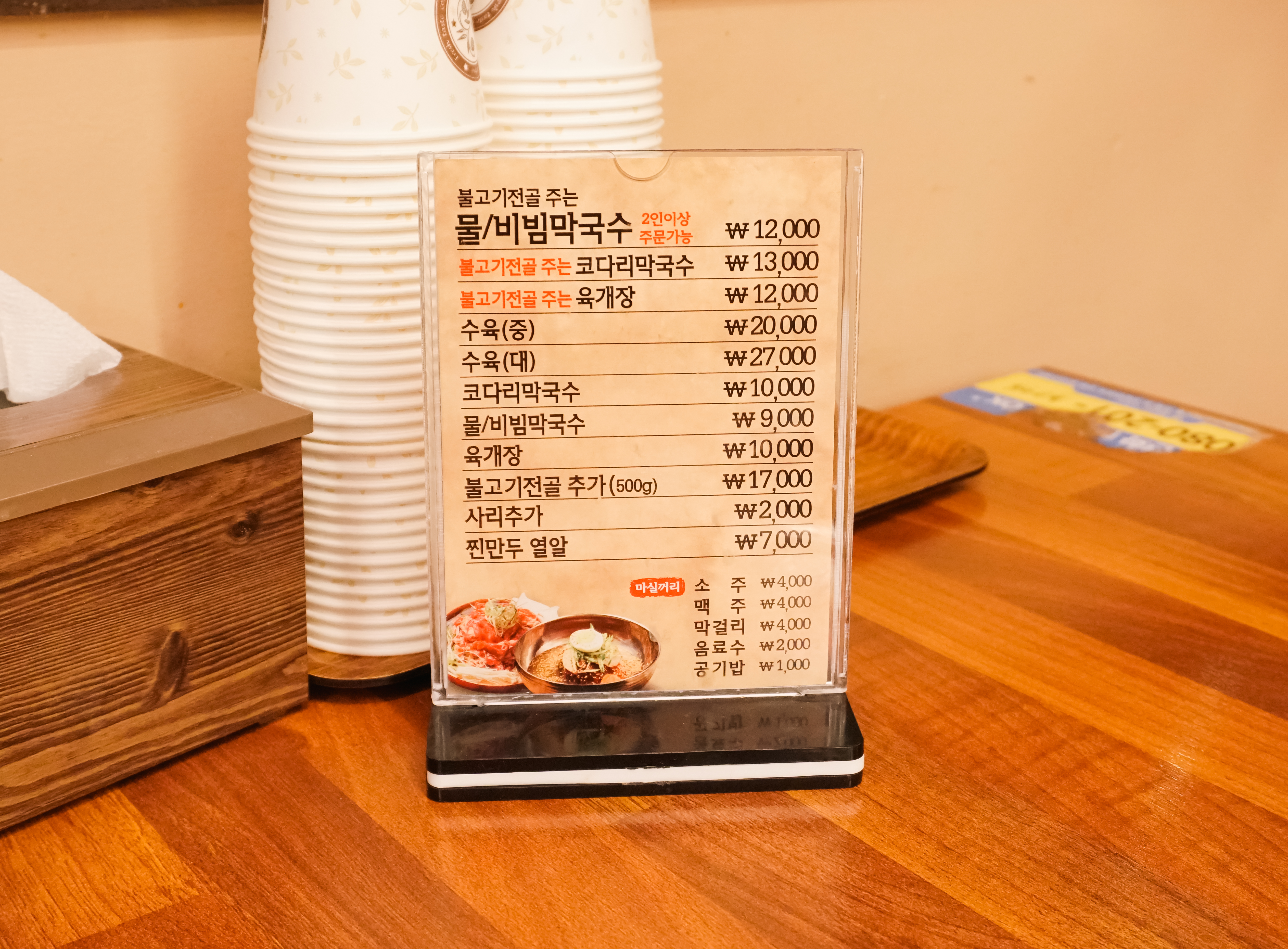 사음동 이천막국수의 메뉴는 불고기전골 주는 물/비빔막국수, 불고기전골 주는 코다리막국수, 불고기전골 주는 육개장, 수육 등이 있었습니다. 사실 이곳은 막국수 가격이 따로 있고, 불고기전골은 막국수 가격에 3,000원 추가된 금액에 같이 판매하고 있었습니다. 저희는 불고기전골 주는 물막국수와 비빔막국수를 주문했습니다.