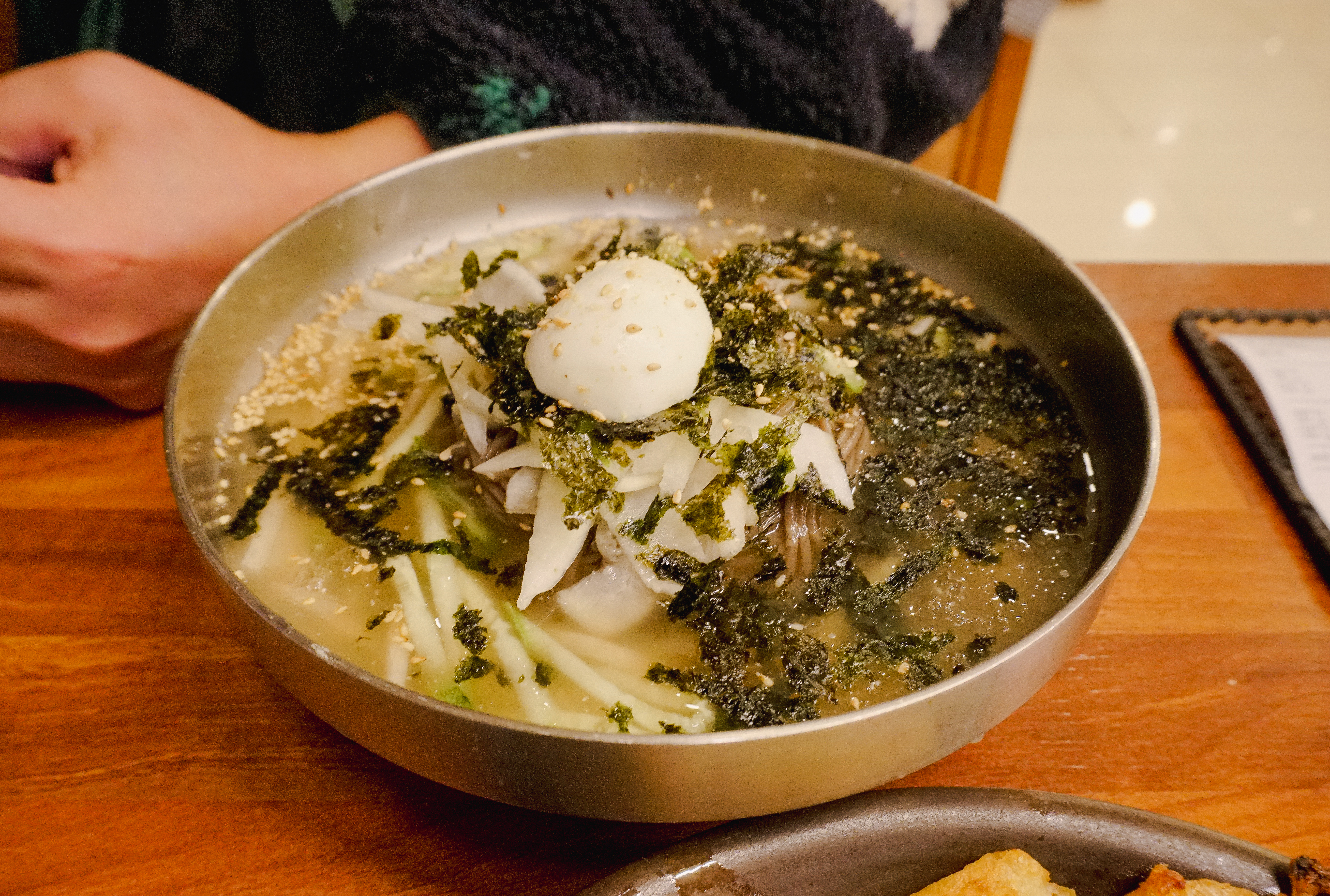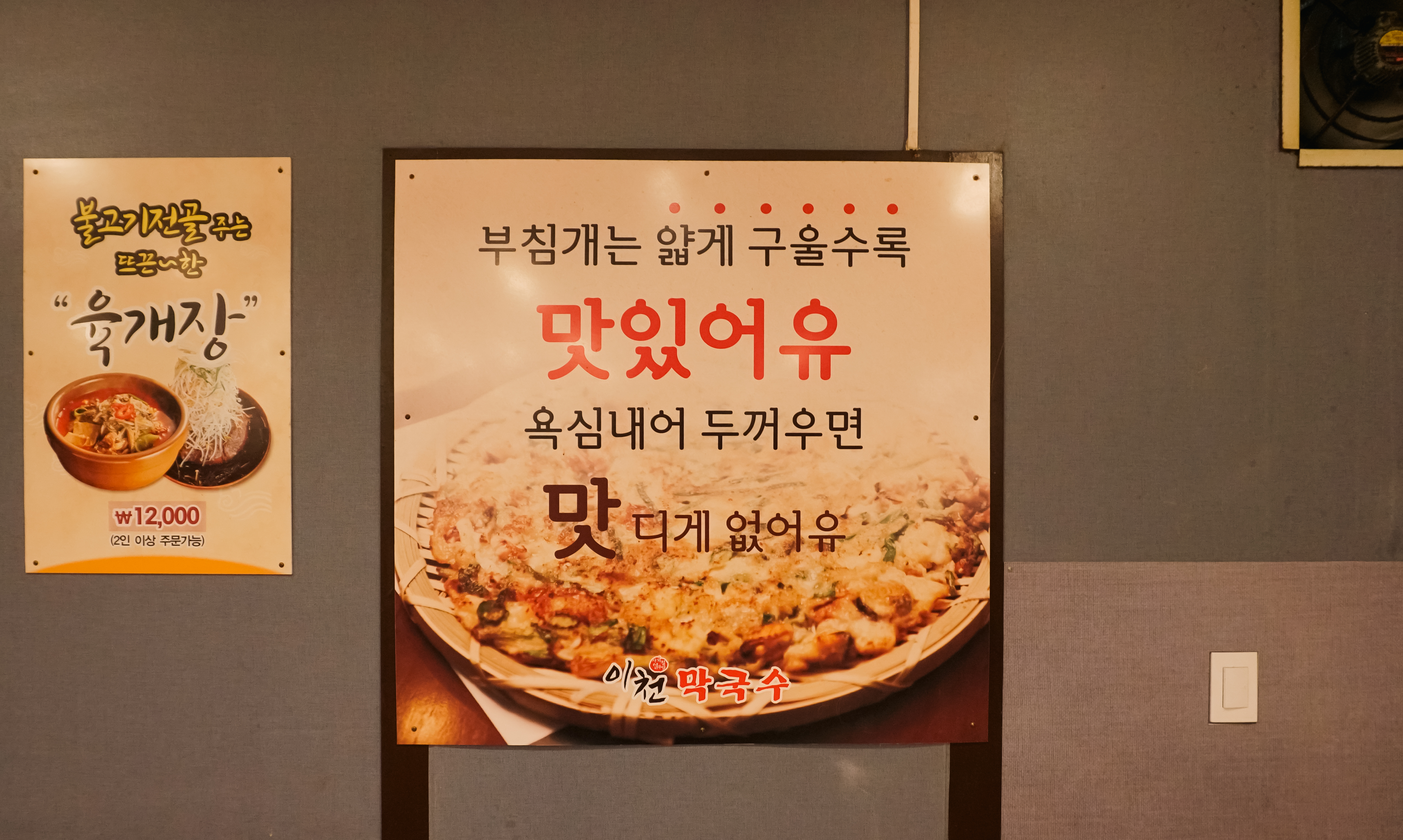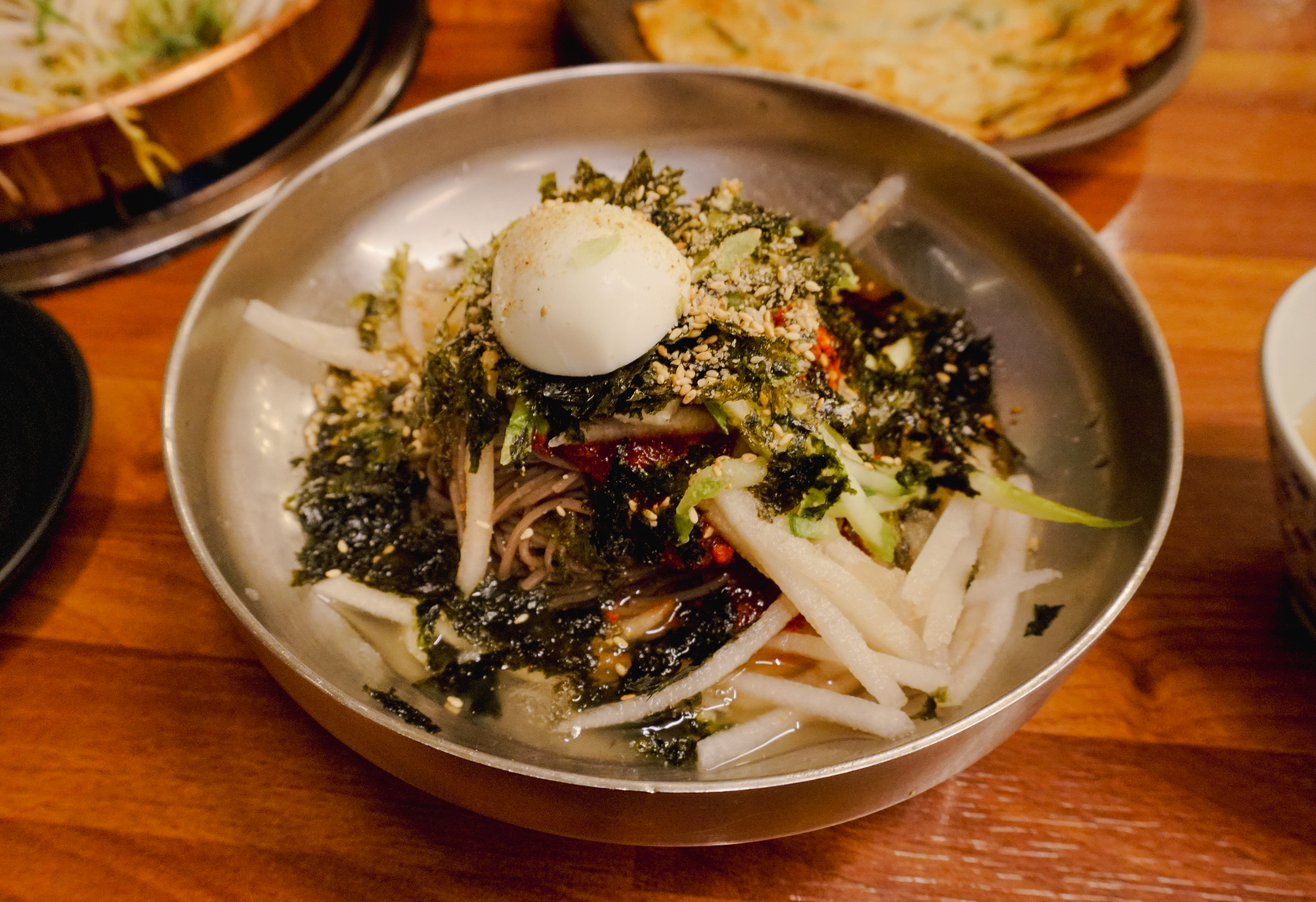 위의 사진은 각각 비빔막국수와 물막국수의 모습입니다. 막국수에 불고기를 얹어서 먹었는데, 막국수는 무난하게 먹을만했습니다. 그런데 불고기 양이 성인 남성 둘이서 먹기에는 좀 적어서 부침개로 아쉬움을 달랬습니다.