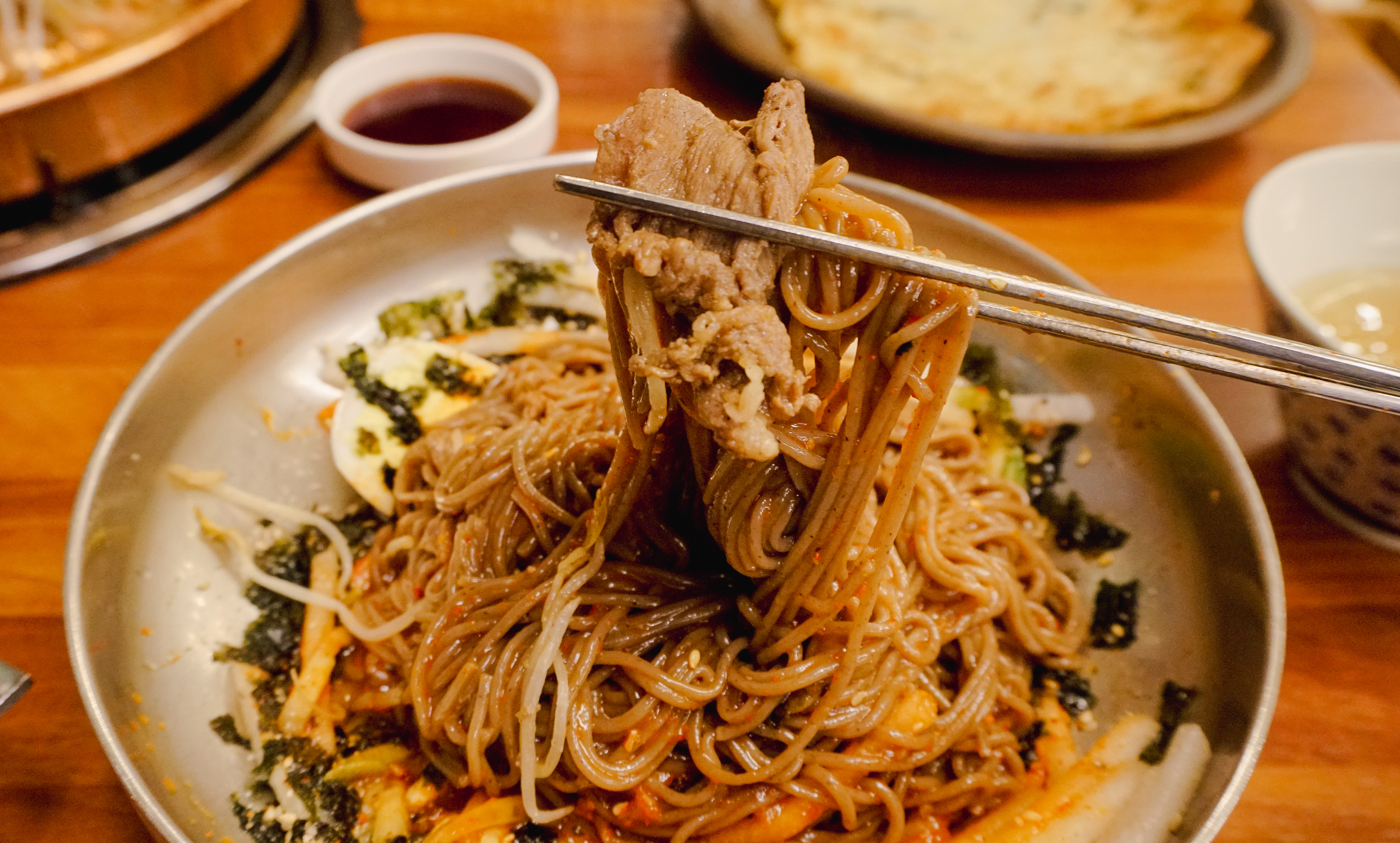 막국수를 주문하면 불고기전골을 서비스로 내어주는 듯 오해할 수 있는 메뉴가 있는 이천막국수. 막국수 가격에 3,000원을 추가해야 먹는 메뉴이고요. 부침개는 진짜 서비스로 마음껏 부쳐먹을 수 있었습니다. 아무튼 정리하자면, 이천막국수는 불고기를 서비스로 주는 것은 아니지만, 3,000원에 추가 해서 먹을 수 있는 막국수집이었습니다.