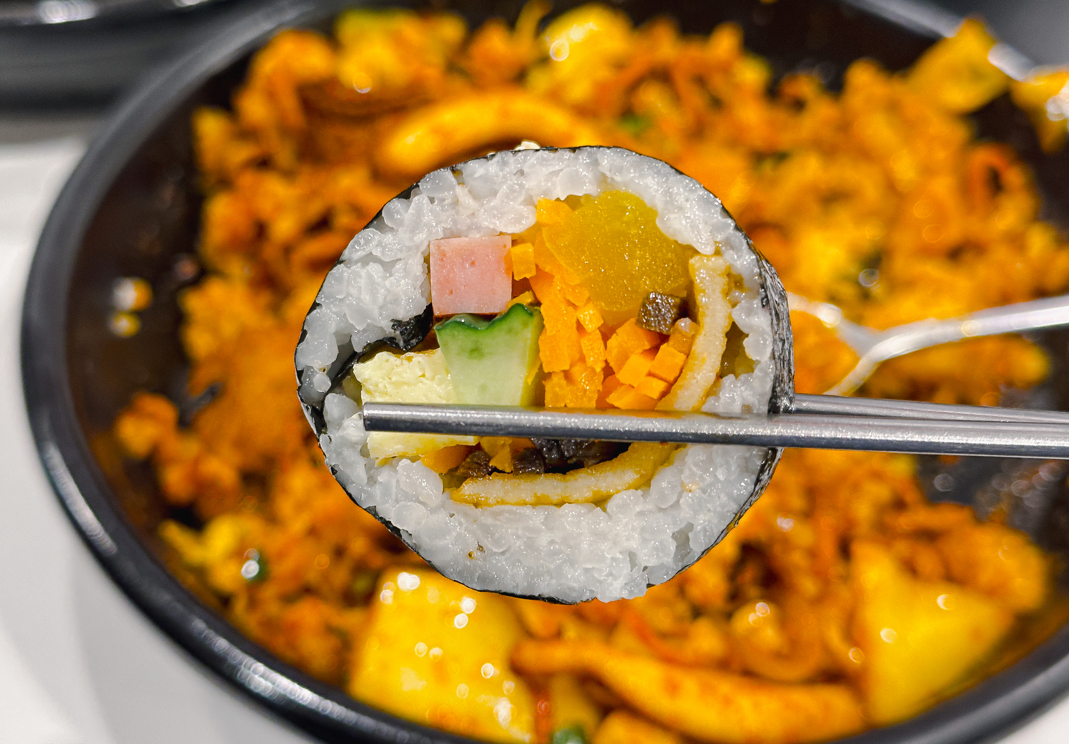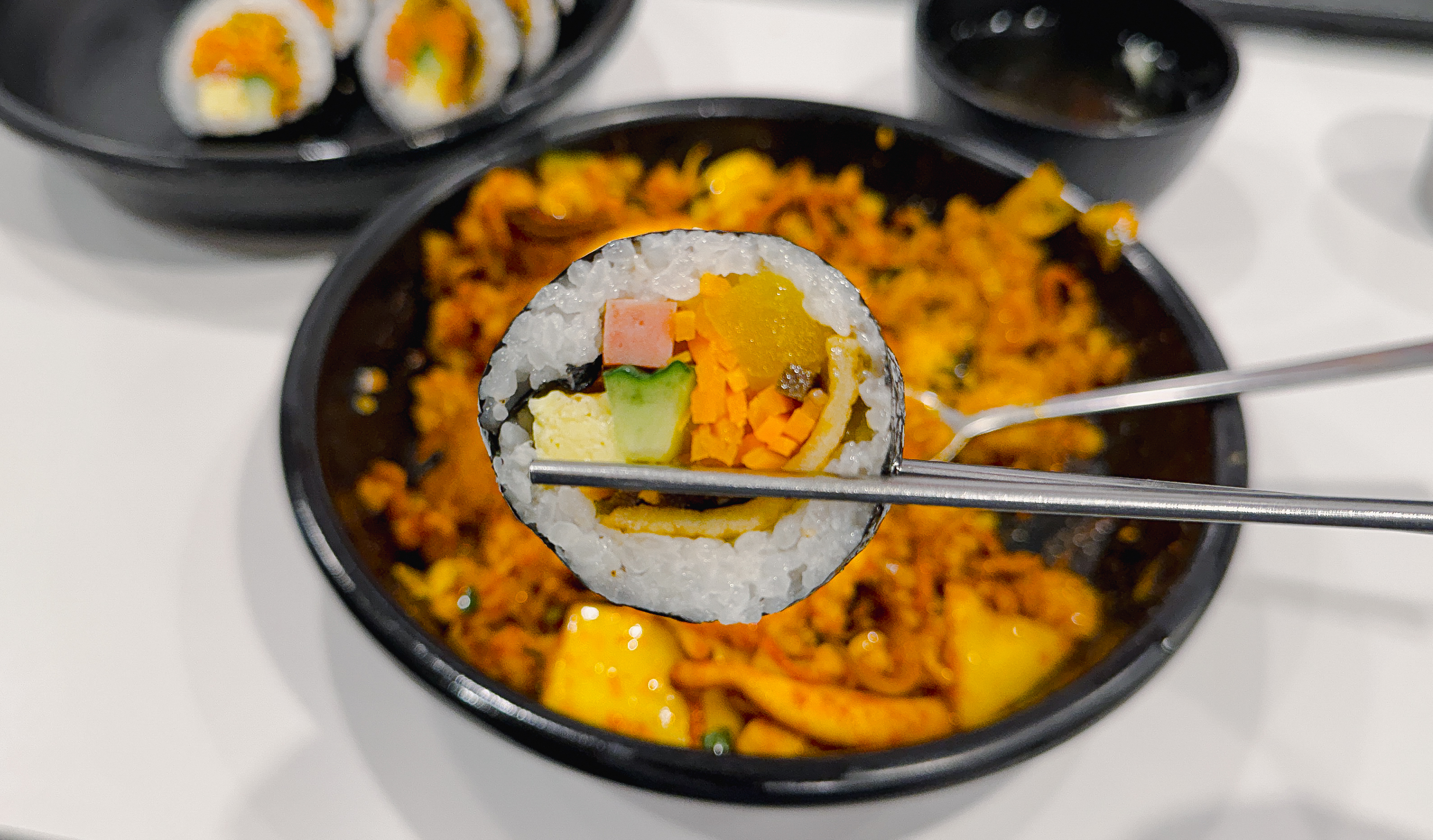 오삼덮밥만 먹기엔 좀 아쉬워서 김밥도 한 줄 곁들였습니다. 김밥은 오이, 당근, 어묵, 달걀, 당근, 단무지 등이 들어있었는데, 밥이 좀 퍽퍽한 느낌은 있었지만 그냥 먹을만했습니다. 싸다김밥의 '싸다'는 의미가 김밥을 '싸다'인지, 가격이 '싸다'는 건지는 모르겠지만, 제 기준에 가격이 저렴한 것 같지는 않네요.