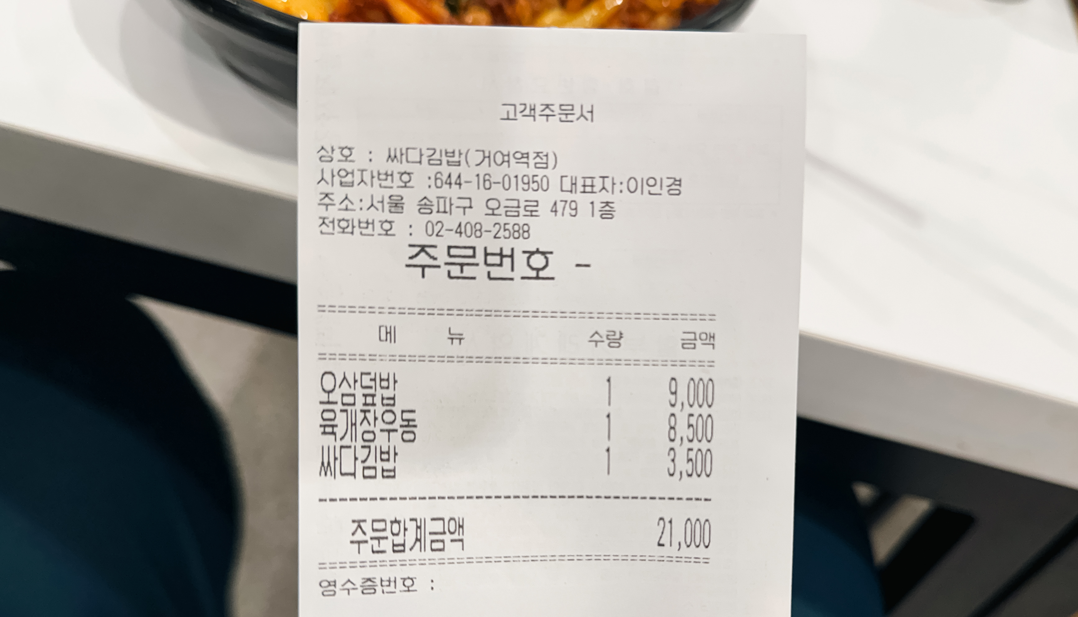 싸다김밥 거여역점은 서울 송파구 거여동 21-1, 1층에 위치한 가게였습니다. 이곳은 키오스크나 현금결제 시 매장 카운터에서 직접 결제할 수 있었습니다. 저희는 싸다김밥 거여역점에서 오삼덮밥과 육개장우동, 싸다김밥을 주문했습니다.