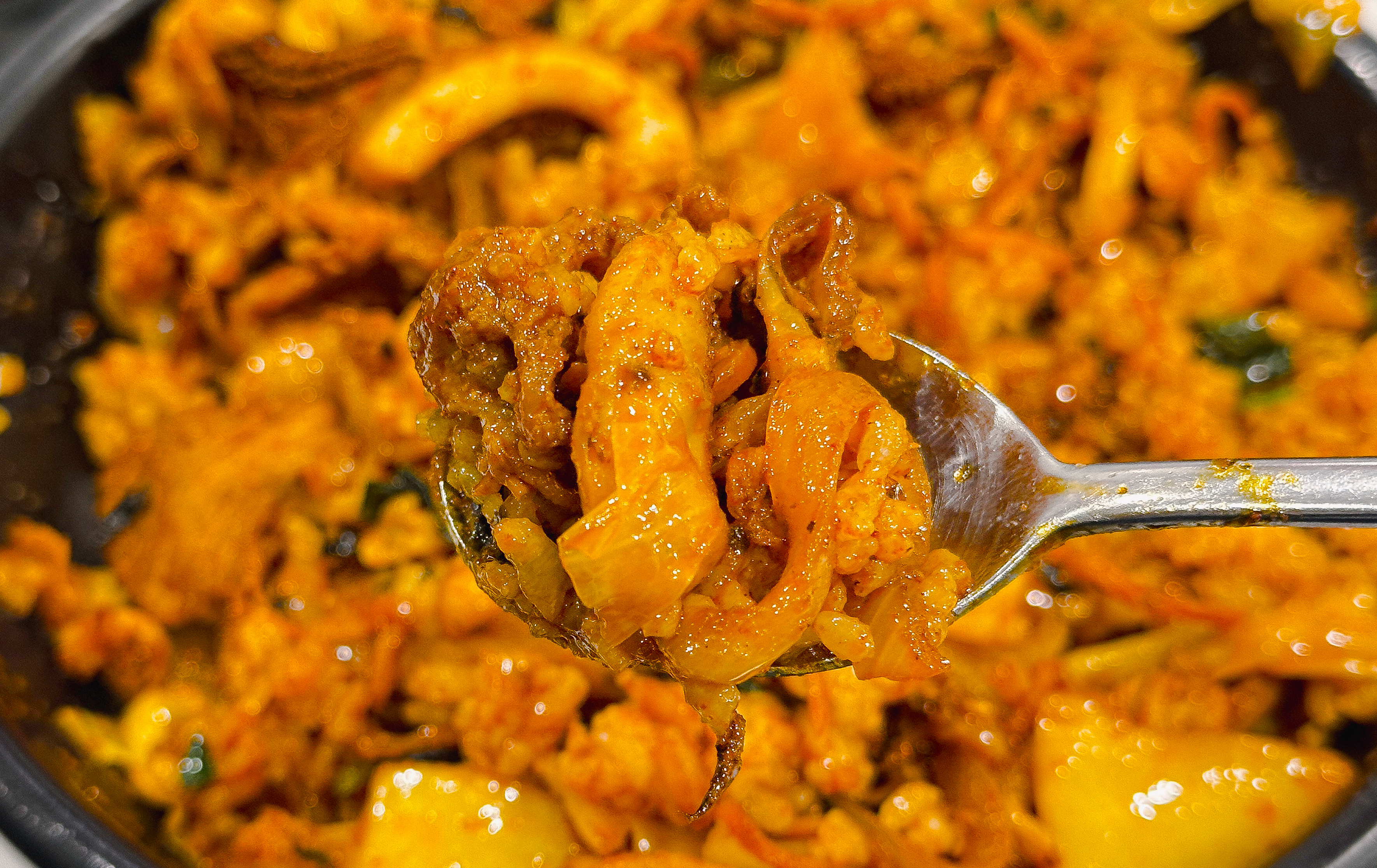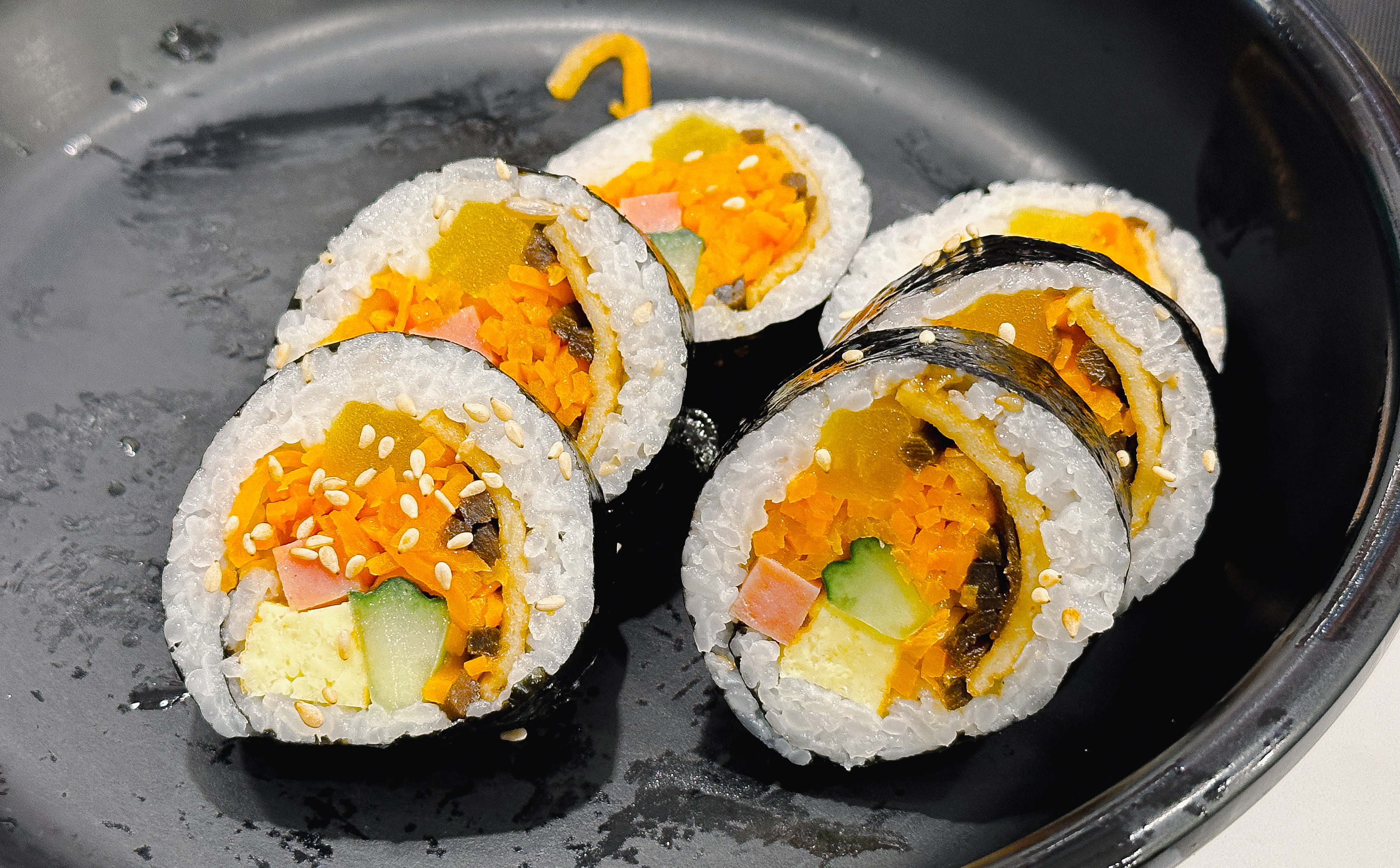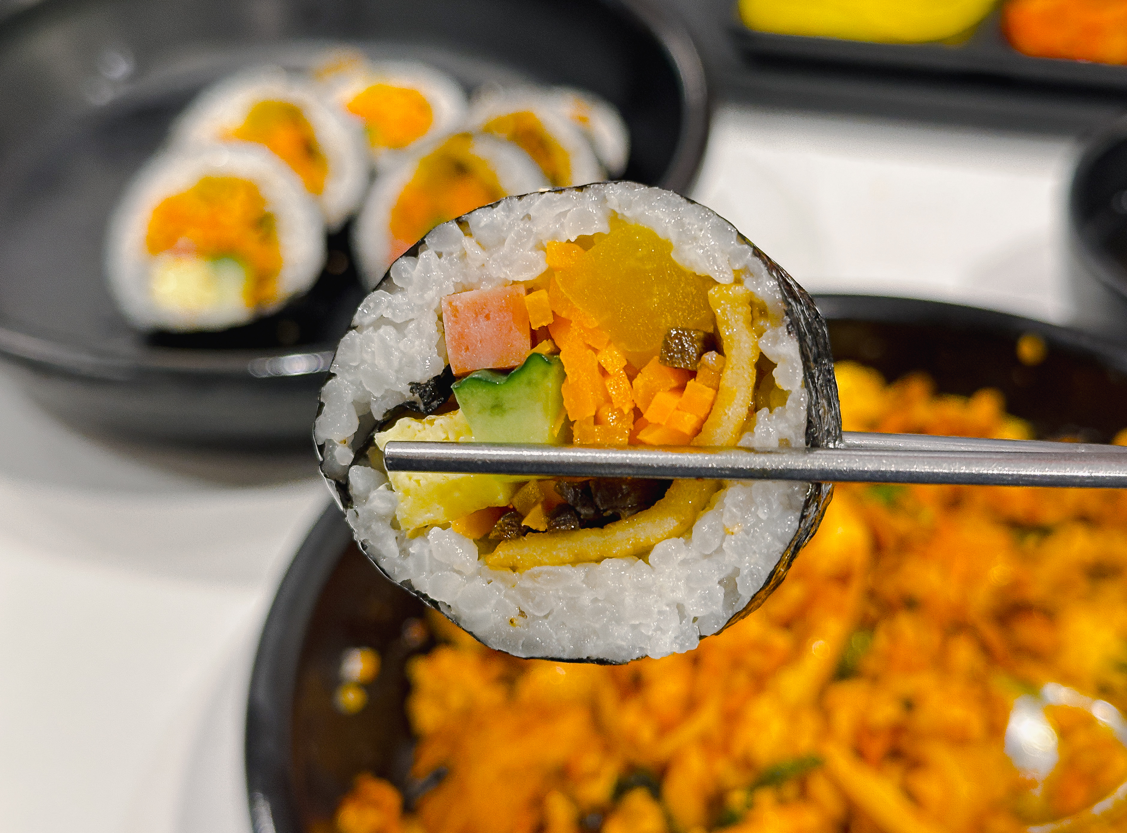 오삼덮밥만 먹기엔 좀 아쉬워서 김밥도 한 줄 곁들였습니다. 김밥은 오이, 당근, 어묵, 달걀, 당근, 단무지 등이 들어있었는데, 밥이 좀 퍽퍽한 느낌은 있었지만 그냥 먹을만했습니다. 싸다김밥의 '싸다'는 의미가 김밥을 '싸다'인지, 가격이 '싸다'는 건지는 모르겠지만, 제 기준에 가격이 저렴한 것 같지는 않네요.