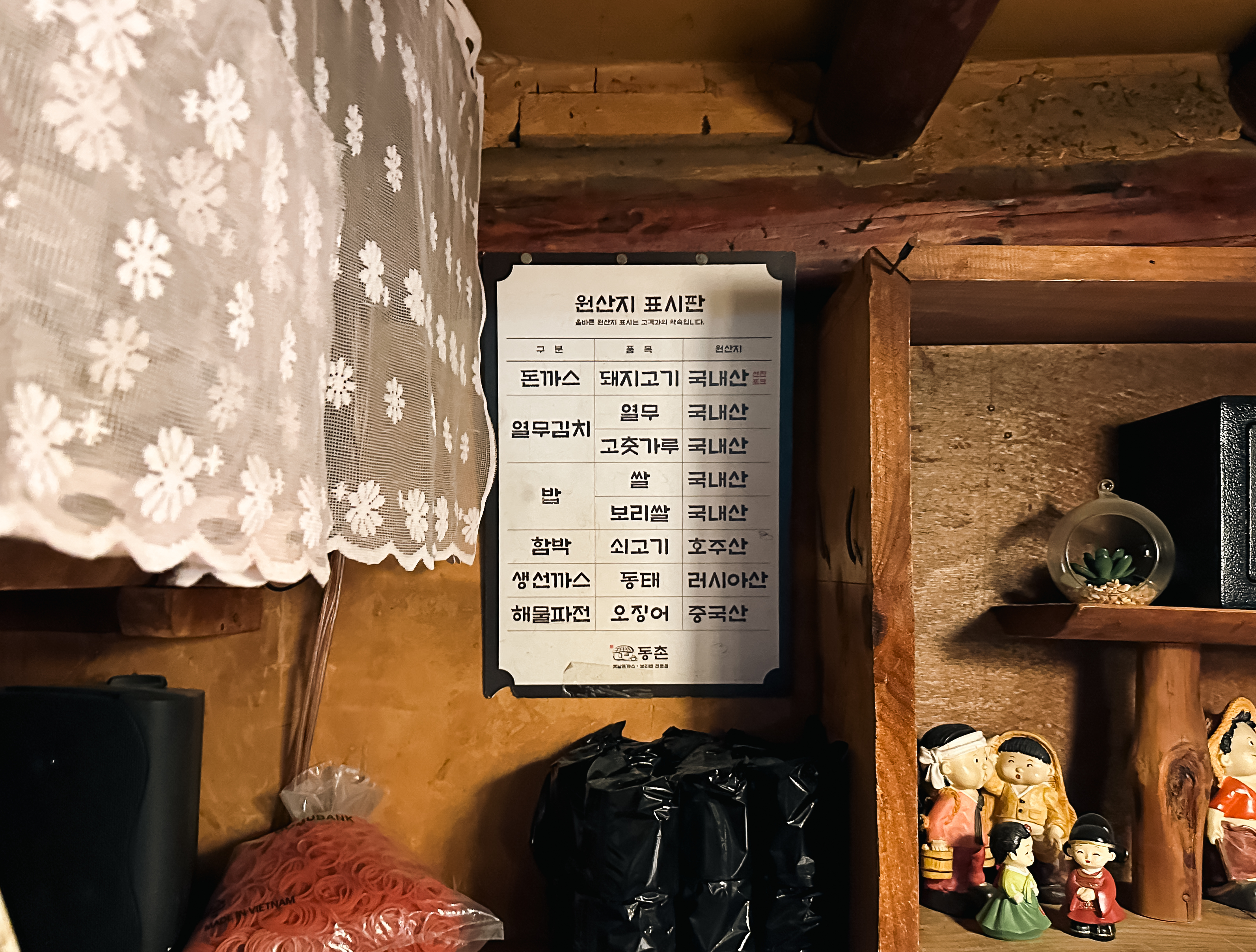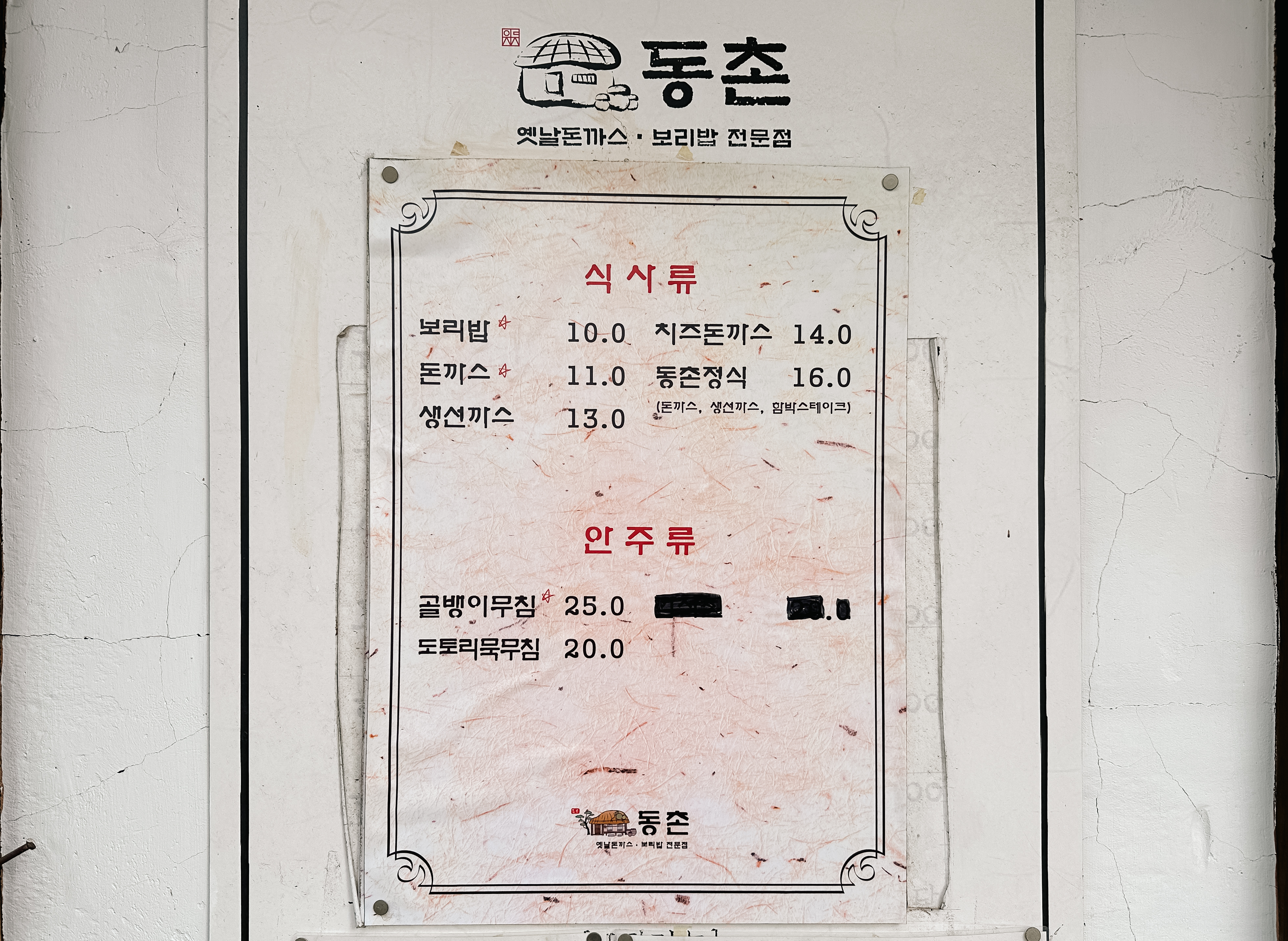 거여동 동촌은 보리밥, 돈까스, 치즈돈까스, 생선까스, 동촌정식, 골뱅이무침, 도토리묵무침 등이 있었고, 예전에는 서비스로 제공되었던 된장찌개와 공기밥 등도 요즘은 추가비용을 받고 있더라고요. 아무래도 요즘 손님이 많이 줄었던데 이런데 요인이 있지 않나 생각이 듭니다.