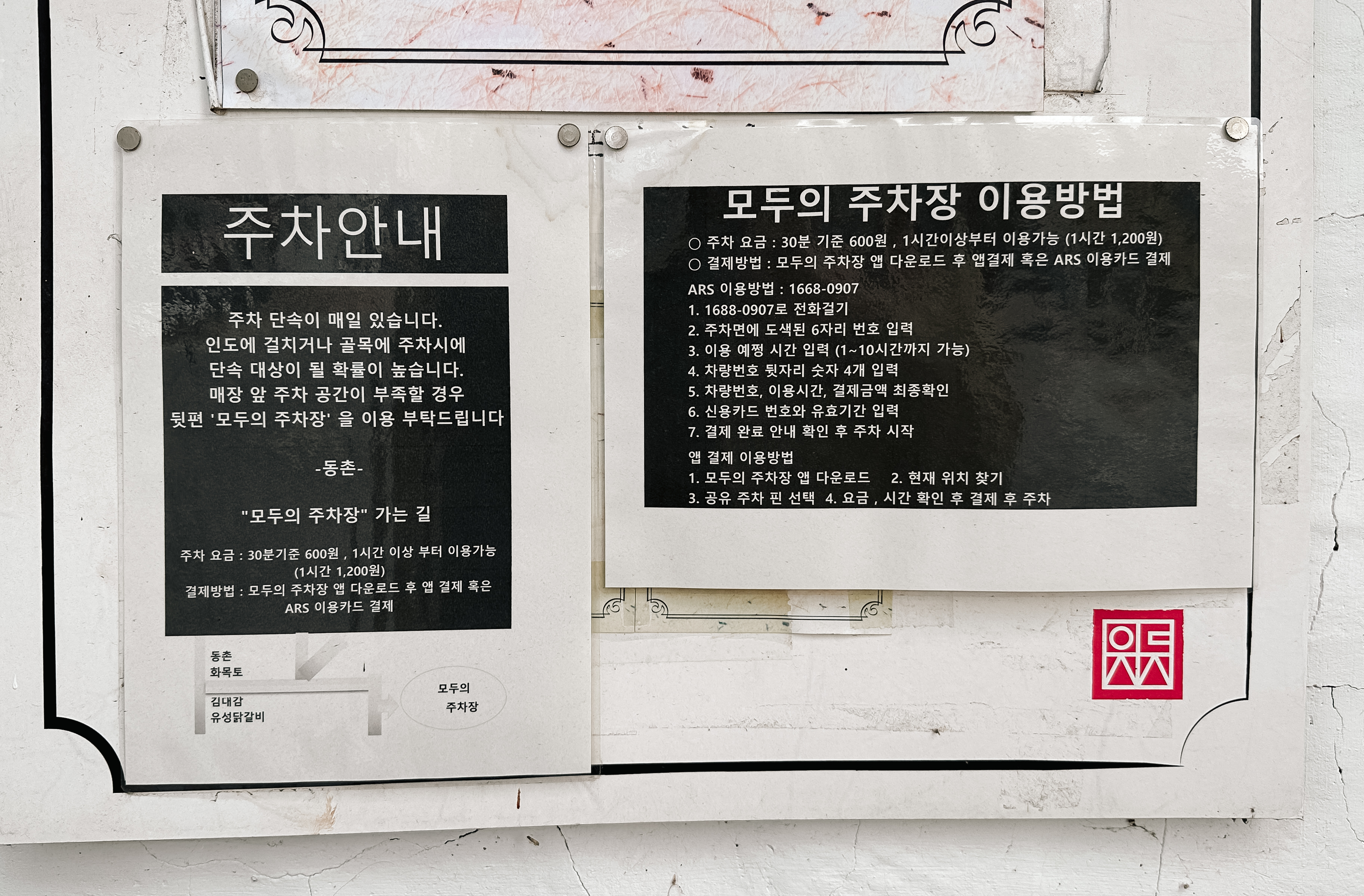 동촌보리밥돈까스 거여본점은 서울 송파구 거마로 22, 2층에 위치한 가게입니다. 가게 밖에 메뉴판이 있어서 메뉴를 살펴보니, 제가 주로 먹는 치즈돈까스의 경우 작년에 포스팅 한 이후로도 1,000원이 인상되어 14,000원이 되었더라고요. 최근에 가게 주위로 주차단속이 심하다고, 모두의 주차장을 이용해 달라는 안내문이 있었습니다. 저도 인근 주차장에 주차를 하고 식사하러 갔습니다.