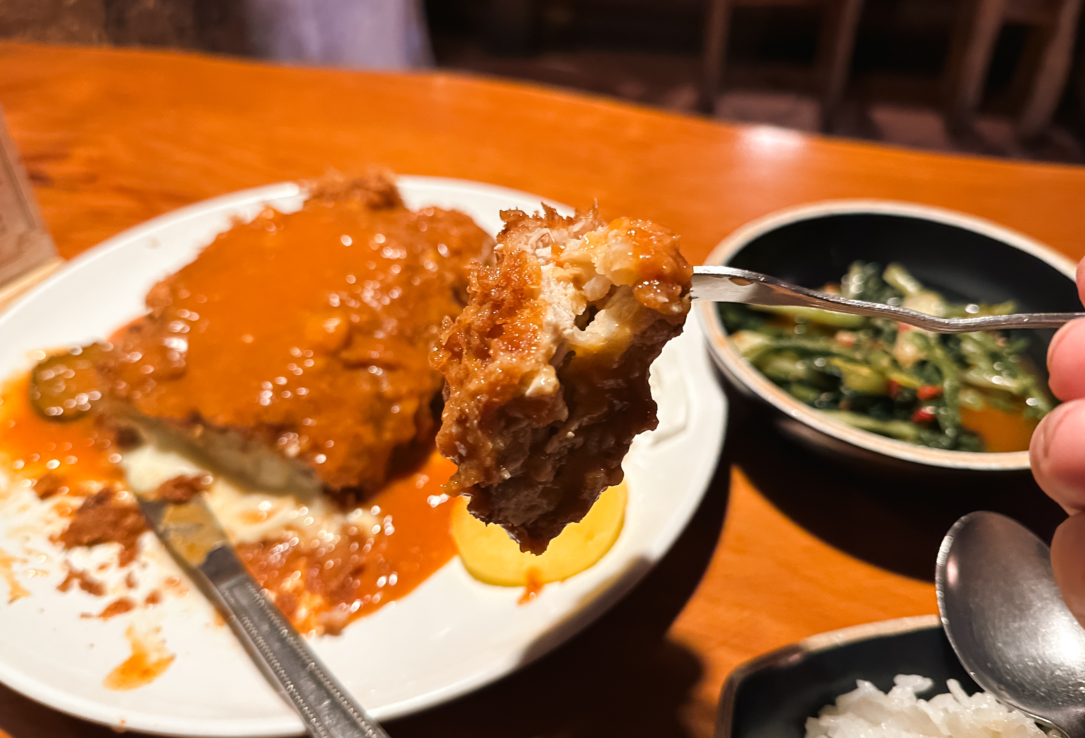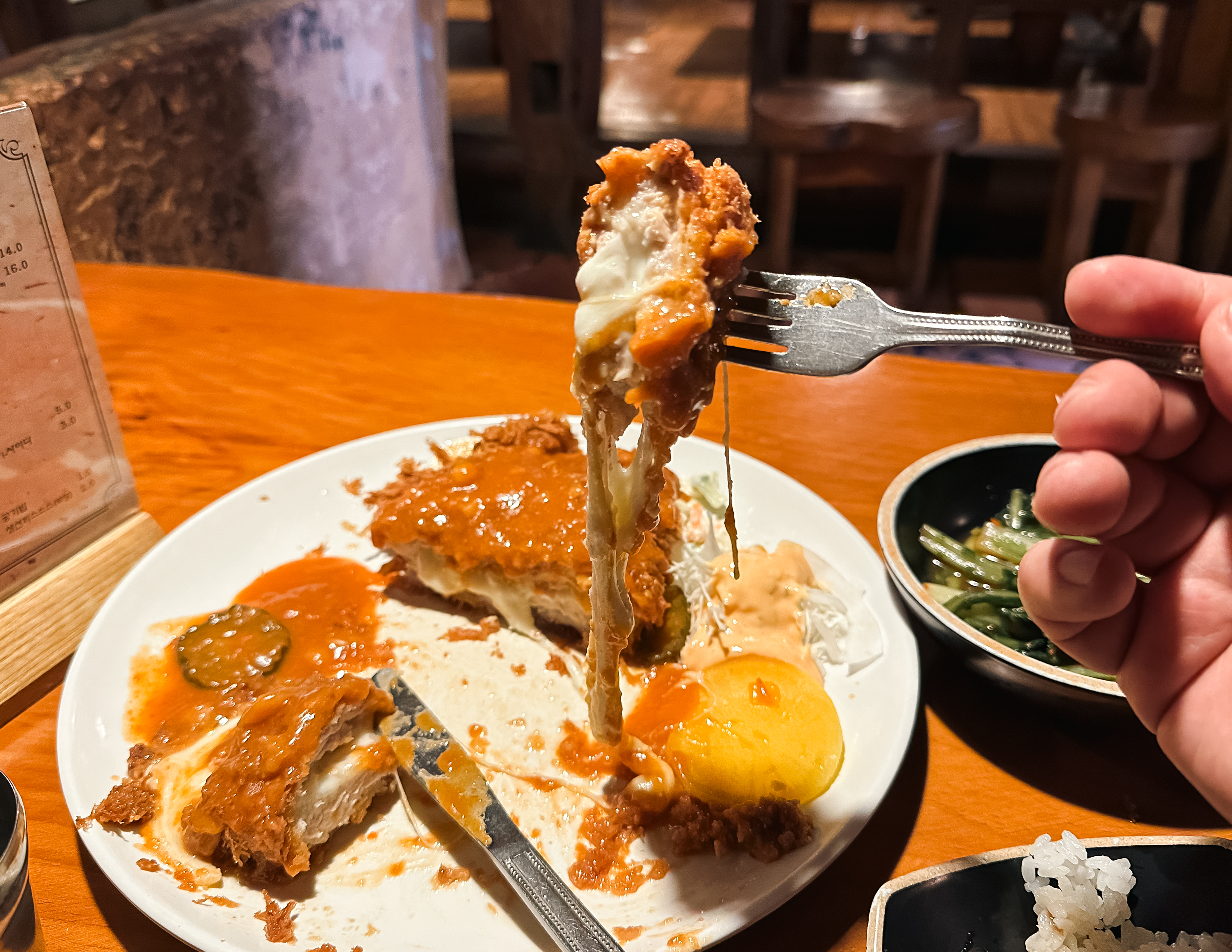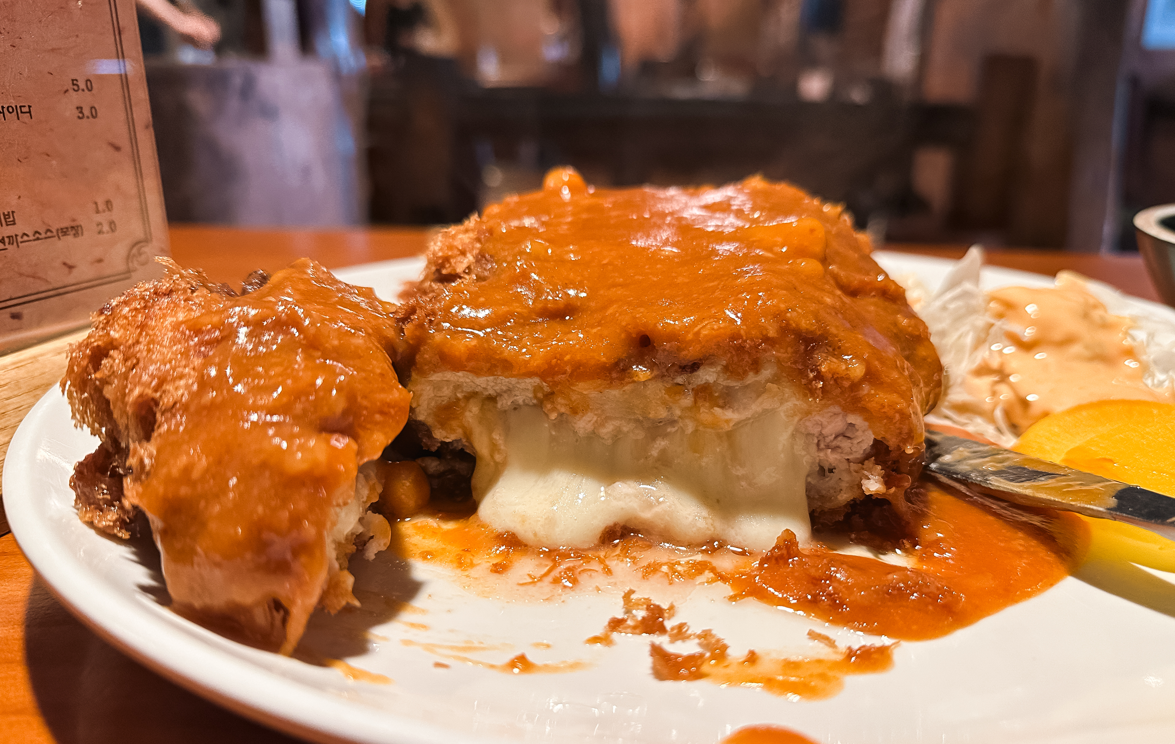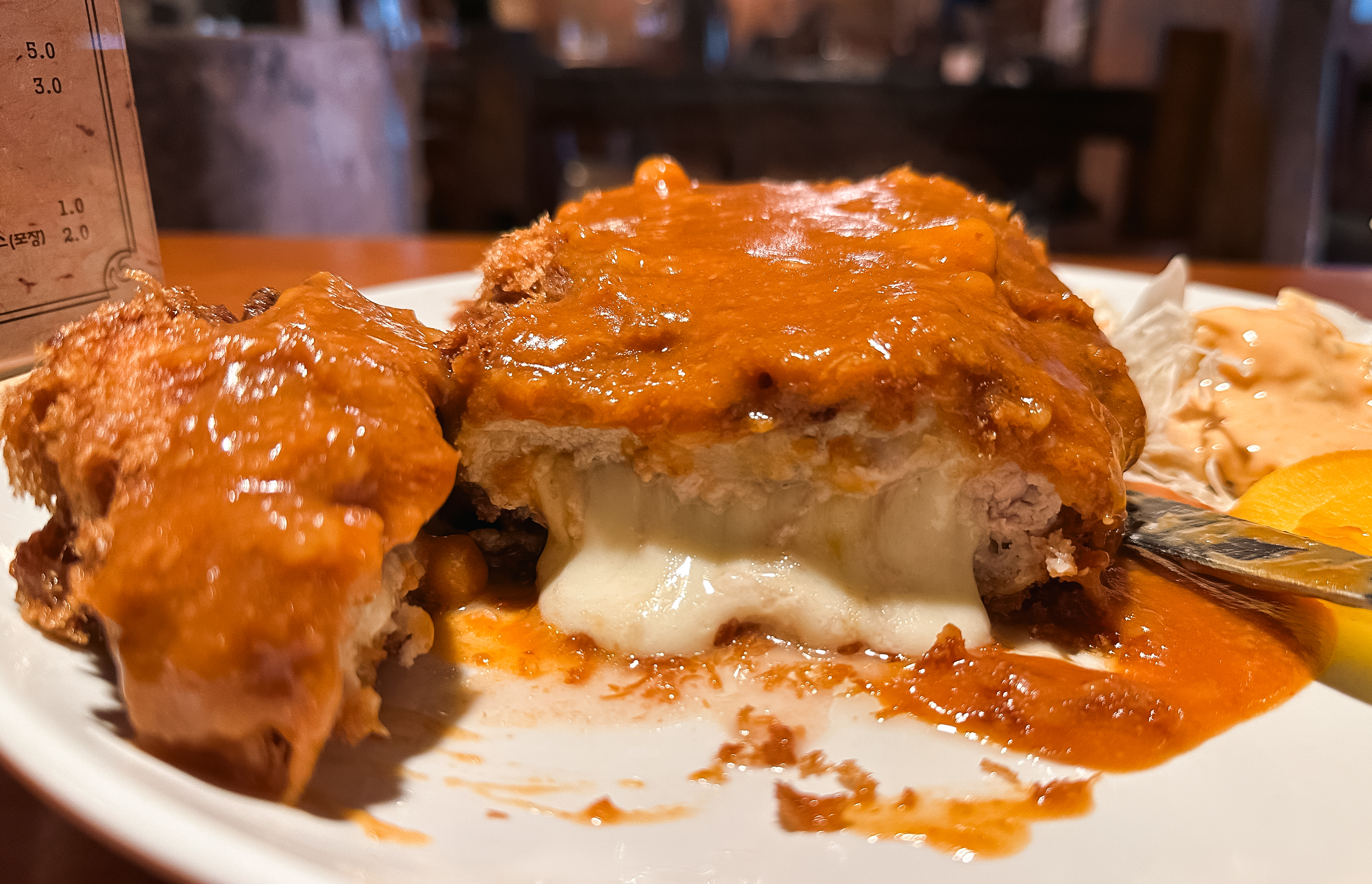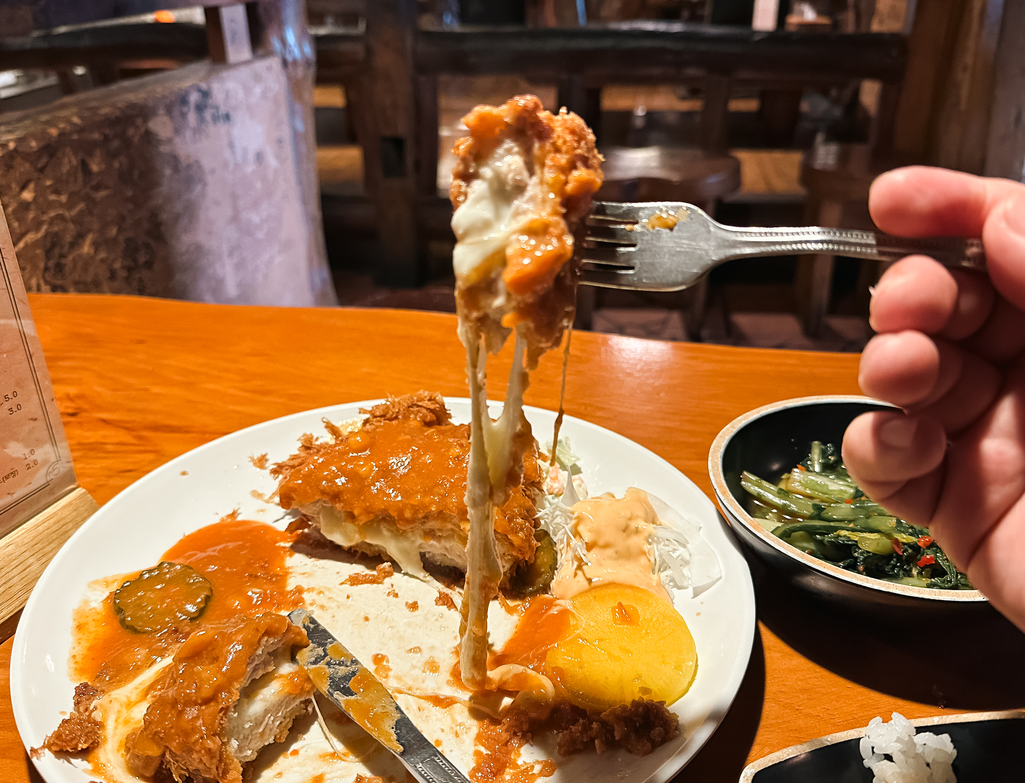 요즘 돈까스에 치즈가 조금만 흘러도 치즈폭포 돈까스라 불리는데, 이곳은 말 그대로 치즈가 흘러넘쳐 제대로 된 사진을 절대로 찍을 수가 없었습니다. 뭔가 사진은 지저분해 보이지만, 저만큼 많은 치즈에 돈까스를 같이 먹는데 안 맛있을 수가 있을까요? 물론 예전에 기억하던 맛은 아니었지만, 성인 남성인 제가 먹기에도 벅찰 정도로 양이 어마무시했습니다.