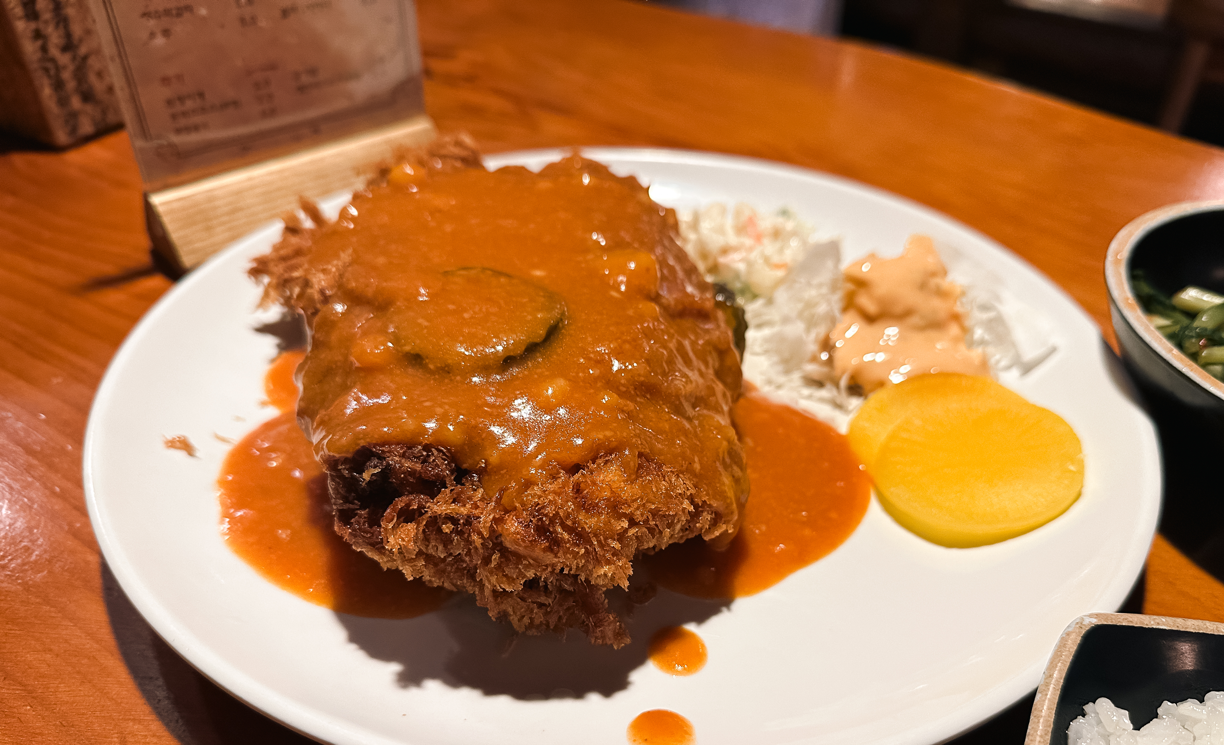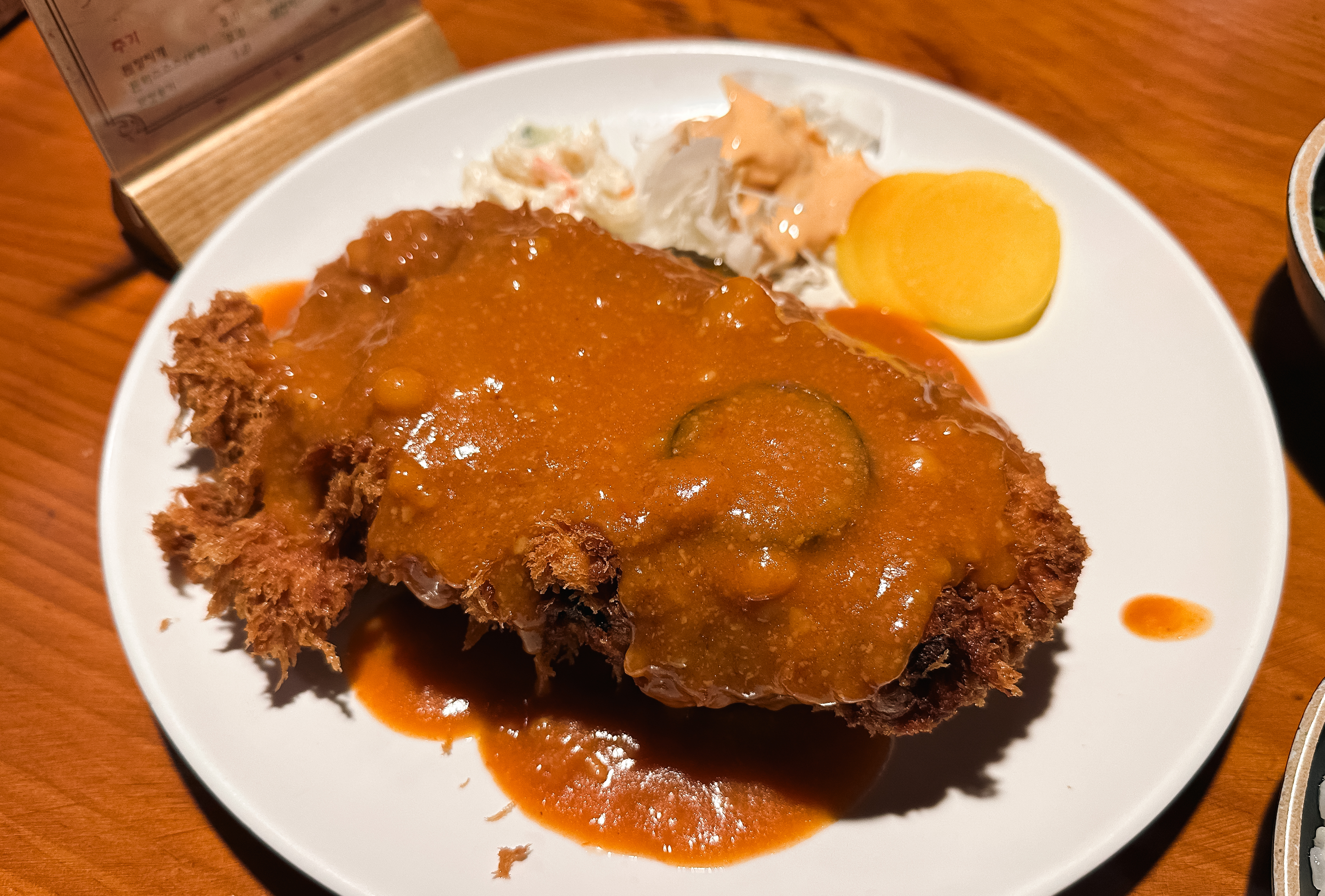 거여동 동촌 돈까스의 모습은 위와 같습니다. 꽤 두껍고 큰 돈까스는 이곳의 시그니처와 같은 메뉴입니다. 가격이 많이 오르긴했지만, 뭔가 하나만 먹어도 배가 든든할 정도로 어마어마한 크기가 이곳 돈까스의 특징이라 할 수 있죠. 소스는 기본적으로 부어 나오는데, 요구하면 따로도 제공되고 있습니다.