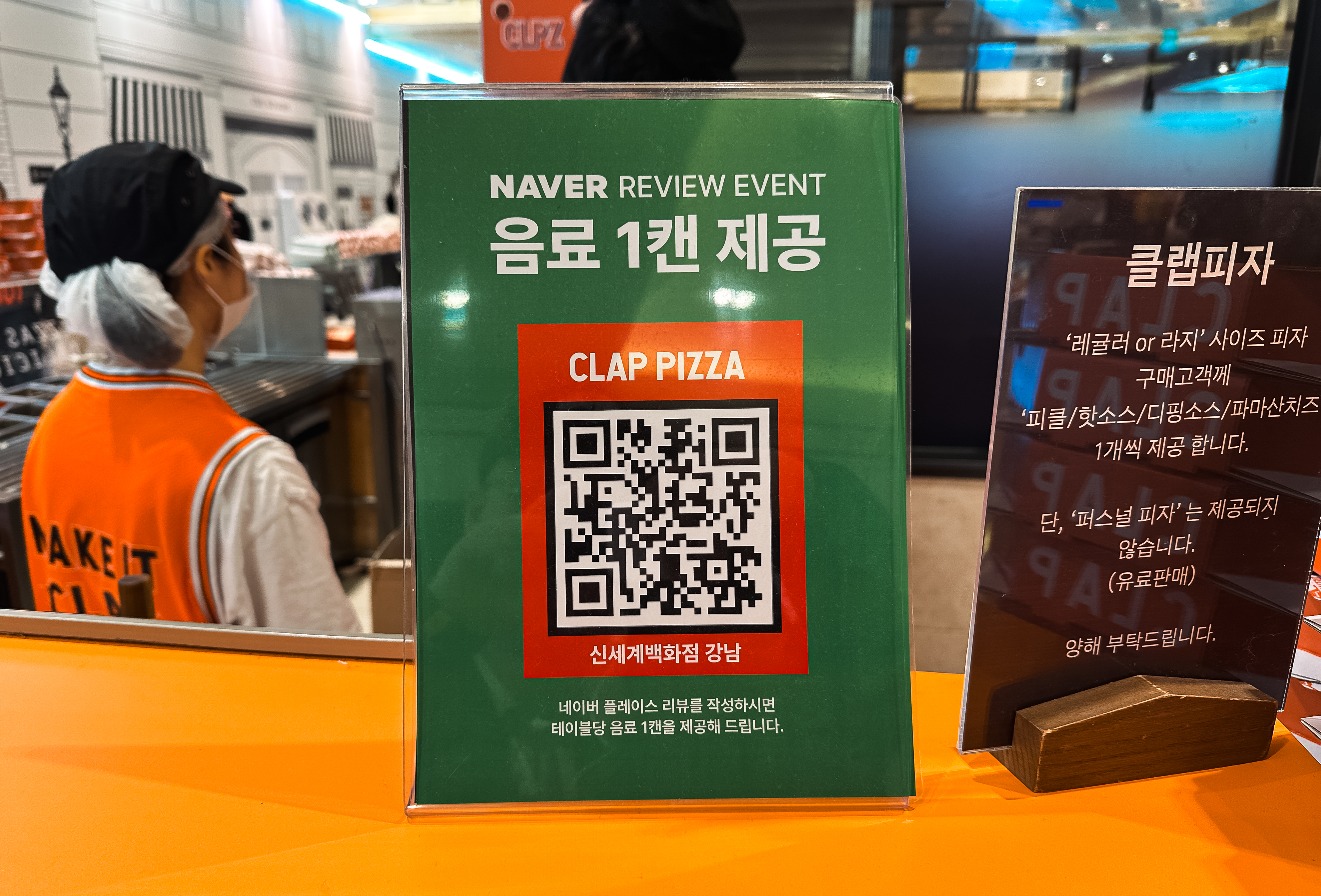 클랩피자는 서울 서초구 신반포로 176, B1층에 위치해 있었습니다. 이곳은 매장 내 식사할 수 있는 공간은 따로 없어서, 식사할 수 있는 곳을 따로 안내하고 있었고, 네이버 리뷰 이벤트를 통해 음료 1캔 제공하고 있었습니다.