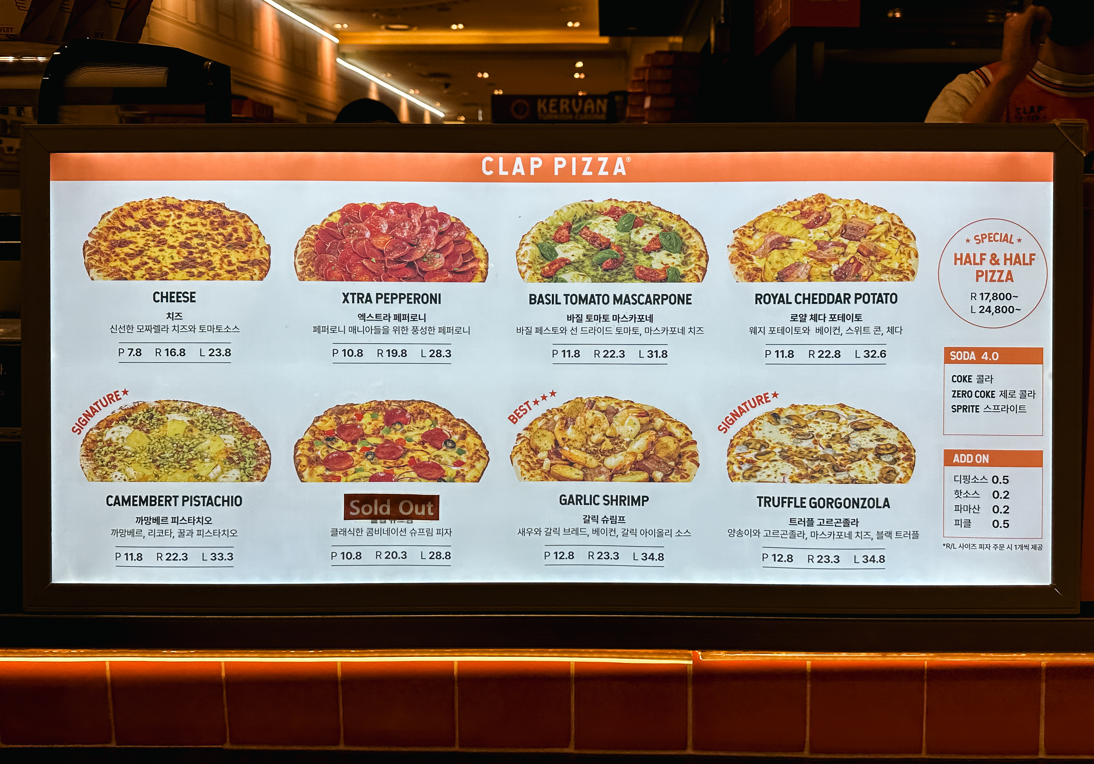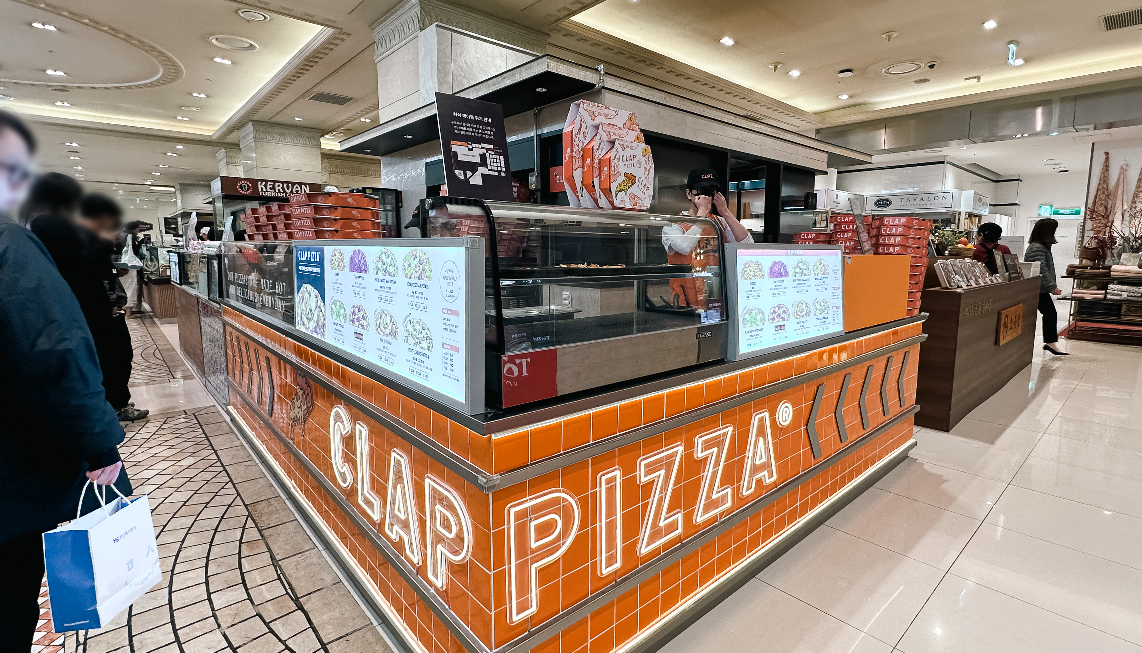 클랩피자는 고속터미널역 신세계백화점 강남점에 위치해 있었으며, 가성비 좋은 피자를 판매하고 있었습니다. 마침 제가 일하고 있는 살데리소(Sal De Riso) 팝업스토어 근처에 있어서, 피자를 포장하여 점심으로 간단하게 먹었습니다.