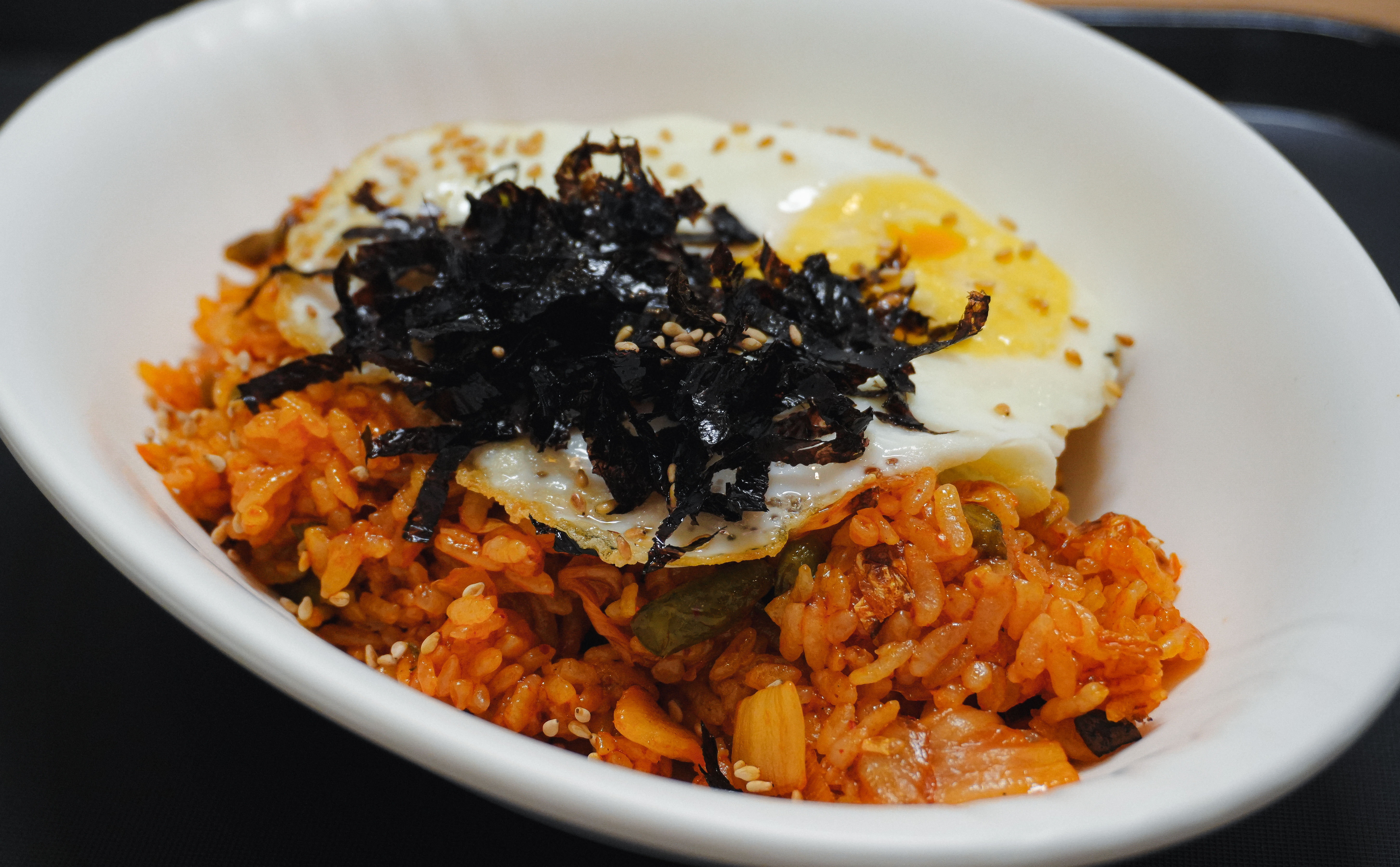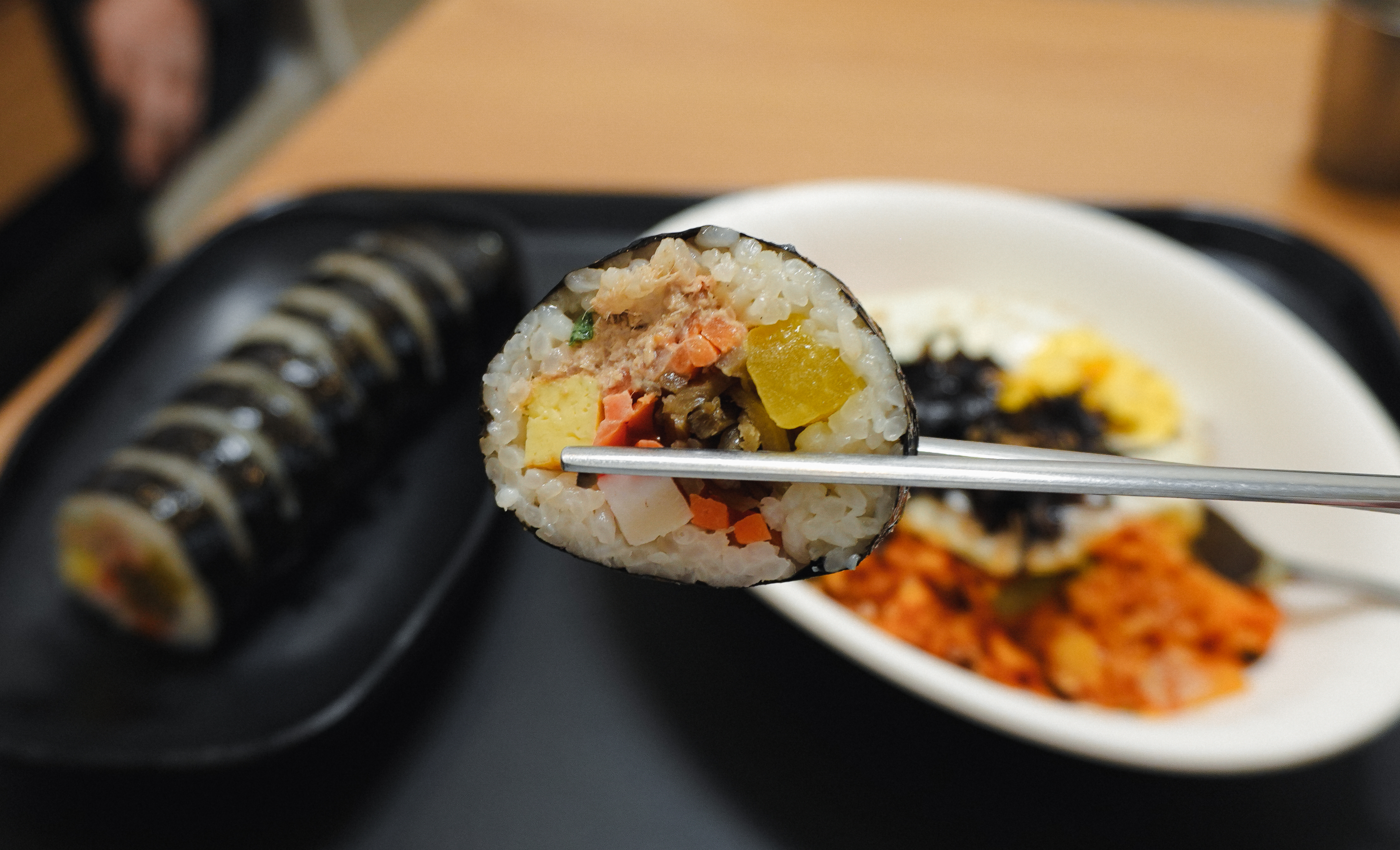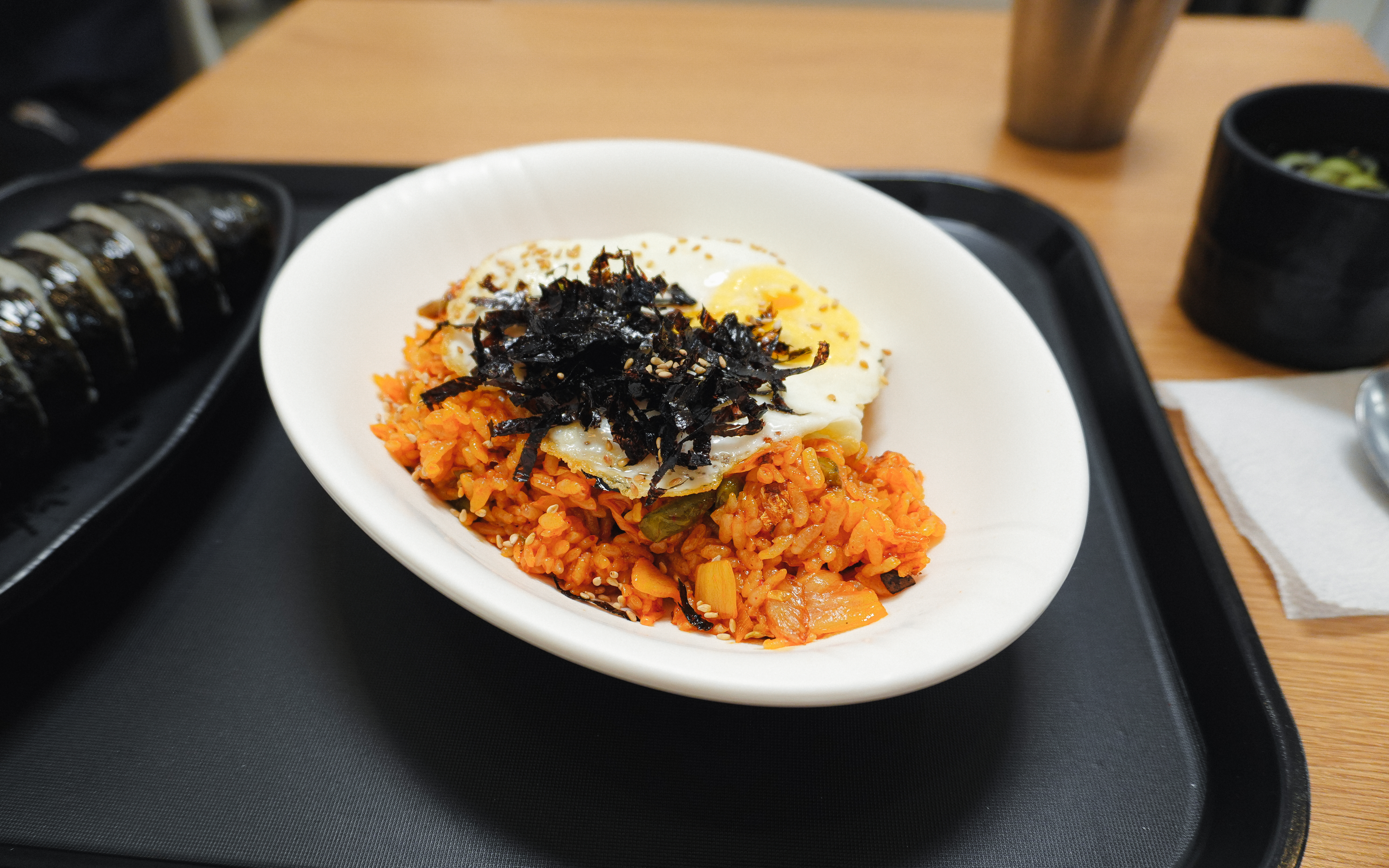 주문한 김치볶음밥과 참치김밥이 나왔습니다. 언니야김밥은 분식집이라 주문한 메뉴를 직접 들고 와야 하나 싶었는데, 이곳은 자리까지 메뉴를 직접 가져다주고 계셨고, 김치, 단무지, 장국 같은 부가적인 반찬만 직접 가져와 먹을 수 있었습니다.