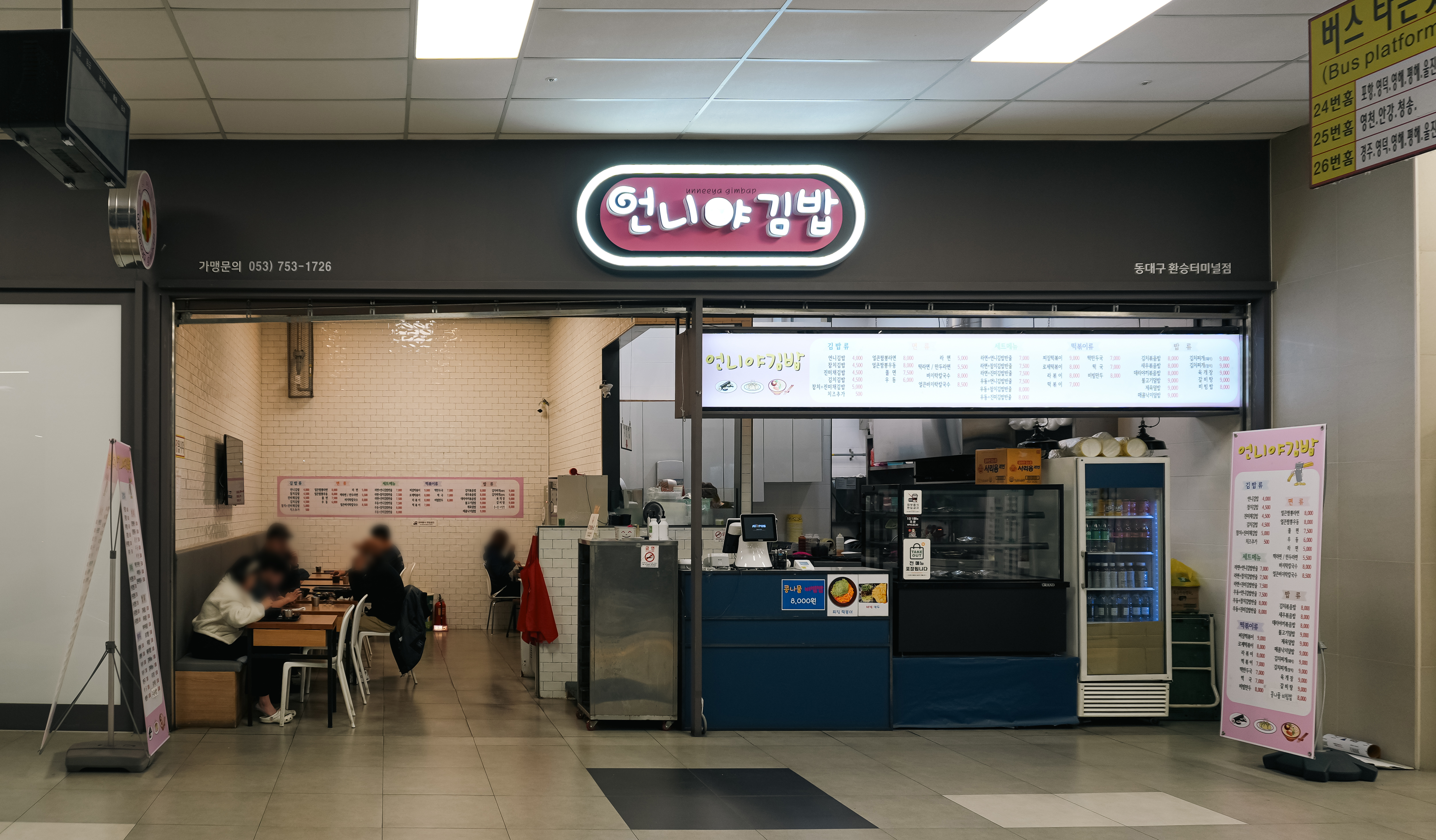 언니야김밥은 대구 동구 동부로 149, 4층 6호에 위치해 있었습니다. 이곳은 언니야김밥 동대구 환승터미널점으로 N사 포털에 검색되는 곳 3군데 중 하나였습니다. 이곳은 터미널 이용손님을 비롯해 기사님들 신세계백화점 점원들도 방문하여 간단히 끼니를 때우고 있었습니다.