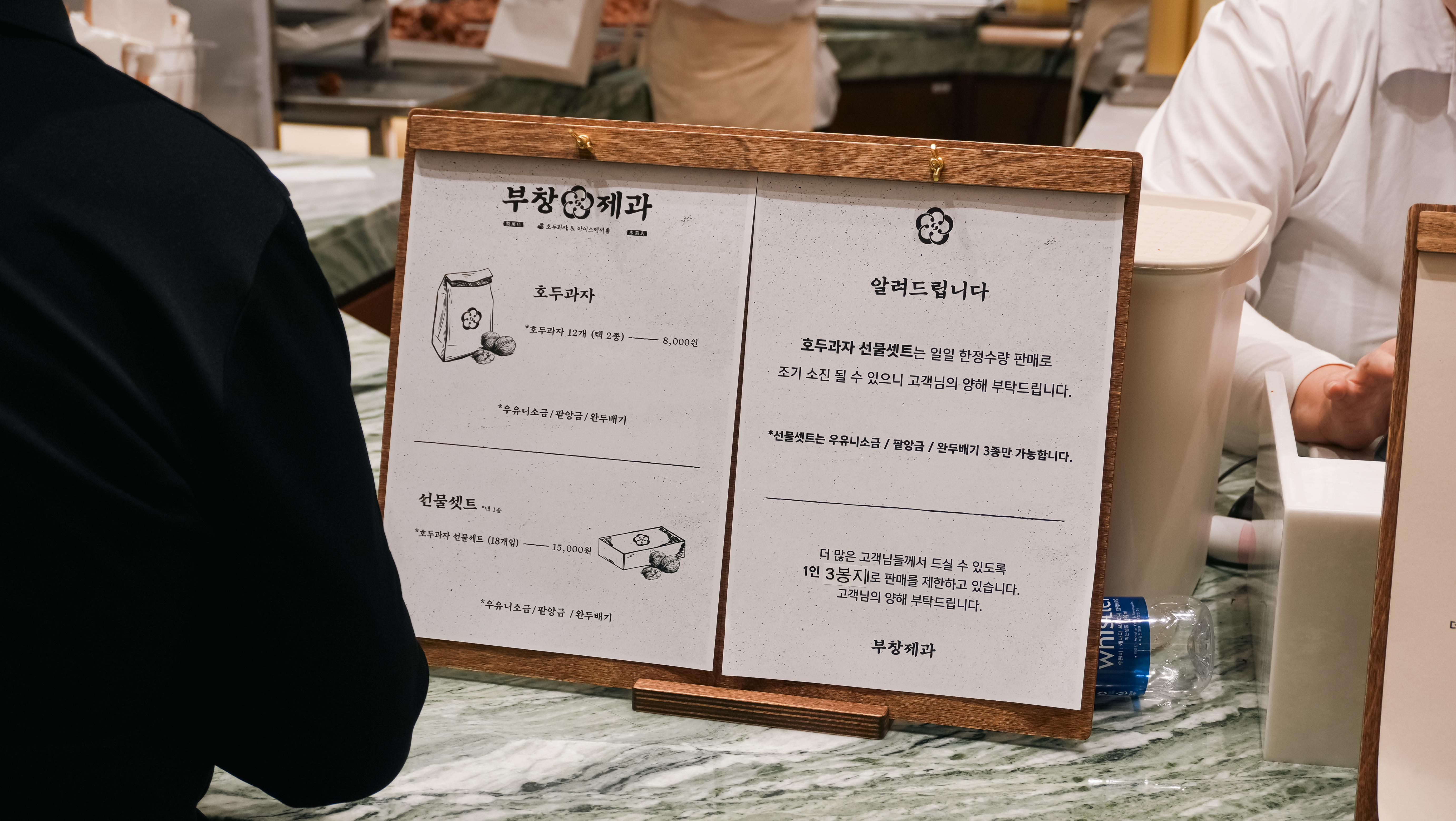 부창제과의 메뉴는 크게 우유니소금, 팥앙금, 완두배기 호두과자와 센베이아이스께끼, 1963부창라떼가 있다고 합니다. 이곳은 대기줄이 있어서 그런지 호두과자를 포장하러 온 손님들에 1인 3 봉지씩 구입을 제한하고 있었습니다. 호두과자 1 봉지는 8,000원에 판매 중이었습니다.