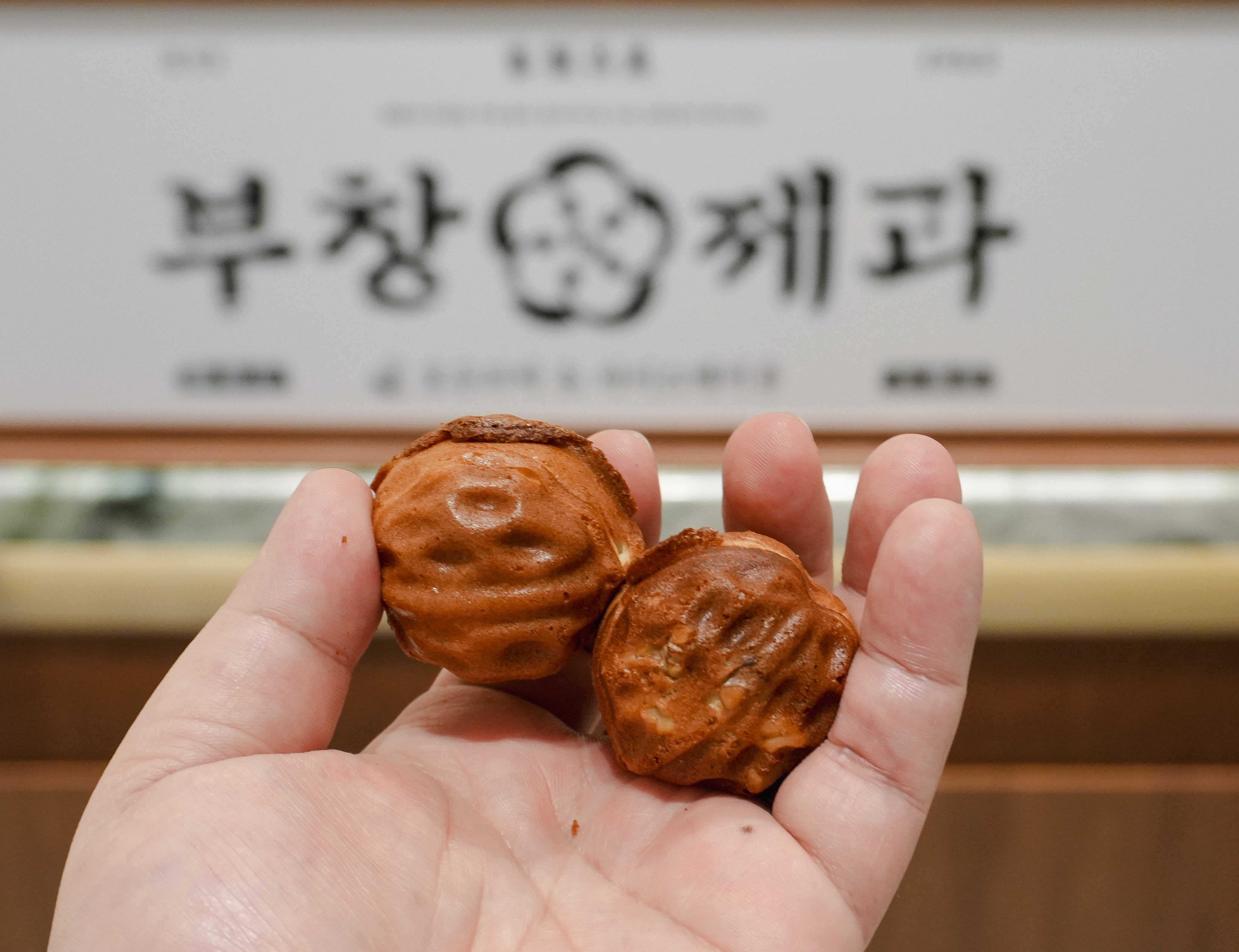 부창제과의 호두과자는 위와 같이 생겼습니다. 겉은 바삭하게 구워냈고, 속은 적당히 두께감이 있었는데 솔직히 제 입맛이 저렴해서 그런 건지 호두과자가 기대했던 것에 비해서 좀 퍽퍽하고 부드럽지 않더라고요. 차라리 고속도로에 파는 잣도 붙어있고 겉바속촉 호두과자가 더 맛있는 것 같았습니다. 아무래도 신생 브랜드보다는 국민간식인 호두과자를 수도 없이 많이 팔아온 고속도로의 휴게소가 더 잘 팔지 않을까 생각합니다.