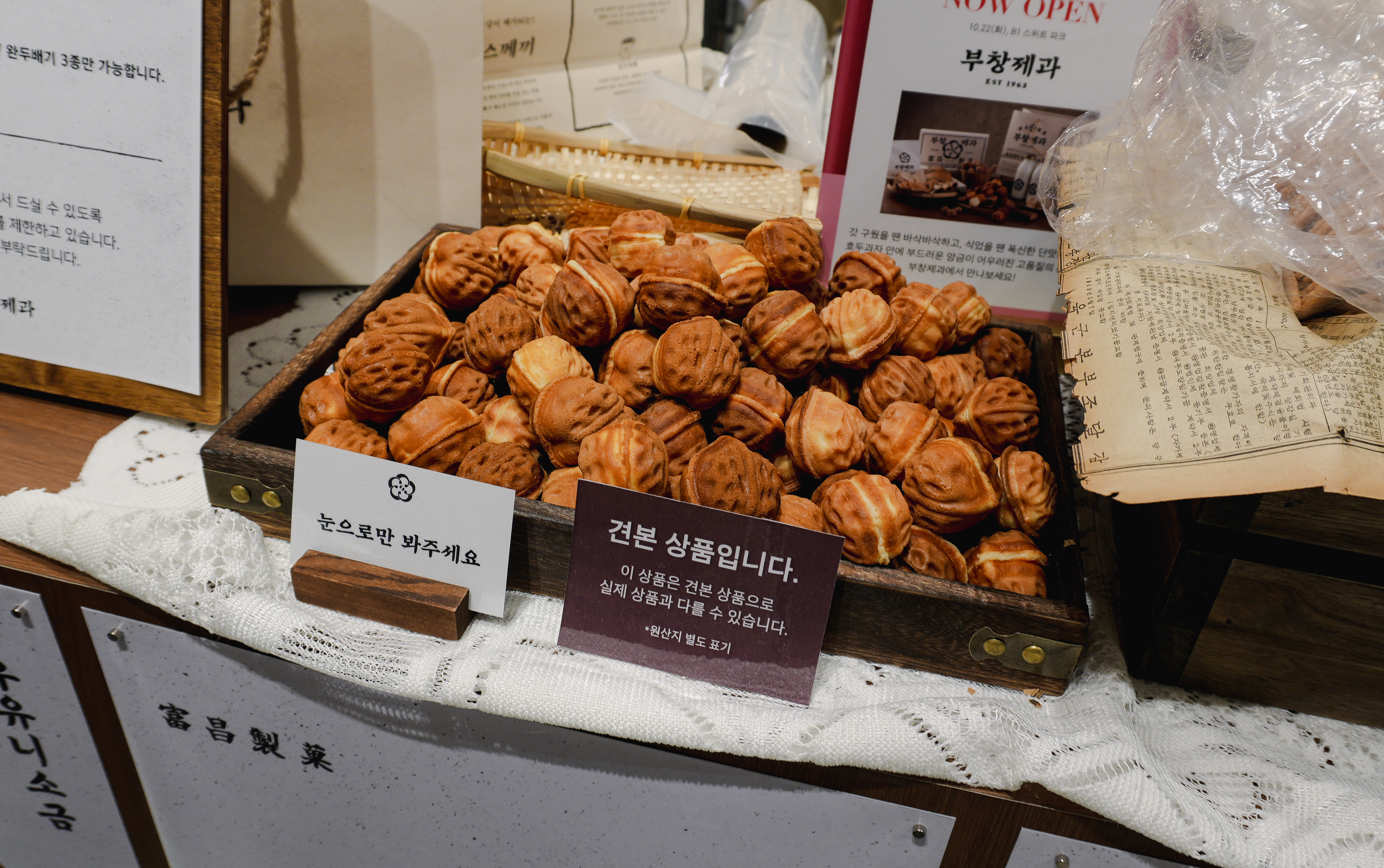 저는 사실 부창제과 호두과자를 구입하지는 않았고, 살데리소 팝업매장이 있던 저희 옆 매장에서 구입하셔서 일부를 나눠주셨습니다. 맛은 팥앙금, 완두배기맛이었는데 겉으로 보기에는 차이가 잘 느껴지지 않더라고요.