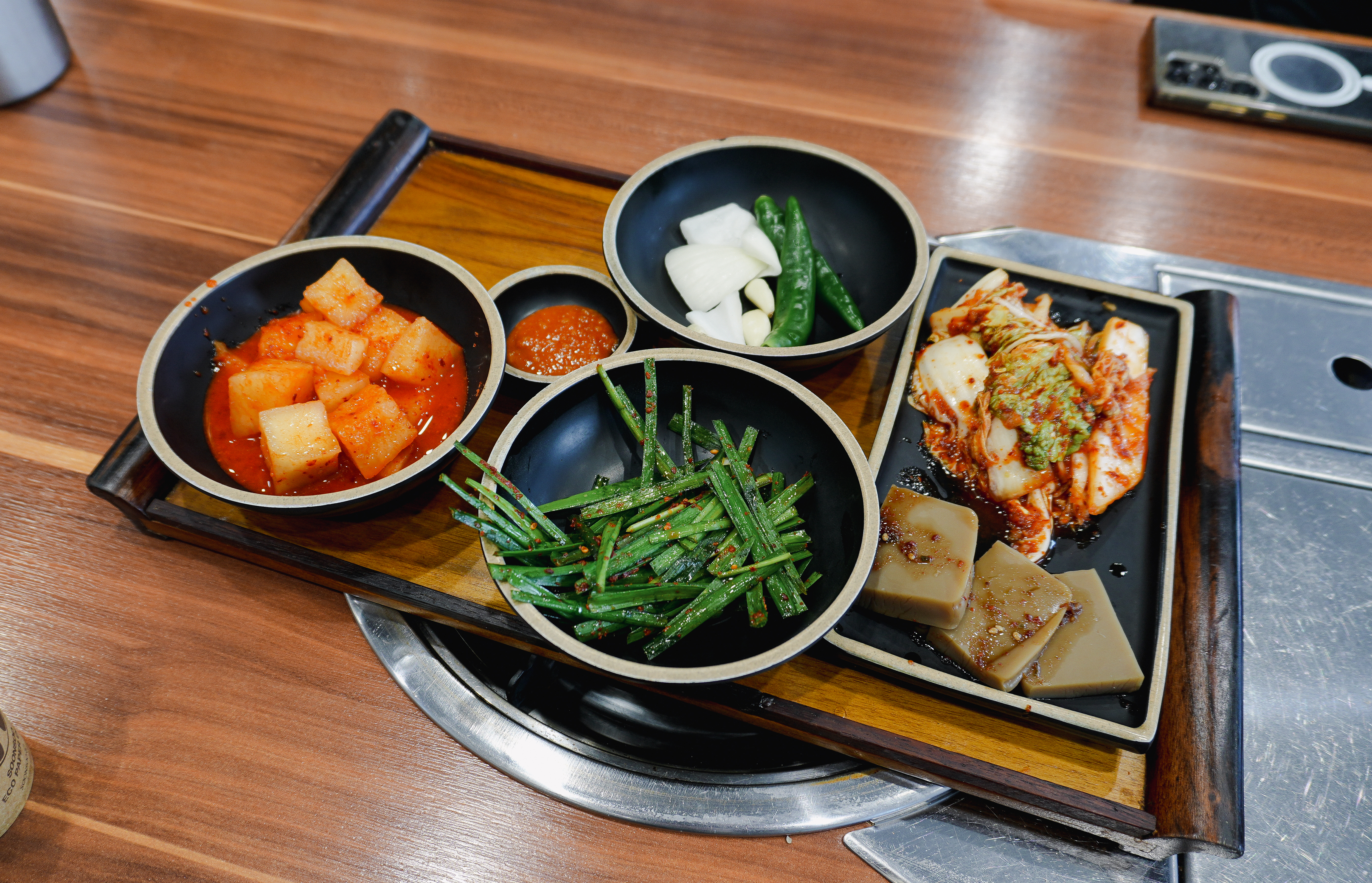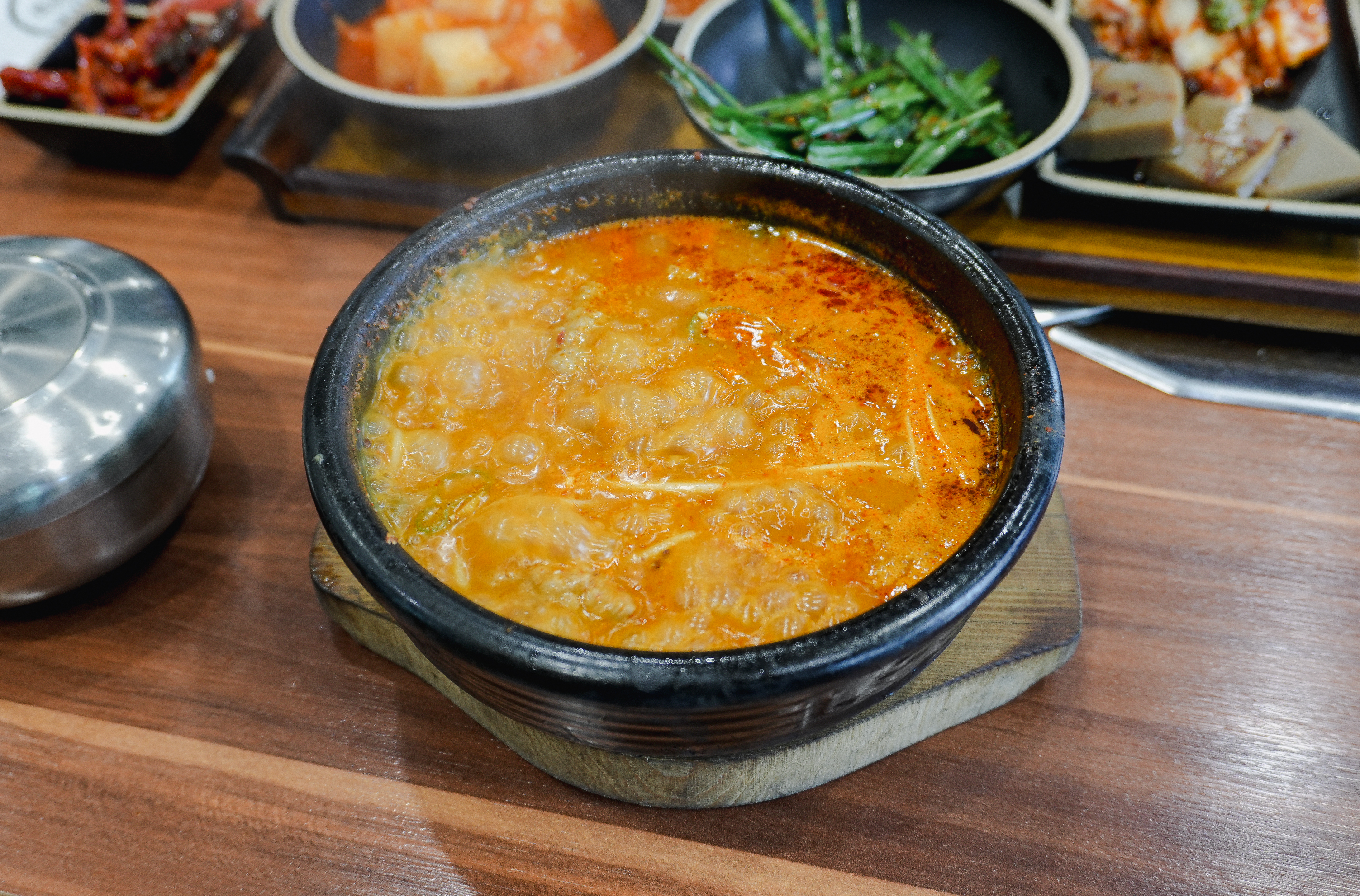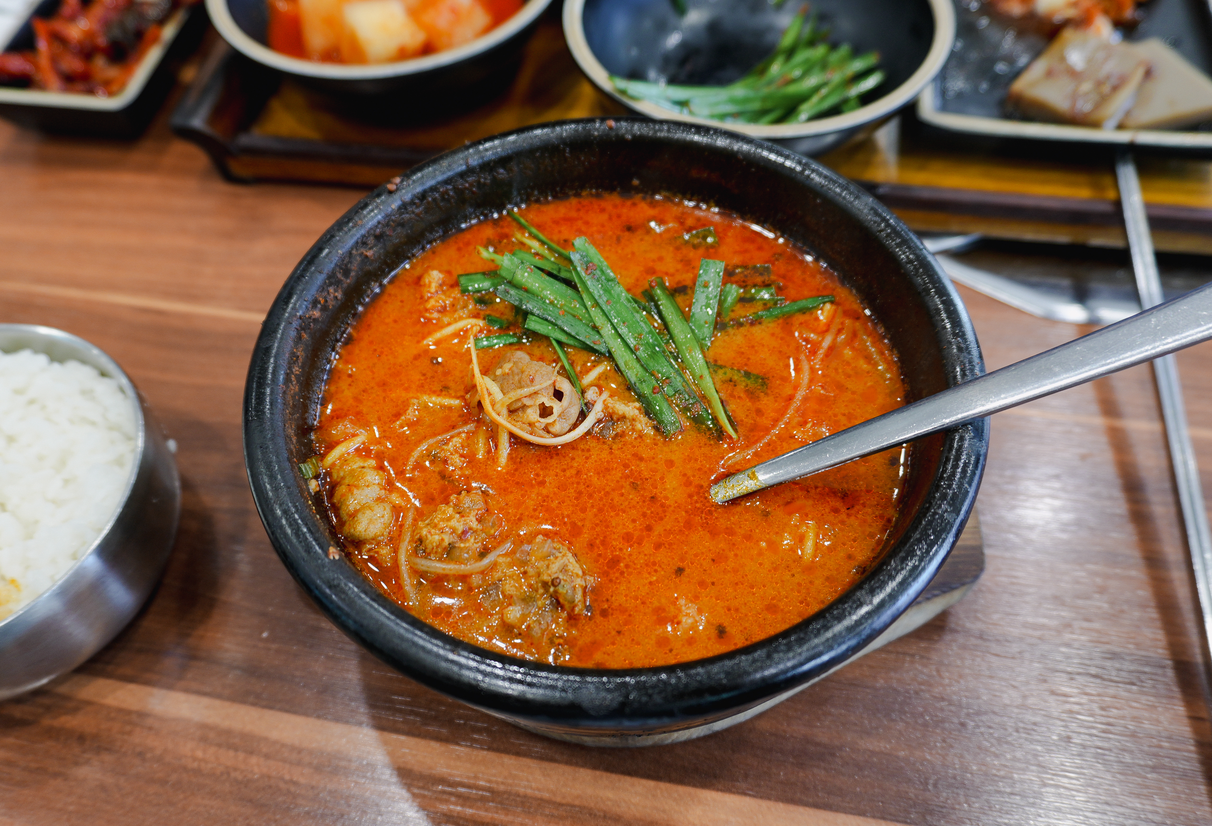 이곳은 얼큰한 순댓국이 메인 메뉴였는데, 생각보다 국물이 많이 맵지는 않았습니다. 그밖에 반찬은 깍두기와 양파, 배추김치, 묵이 나왔습니다. 부추무침도 함께 제공되었는데, 부추무침은 따로 순대국밥에 섞어서 먹으면 되었습니다.