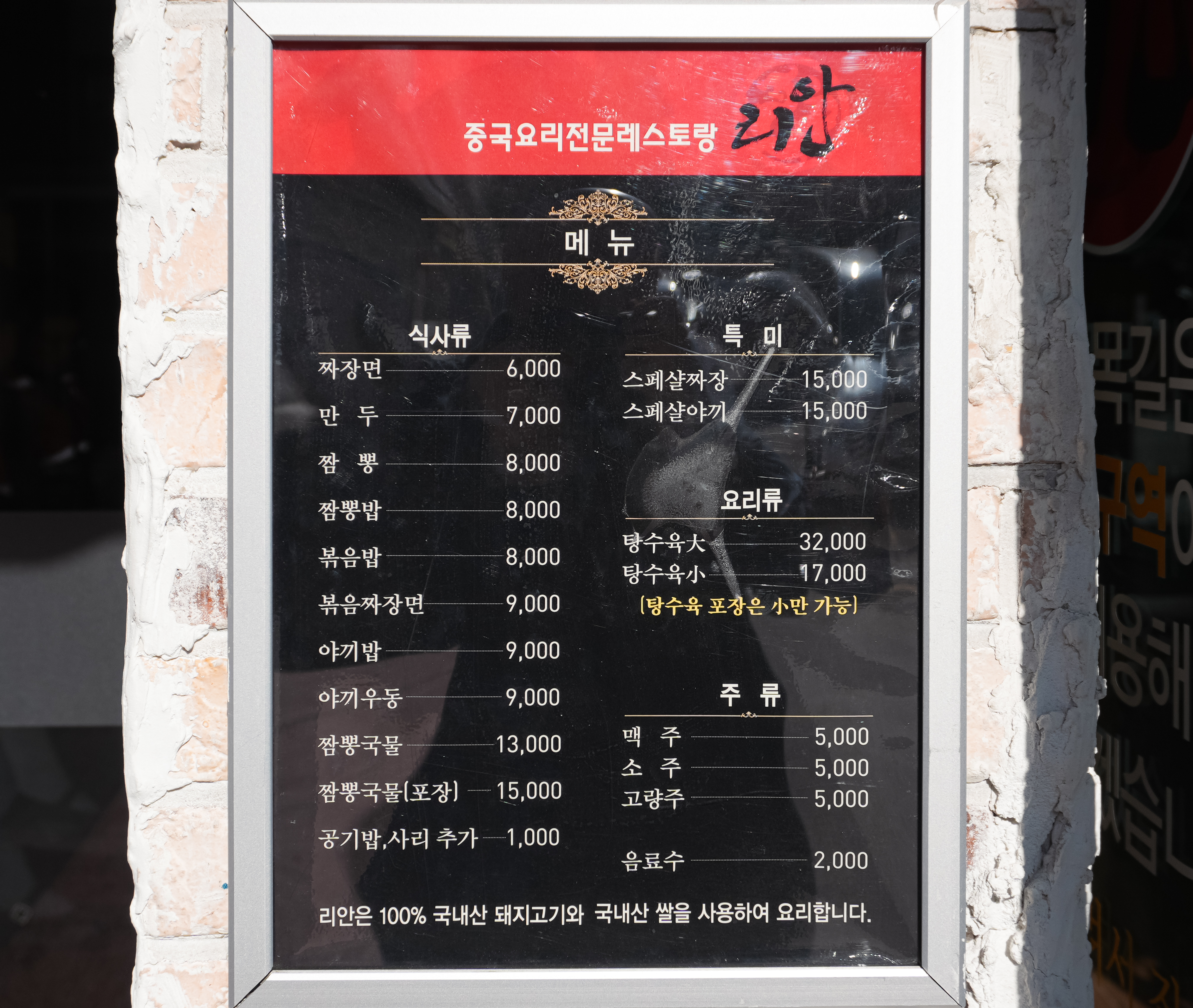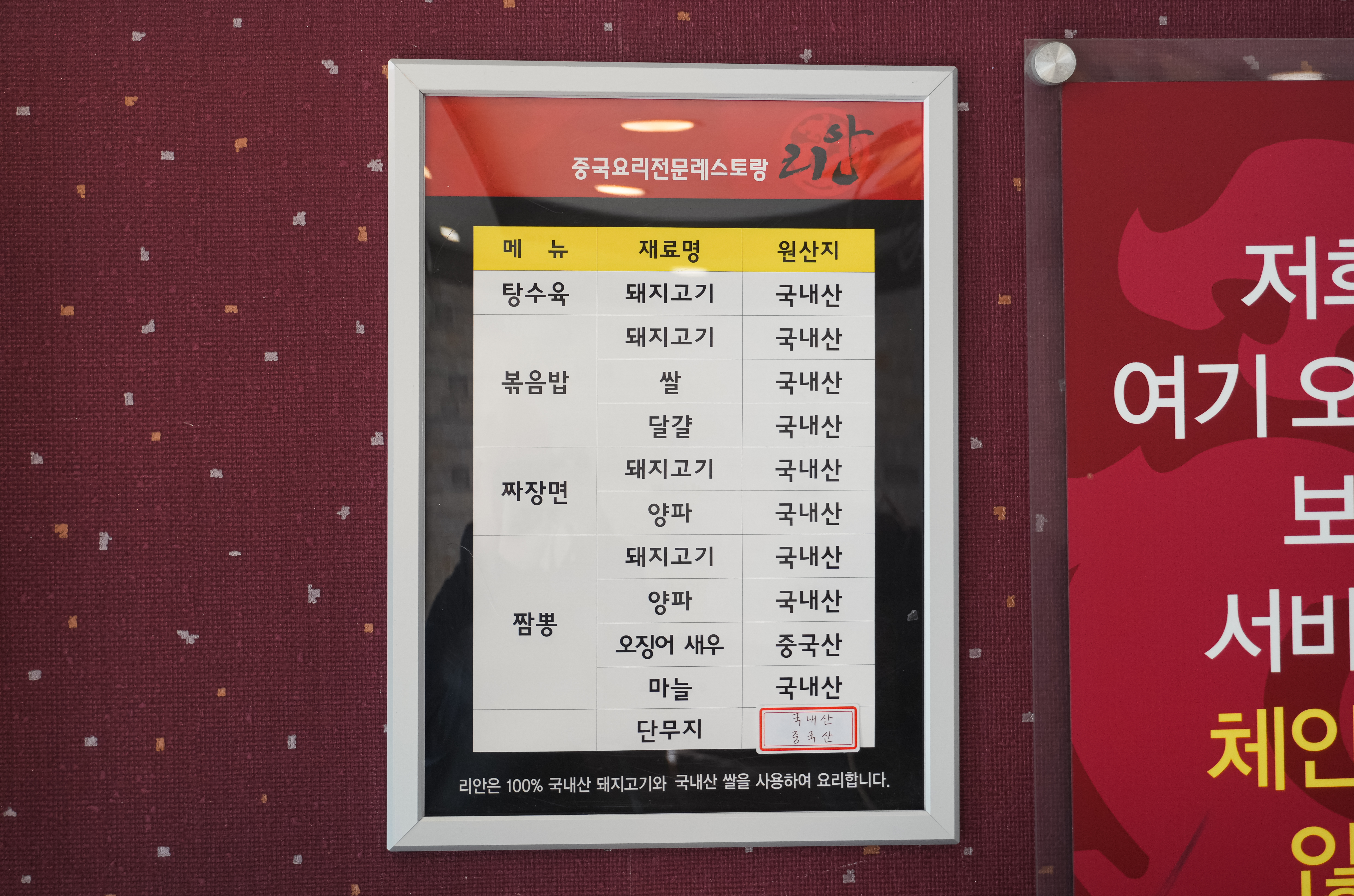가게에 들어가면 대기실이 있어서 명단에 이름을 적어두고 대기를 할 수 있었고, 이곳에서 인기 있는 메뉴인 '스페셜야끼'라는 메뉴와 더불어 탕수육을 강조하고 있었습니다. 그밖에 리안에서 사용하는 식재료의 원산지 표기를 하고 있었는데, 대부분 국내산 재료를 이용해 만드는 것 같았습니다.