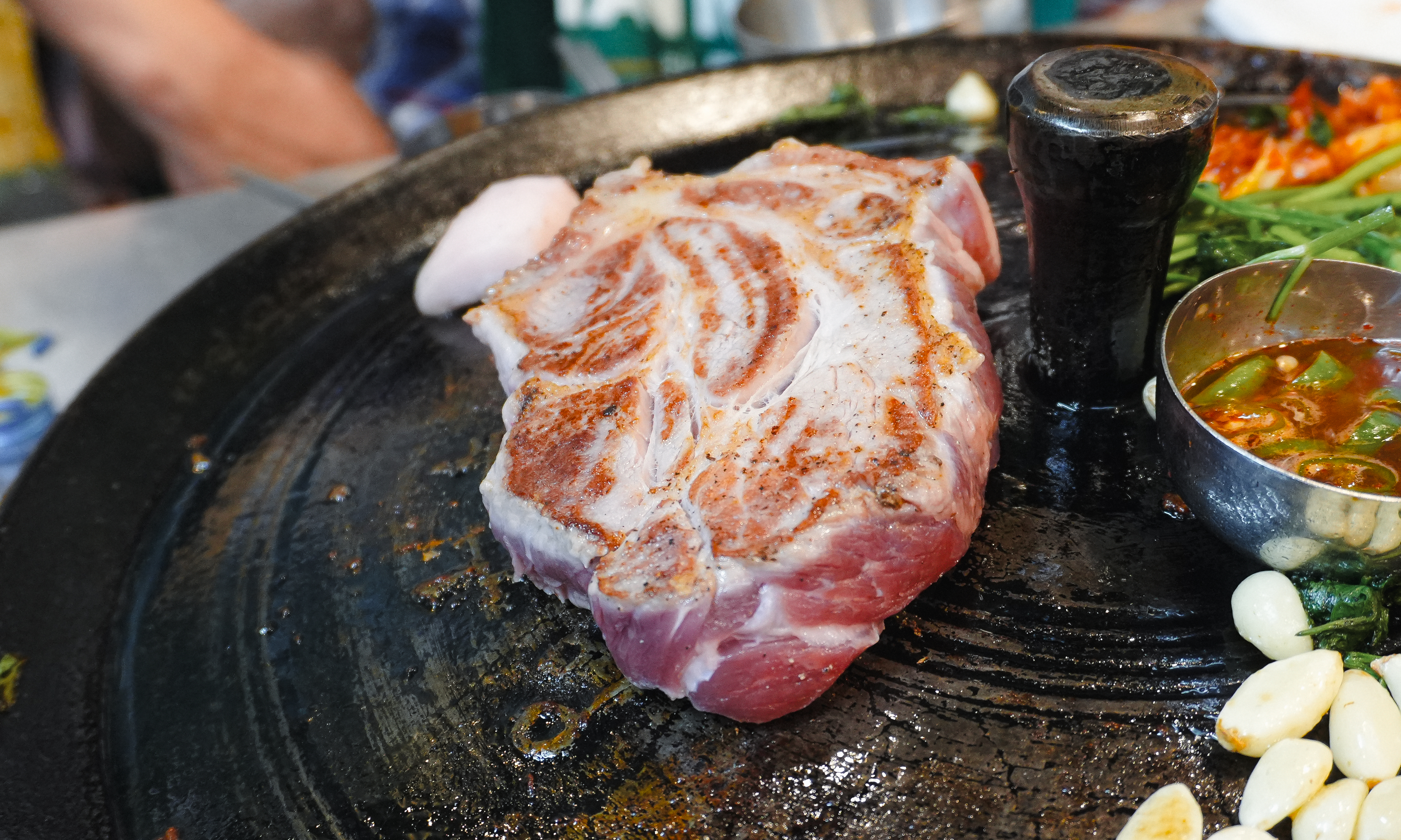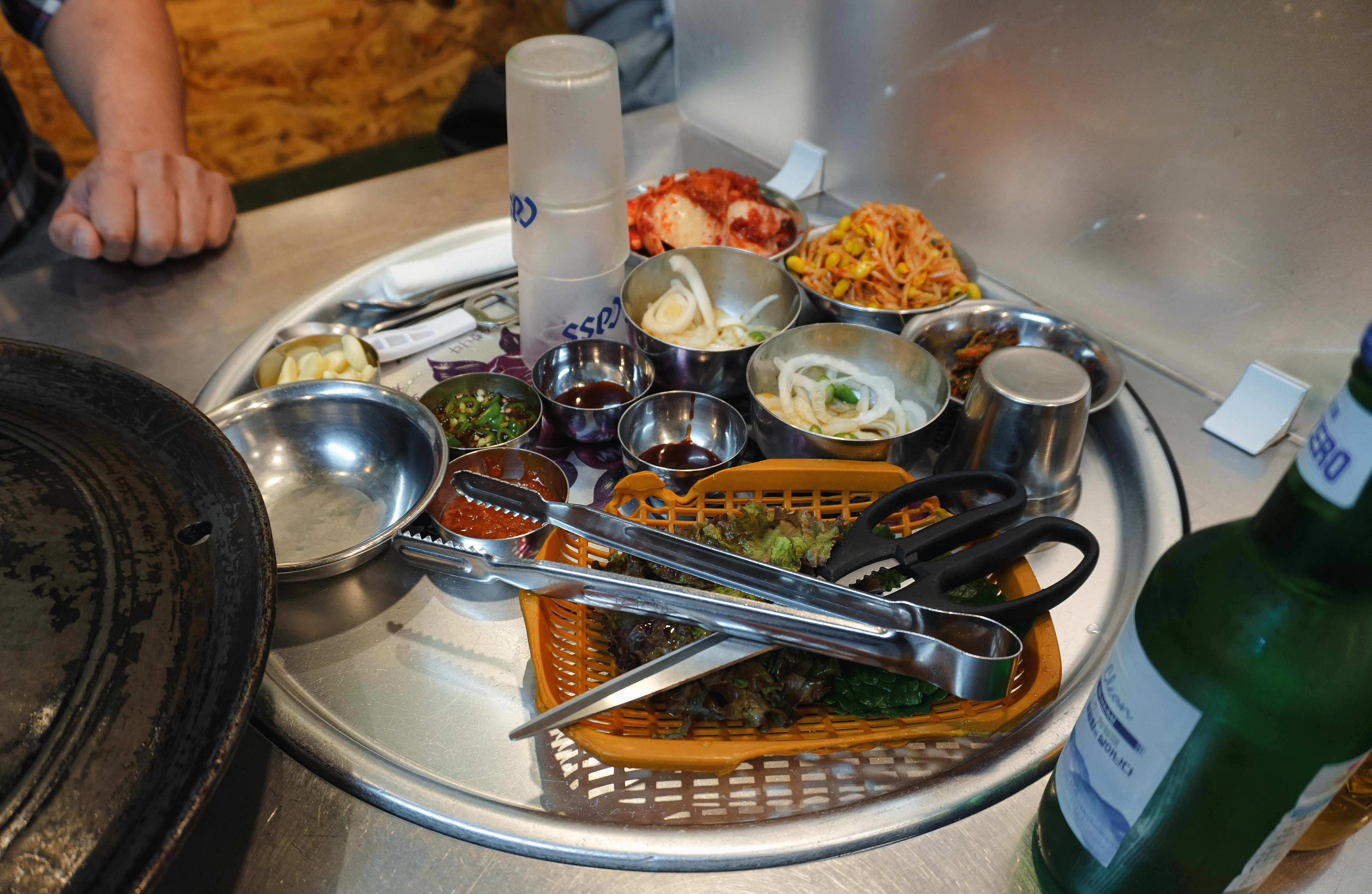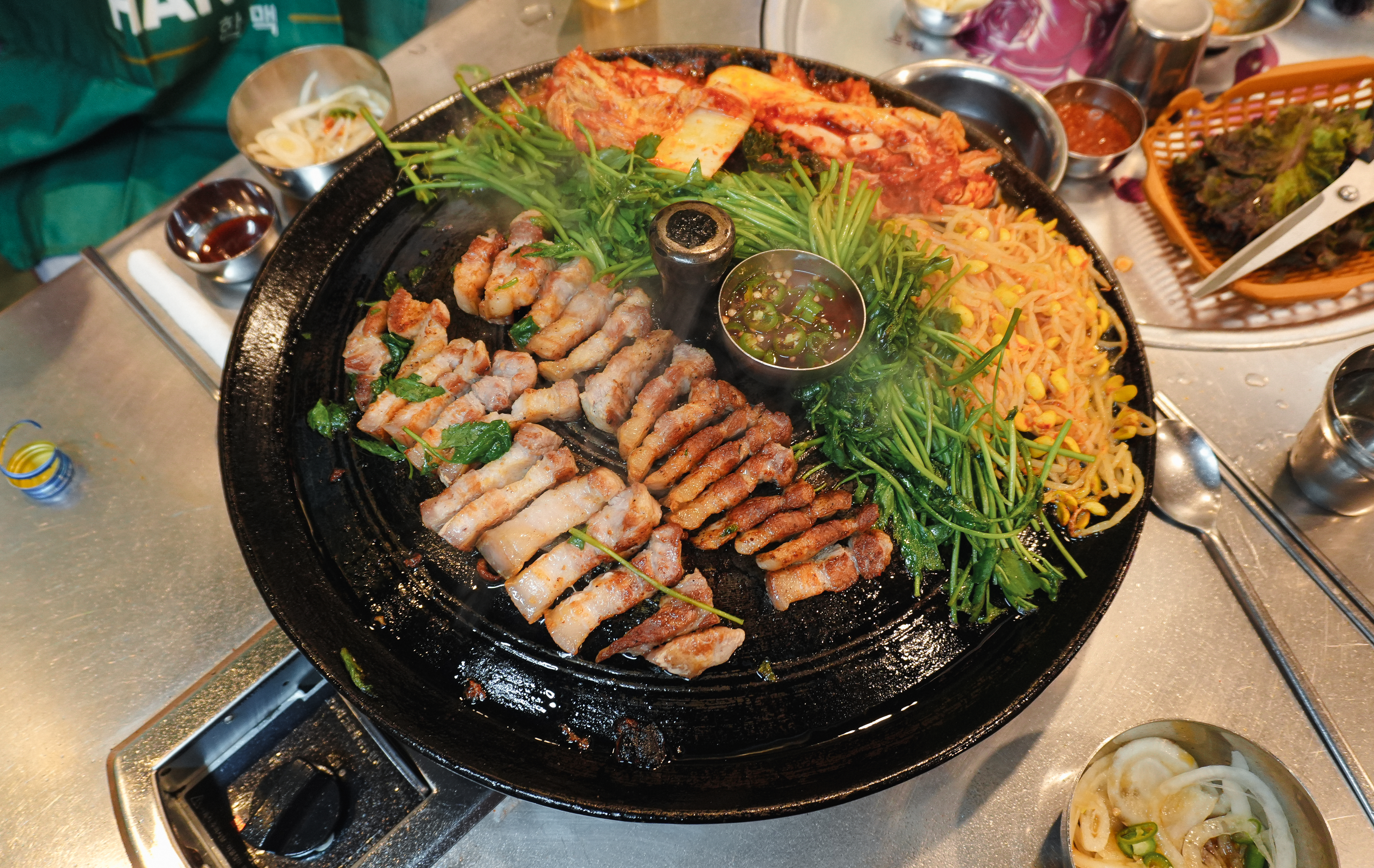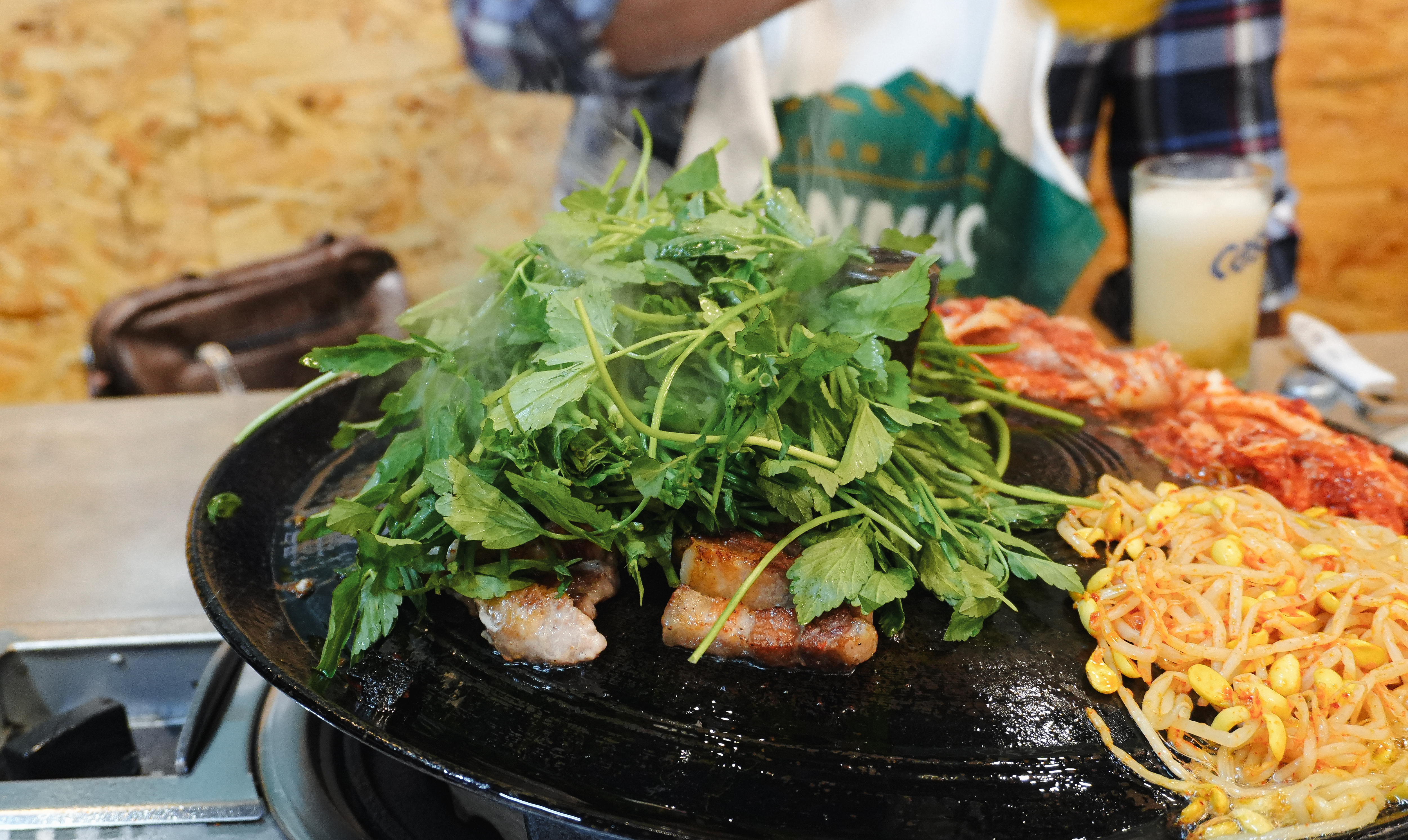 솥뚜껑 위에 올린 미박삼겹살과 오봉이라 불리는 커다란 쟁반에 반찬이 한가득 나왔습니다. 별도로 주문한 미나리도 같이 나왔고, 고기는 가게에서 직접 구워주고 있어서 별도로 손을 댈 필요는 없었습니다.