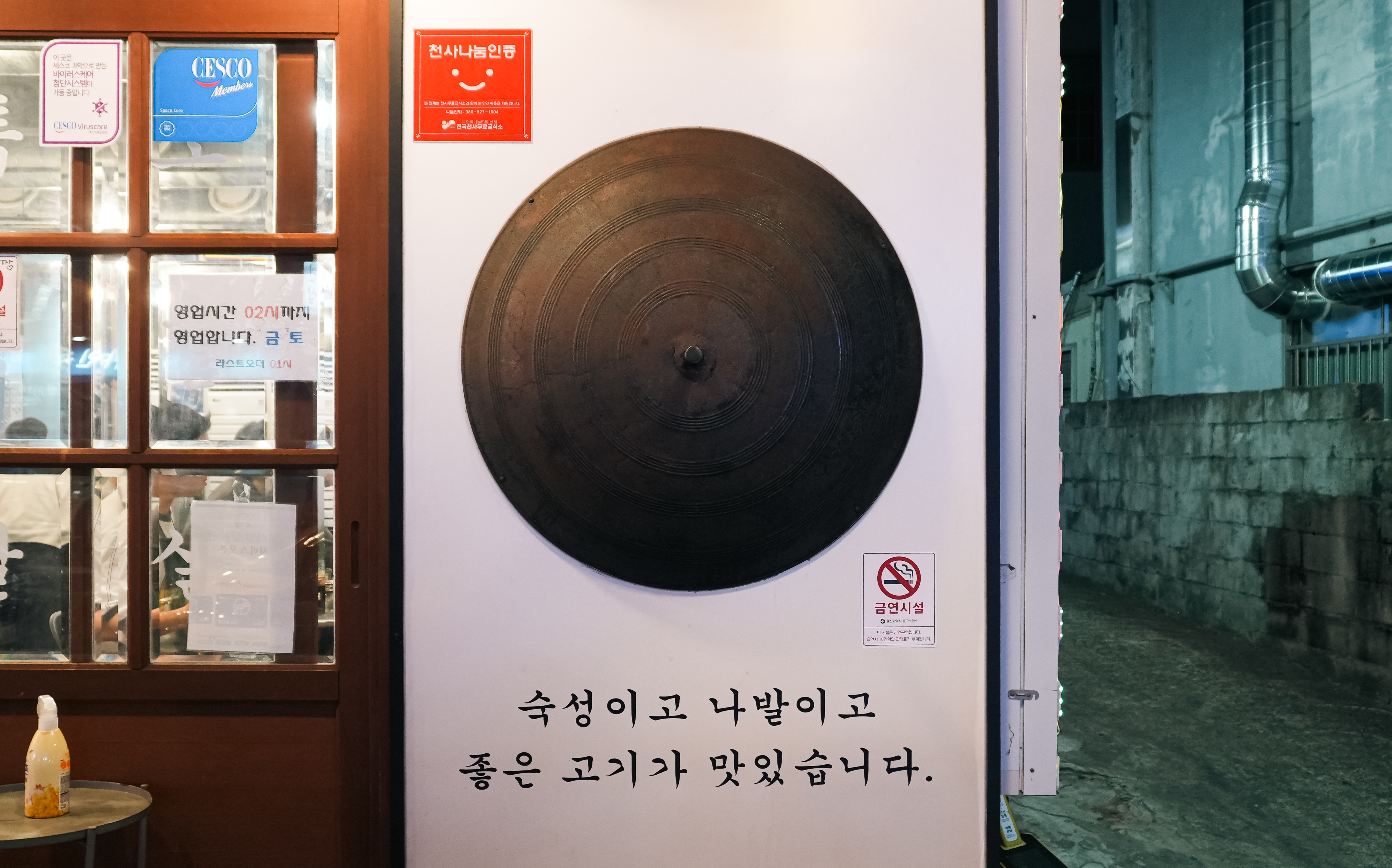 목구멍 울산일산점은 울산 동구 일산동 580-21, 1층에 위치한 가게입니다. 가게에는 커다란 솥뚜껑이 전시되어 있었고, '숙성이고 나발이고 좋은 고기가 맛있습니다.' 라는 문구가 적혀있었습니다. 맞는 말이긴 한데, 과연 얼마나 맛있을지는 들어가서 확인해 보겠습니다.