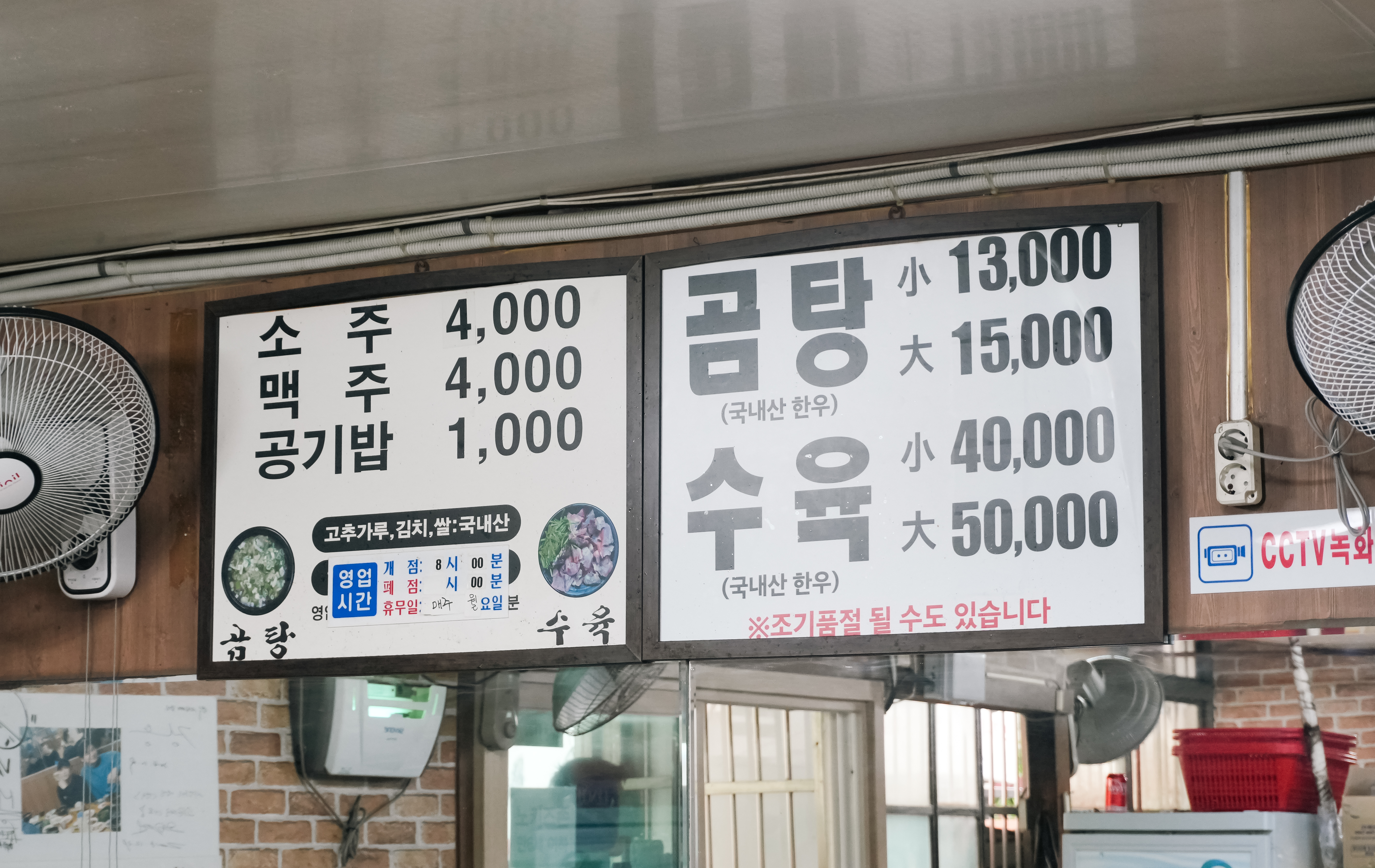앞서 소개해드린 것처럼 장기식당은 평남식당과 붙어있는 가게로, 둘 다 한우 소머리곰탕이 유명한 가게입니다. 가게 앞에는 팔팔 끓이고 있는 곰탕의 모습을 볼 수 있었는데요, 가게 한쪽에 식히고 있는 소고기 수육들까지 먹음직스러워 보였습니다.