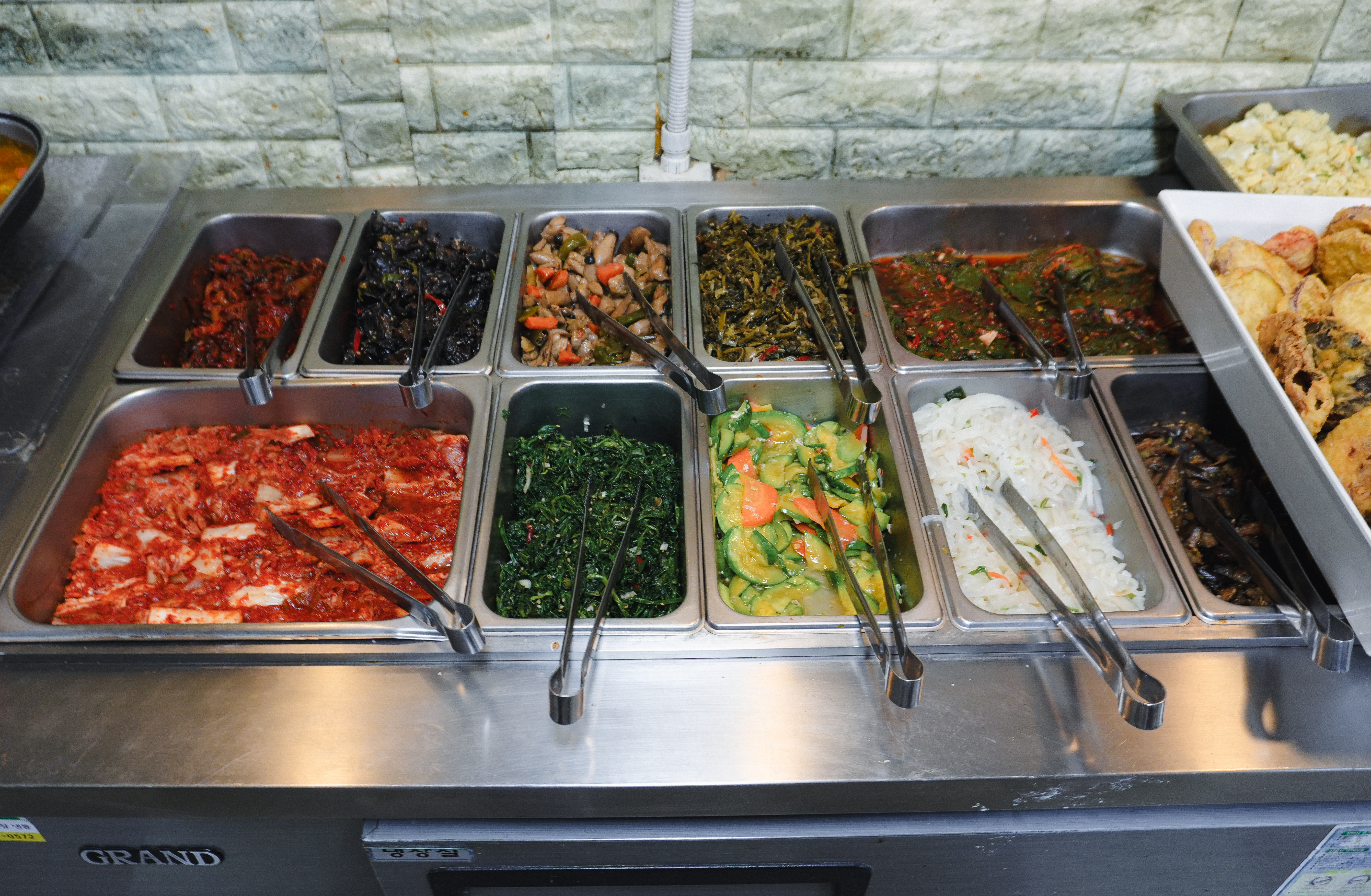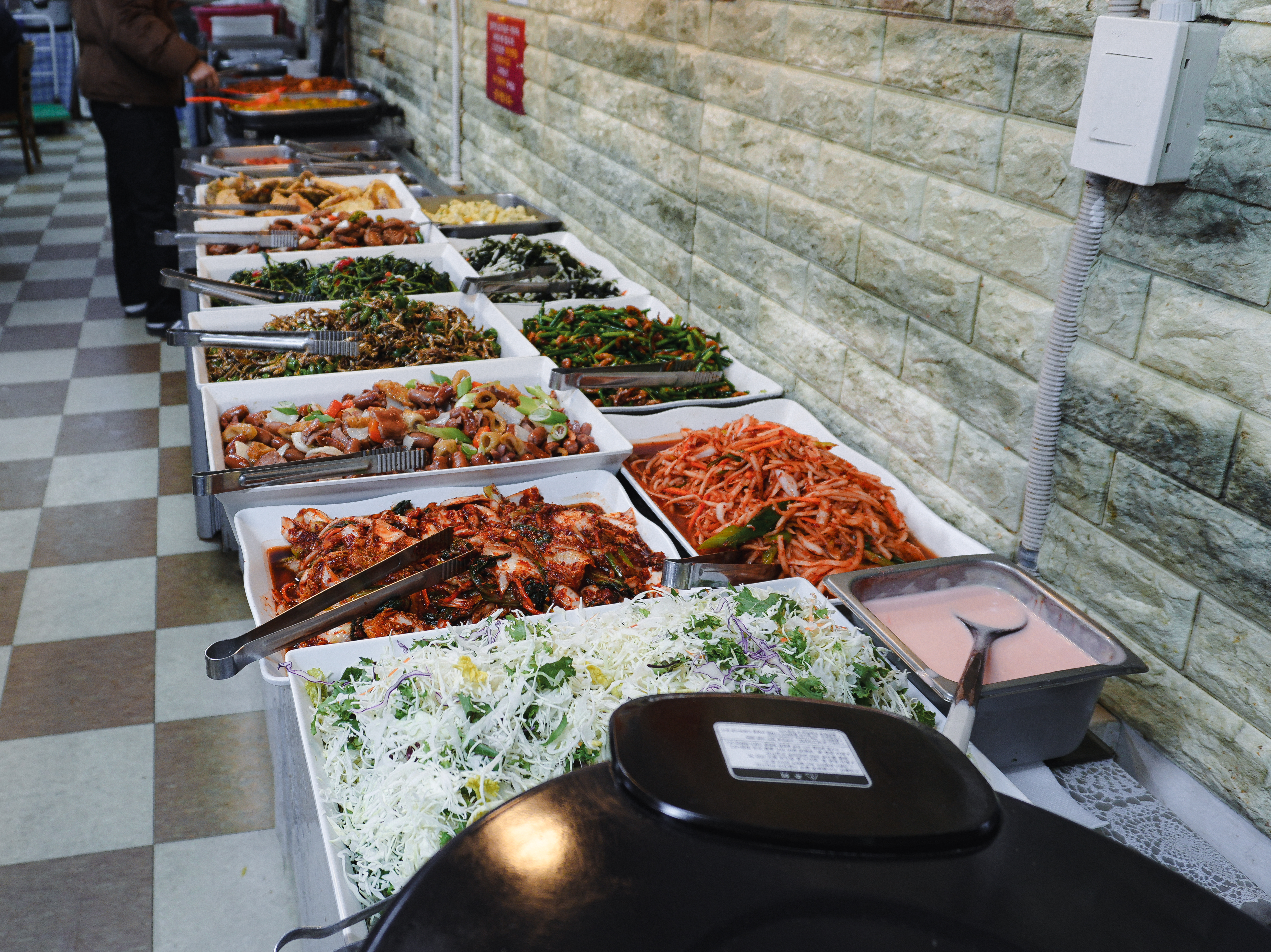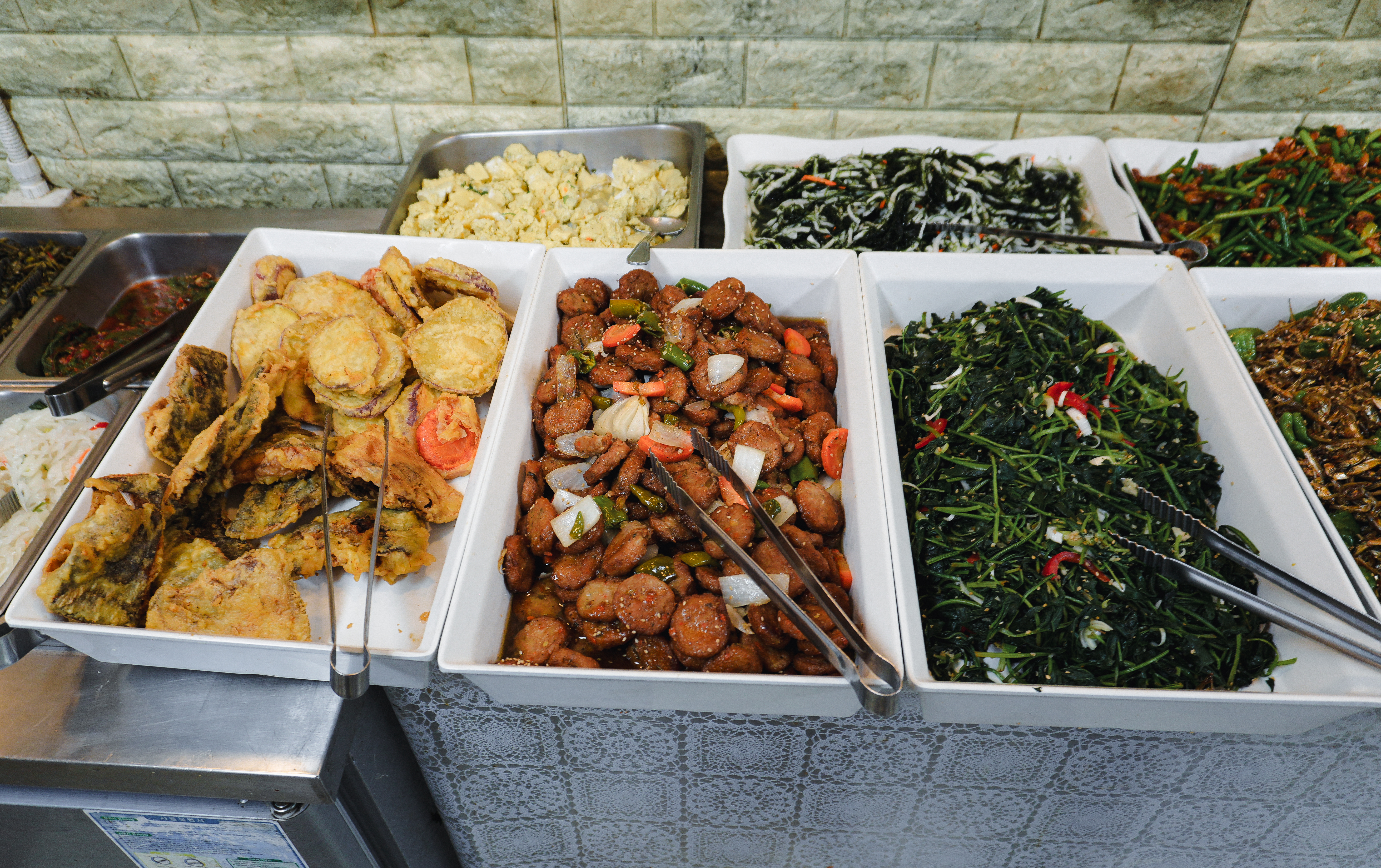 행복한식뷔페의 메뉴는 돼지고기김치볶음과 카레, 튀김, 소시지볶음, 떡갈비(?), 김치, 나물, 멸치볶음, 새우볶음 등 갖가지 다양한 반찬이 있었습니다. 원래는 라면도 직접 끓여 먹는 곳이 있었는데, 지금은 안 하시는 것 같더라고요.