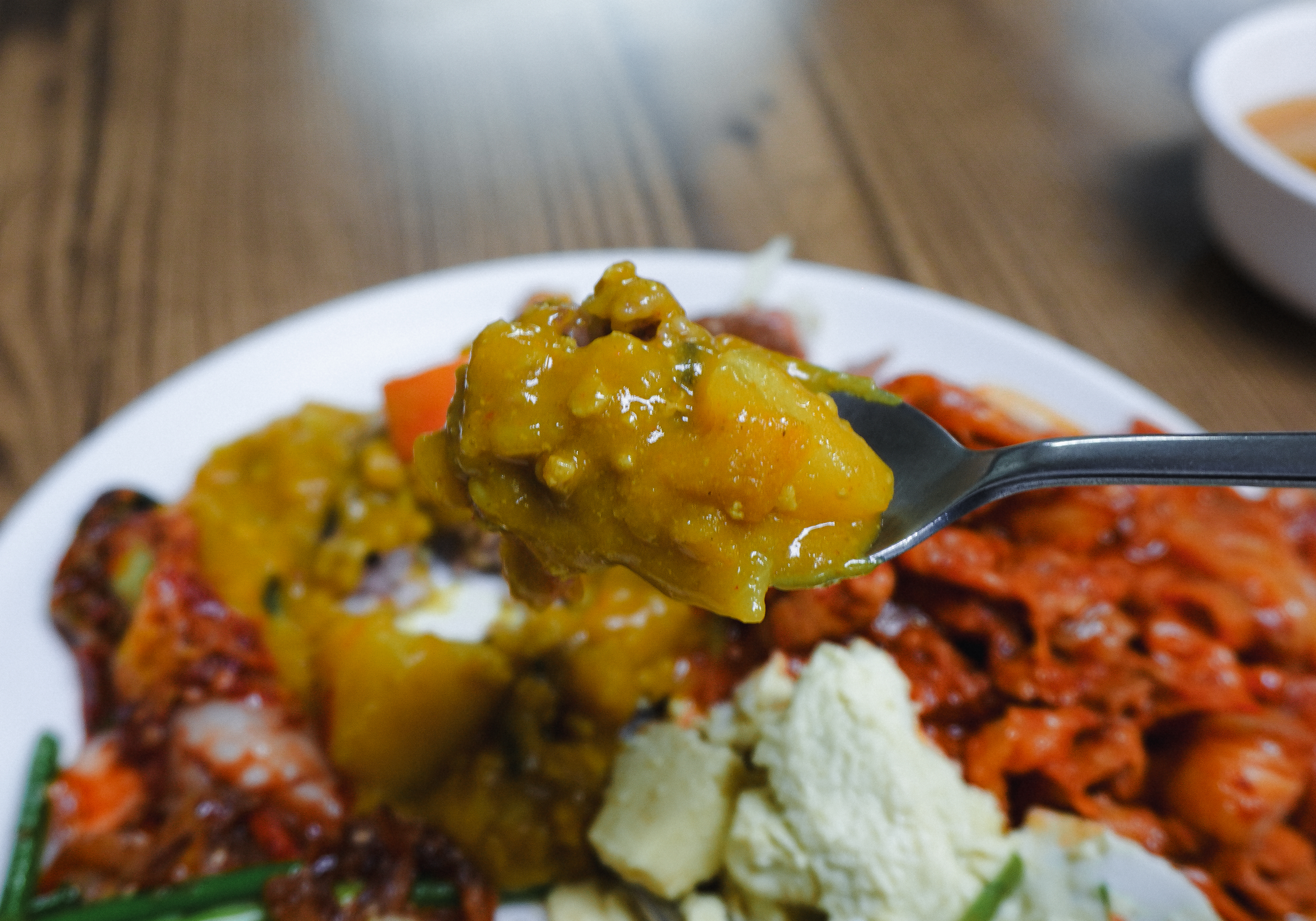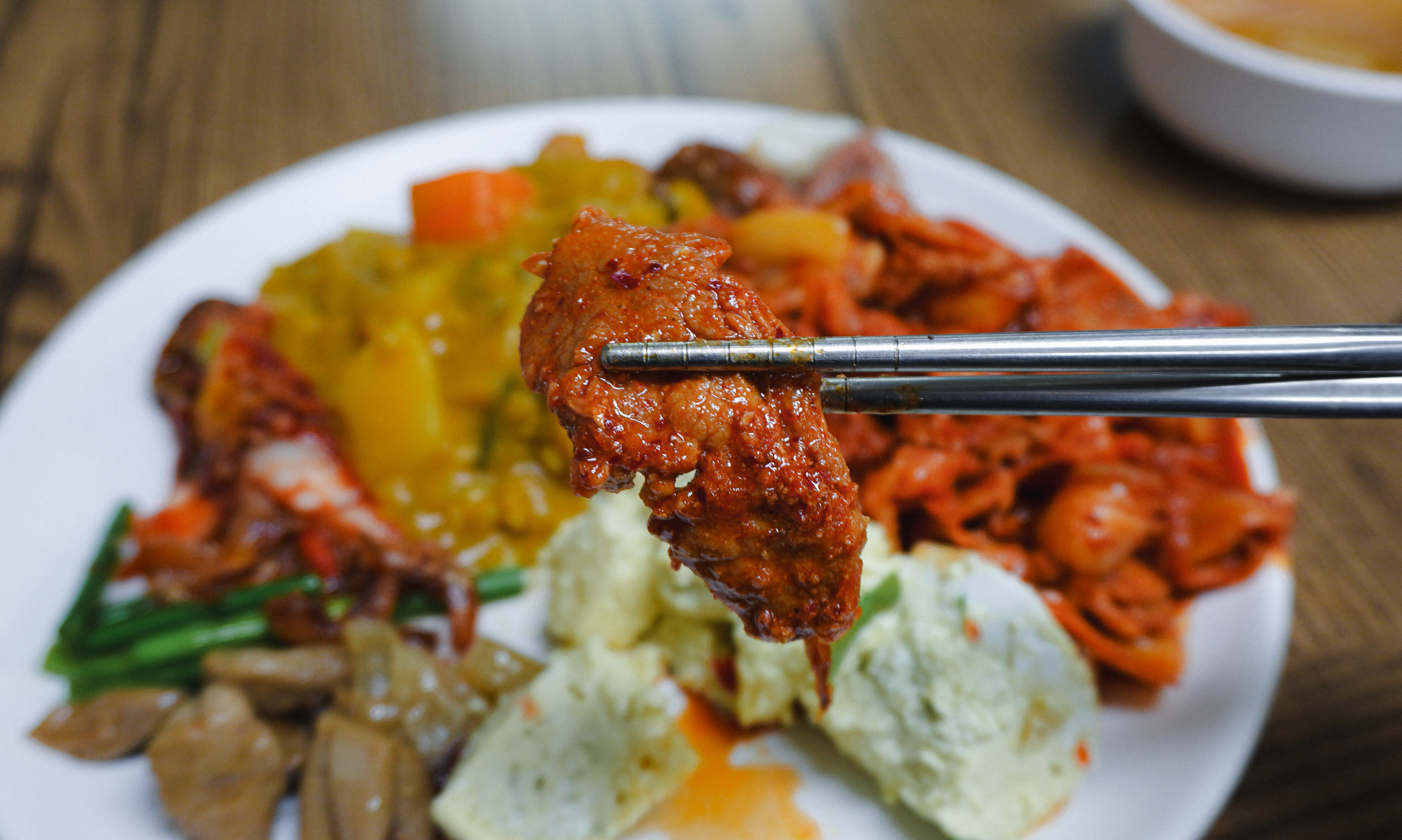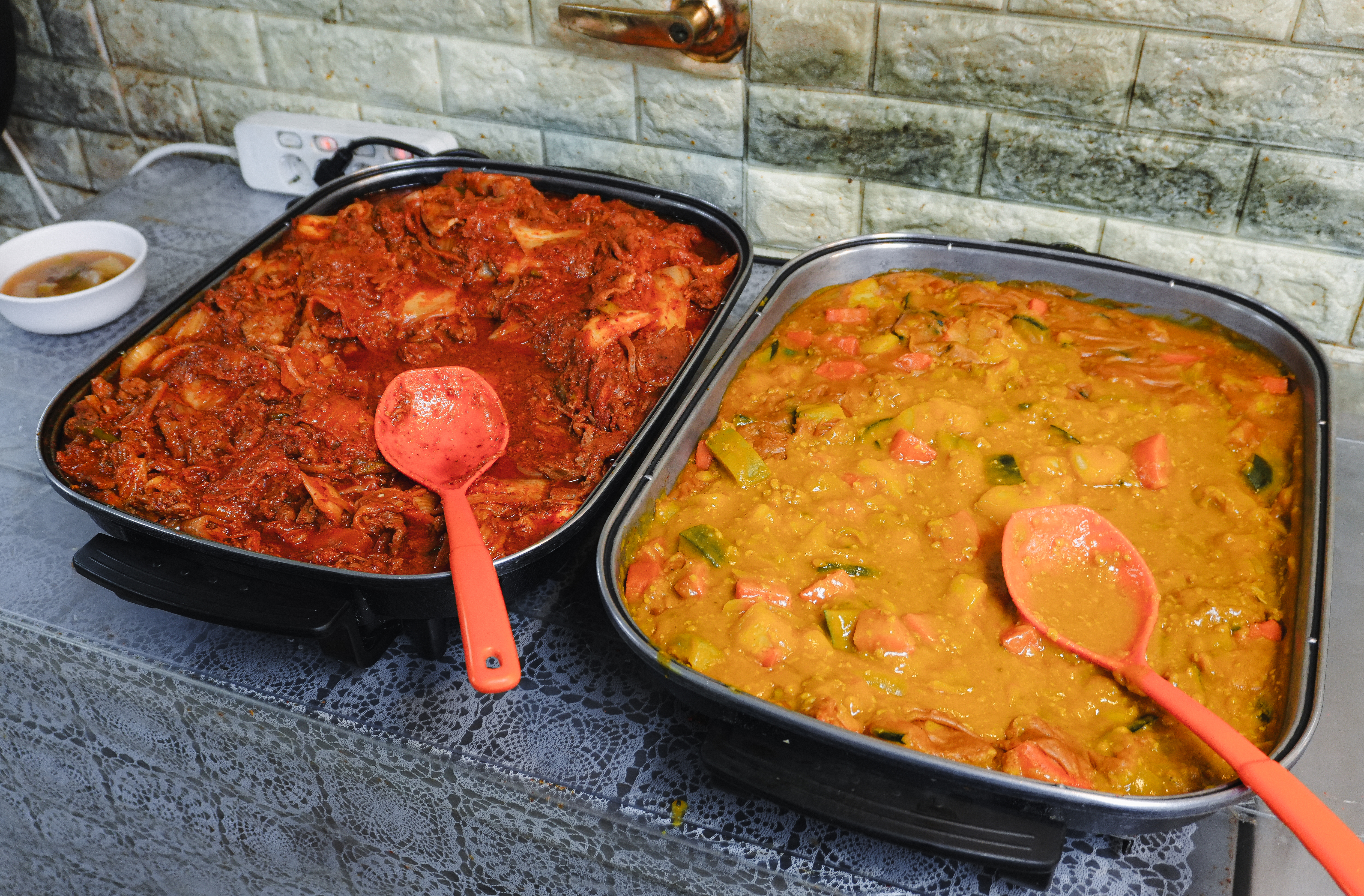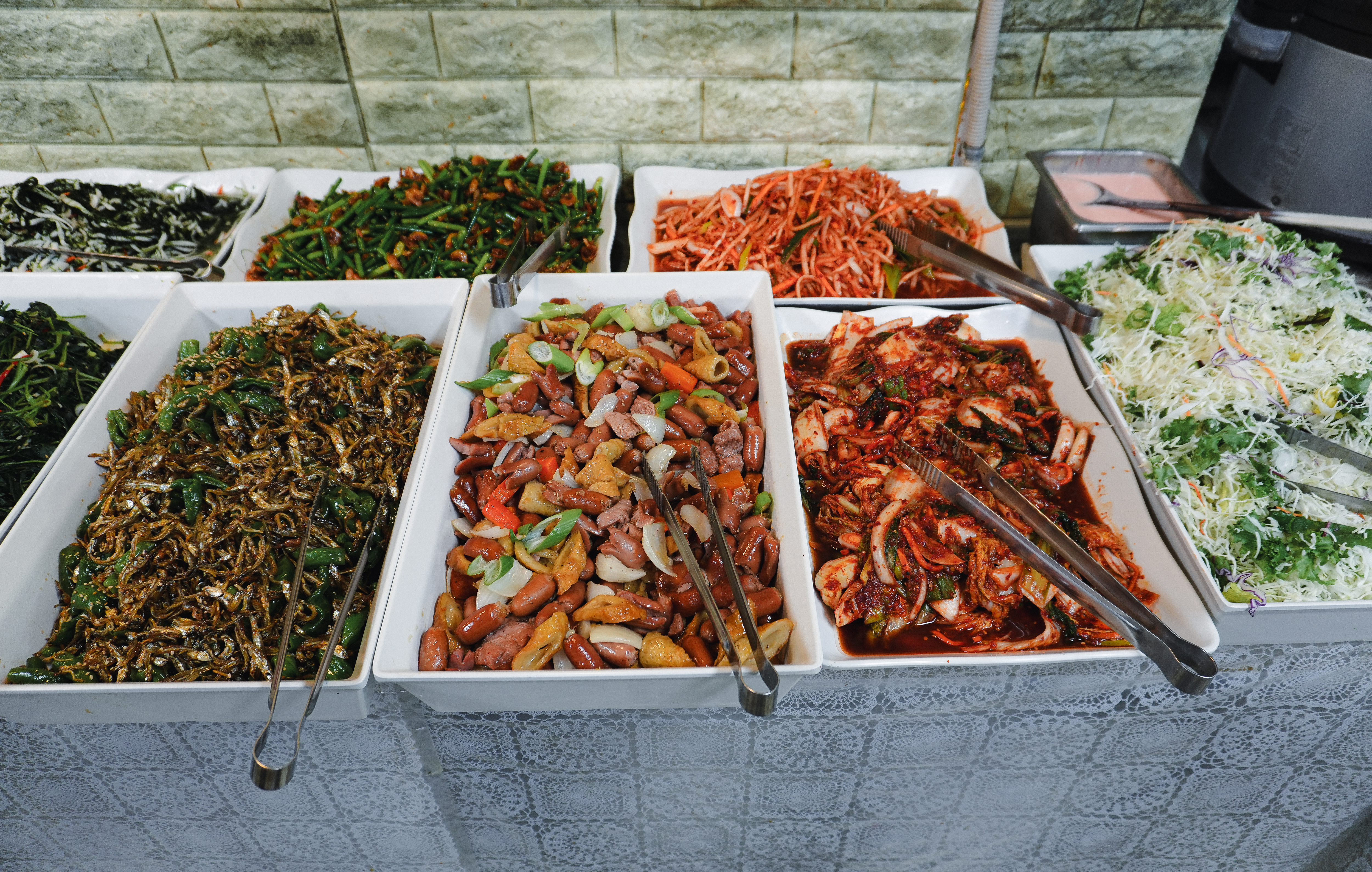행복한식뷔페의 메뉴는 돼지고기김치볶음과 카레, 튀김, 소시지볶음, 떡갈비(?), 김치, 나물, 멸치볶음, 새우볶음 등 갖가지 다양한 반찬이 있었습니다. 원래는 라면도 직접 끓여 먹는 곳이 있었는데, 지금은 안 하시는 것 같더라고요.