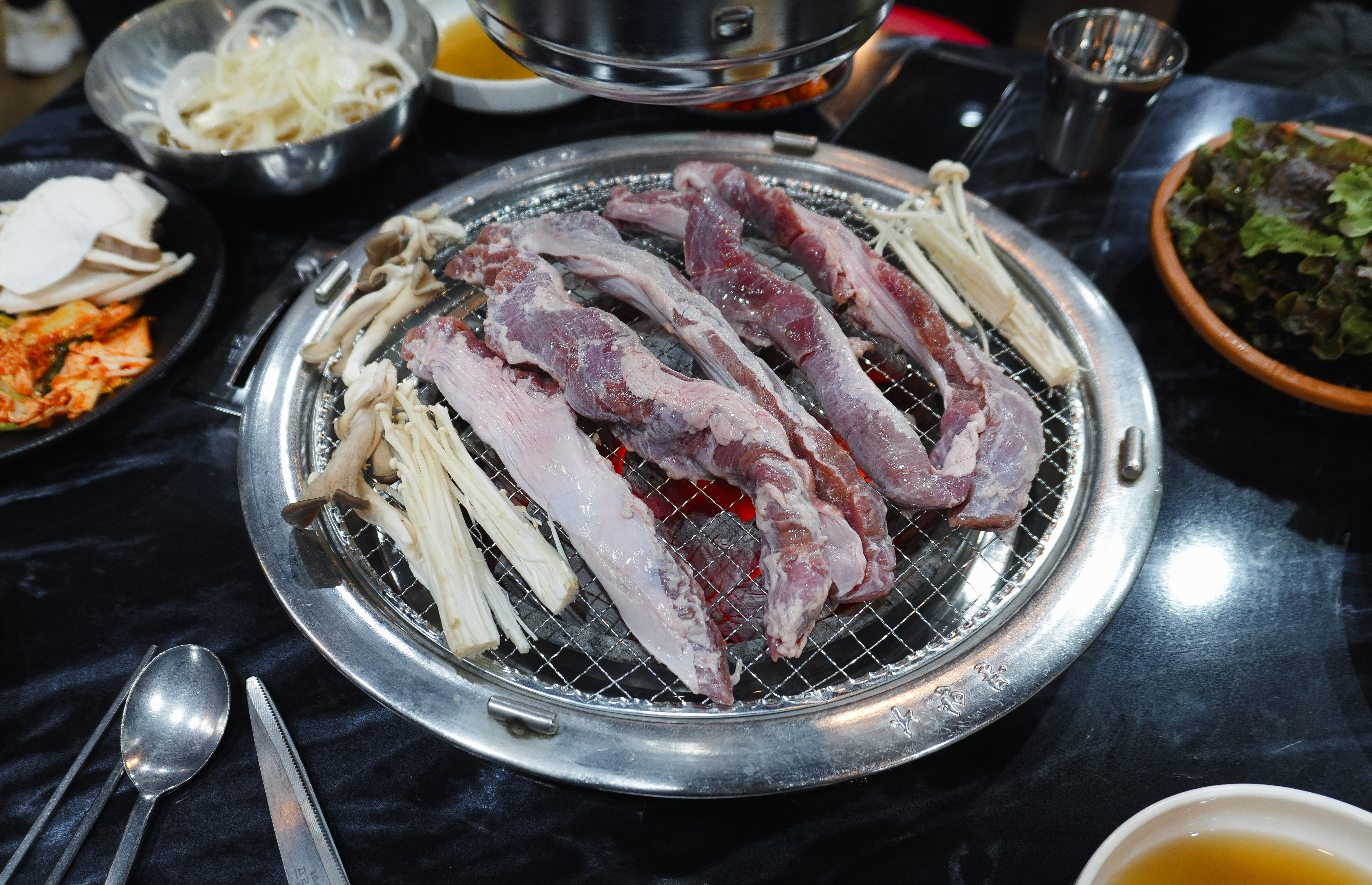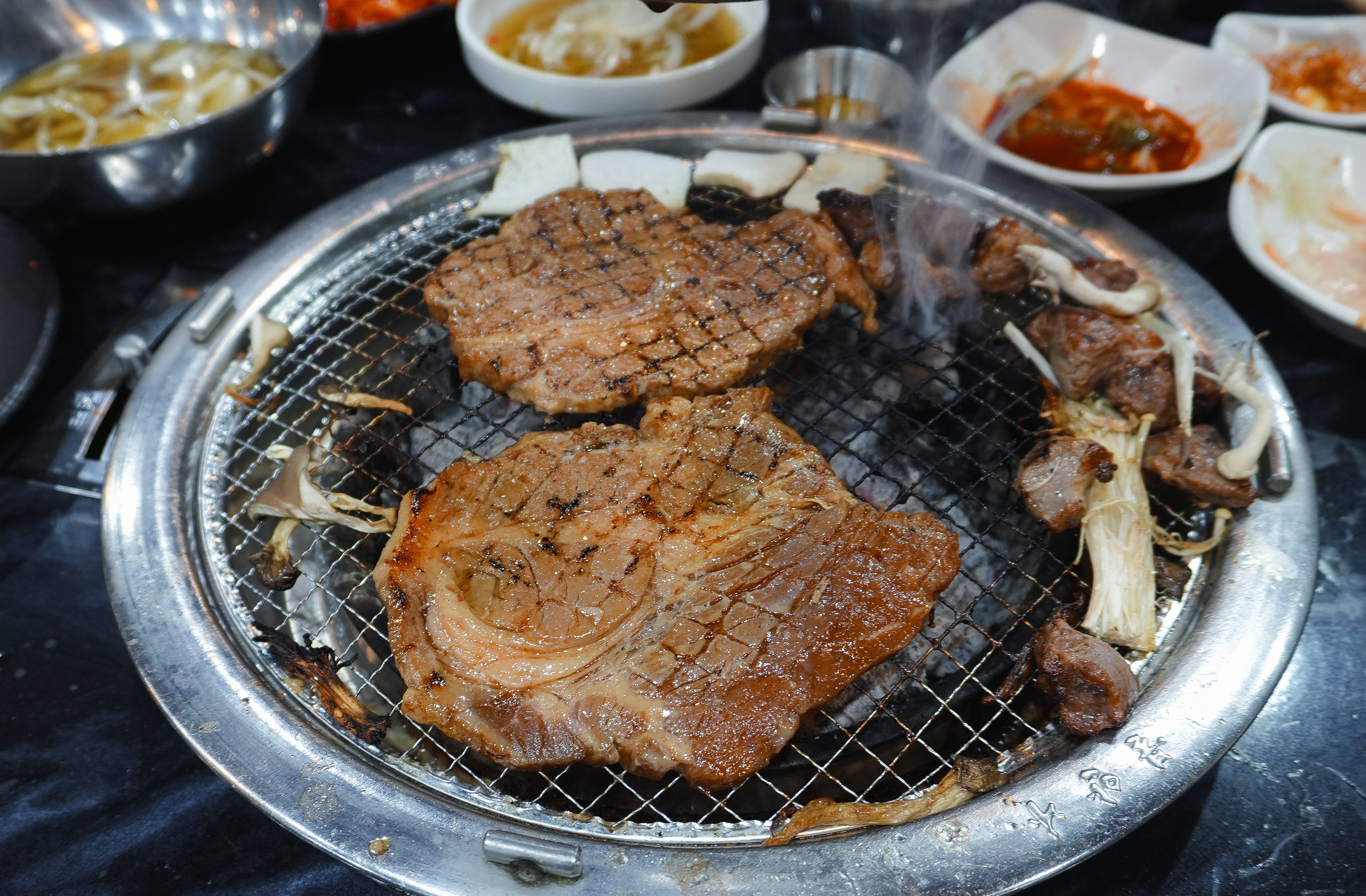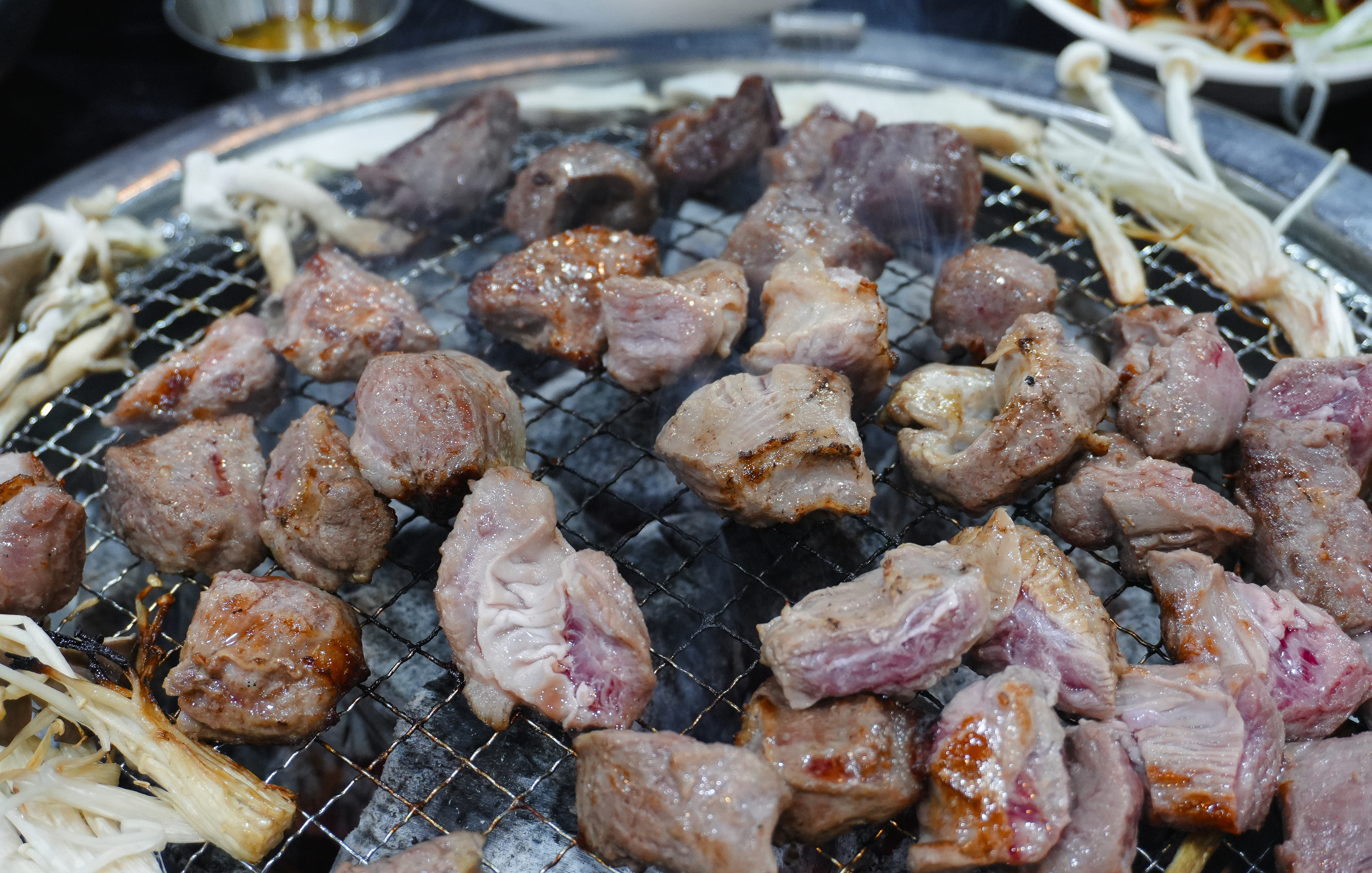 저는 불판 위에 고기와 버섯 등을 올려 구웠습니다. 고기와 곁들일 반찬들과 쌈채소도 가져와 같이 먹었는데요, 저는 개인적으로 돼지갈비보다 갈매기살이 맛있어서 방문했기에, 갈매기살 위주로 먹었습니다.
