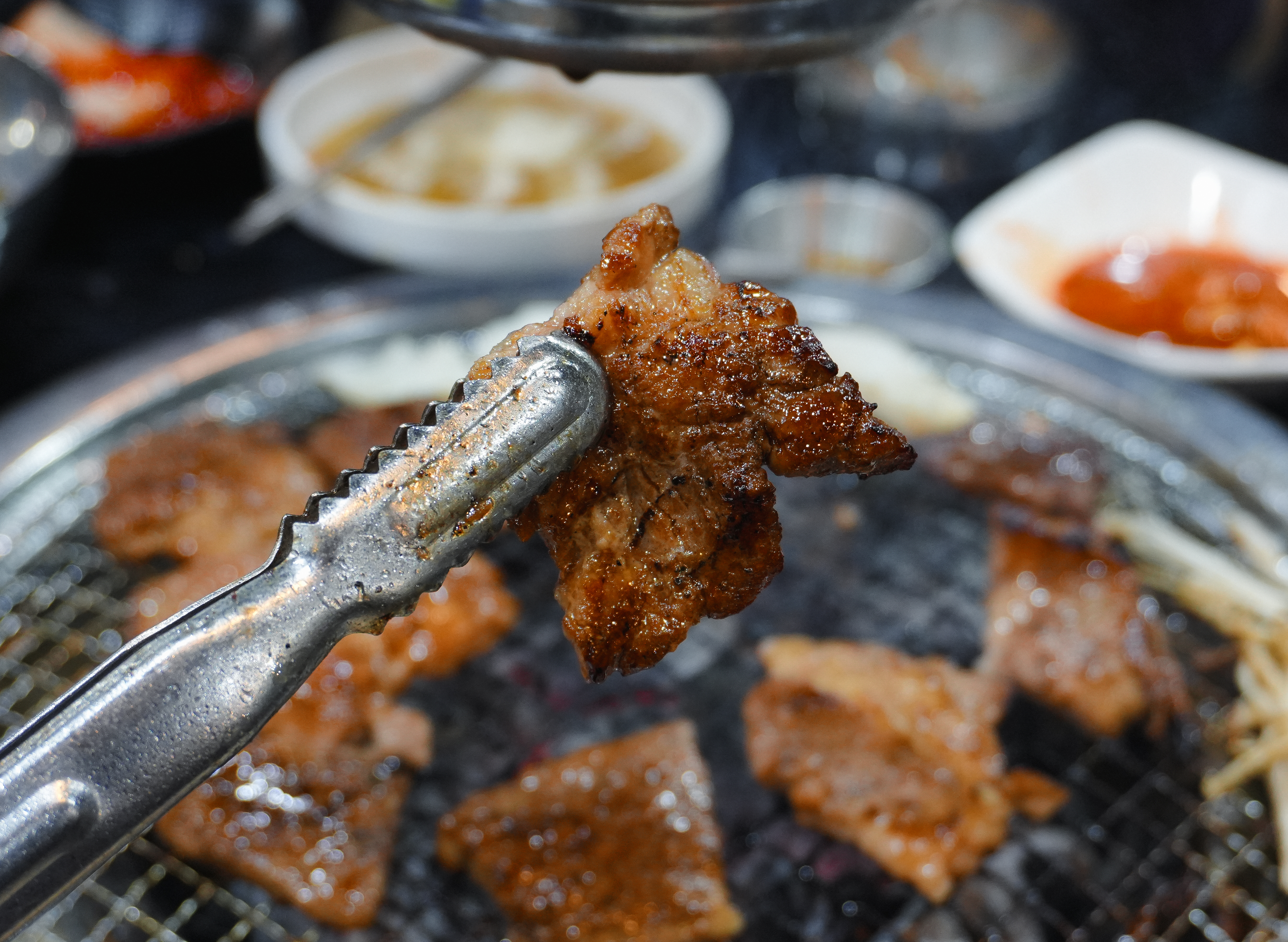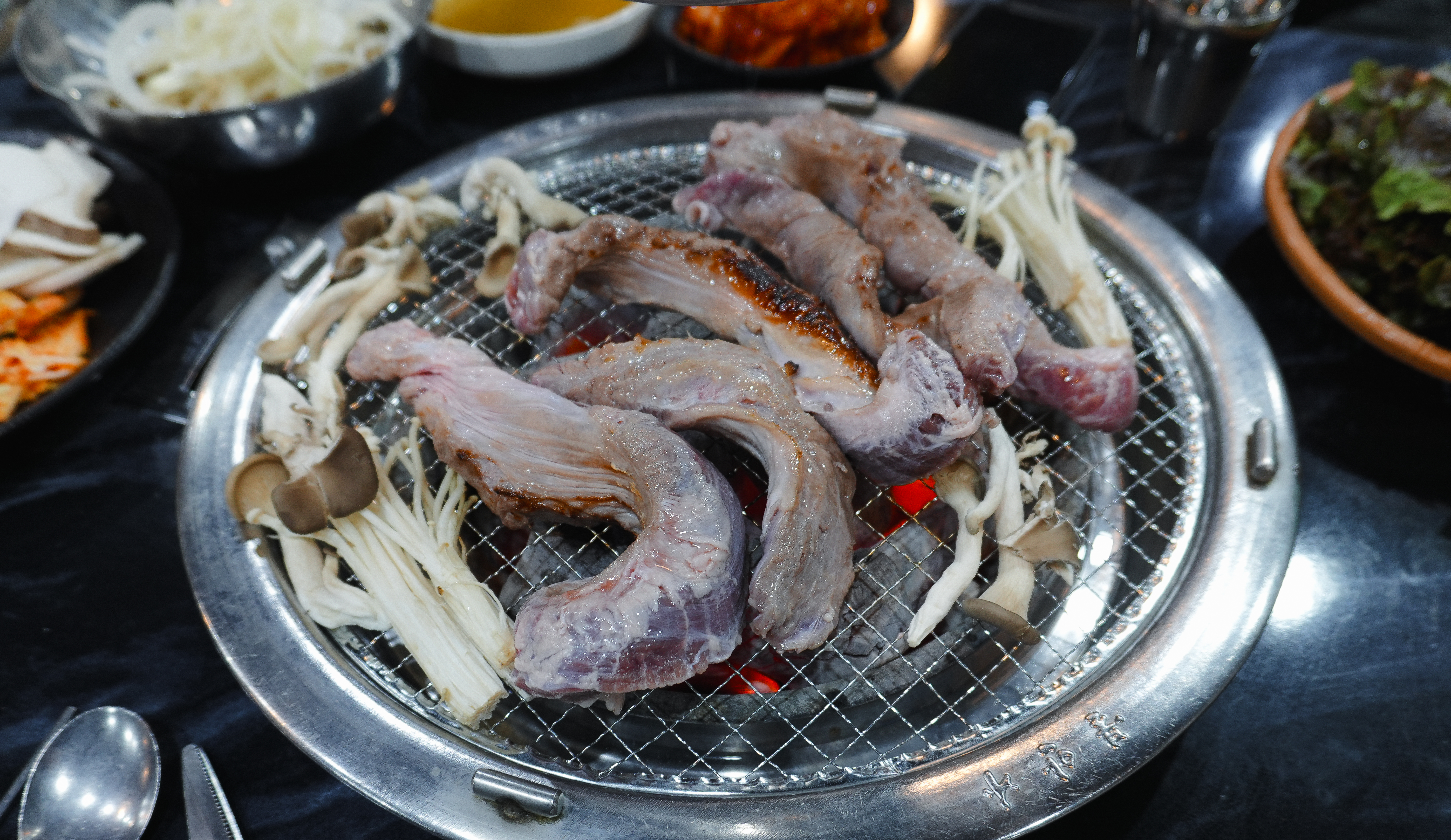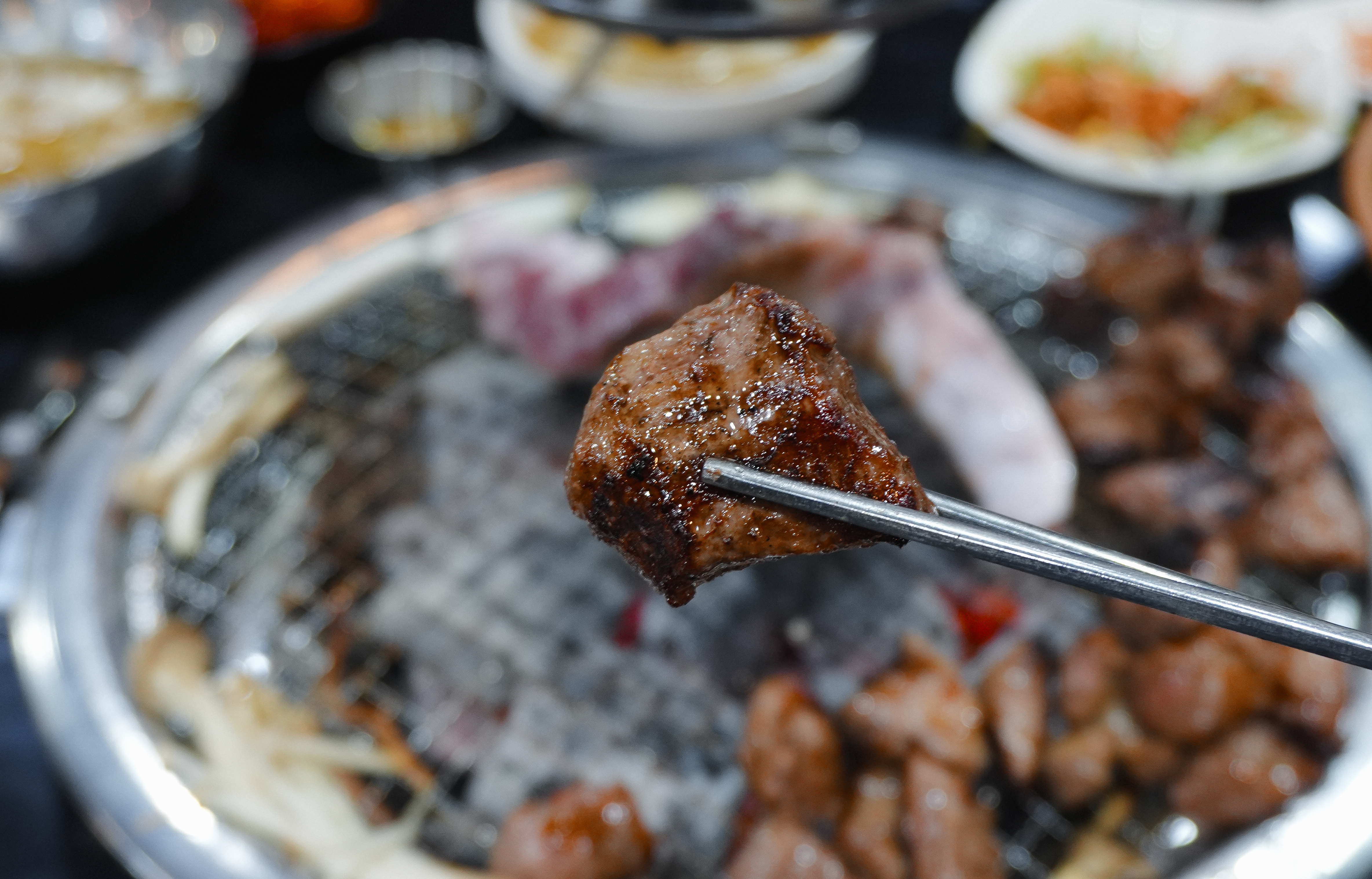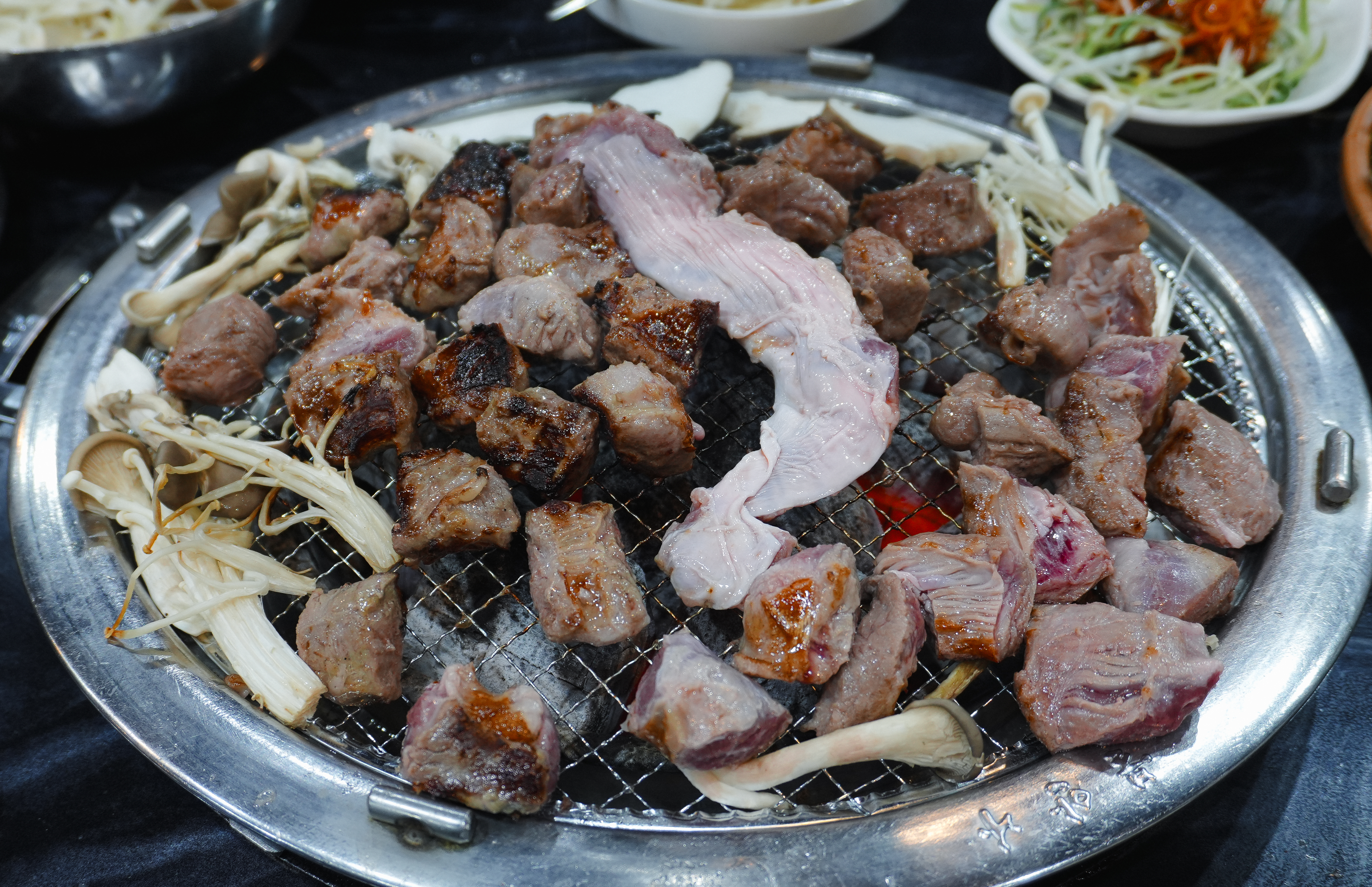 저는 불판 위에 고기와 버섯 등을 올려 구웠습니다. 고기와 곁들일 반찬들과 쌈채소도 가져와 같이 먹었는데요, 저는 개인적으로 돼지갈비보다 갈매기살이 맛있어서 방문했기에, 갈매기살 위주로 먹었습니다.