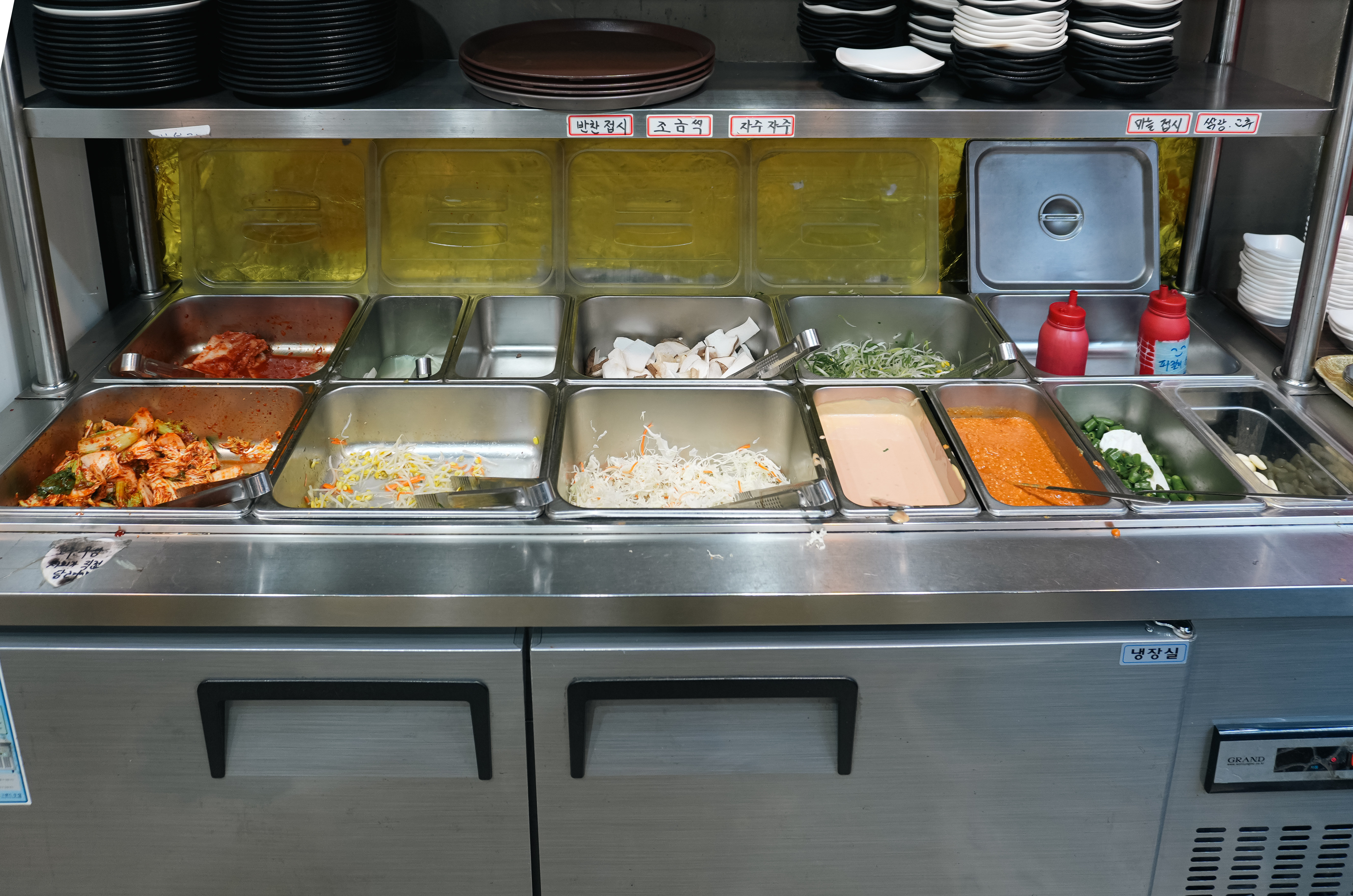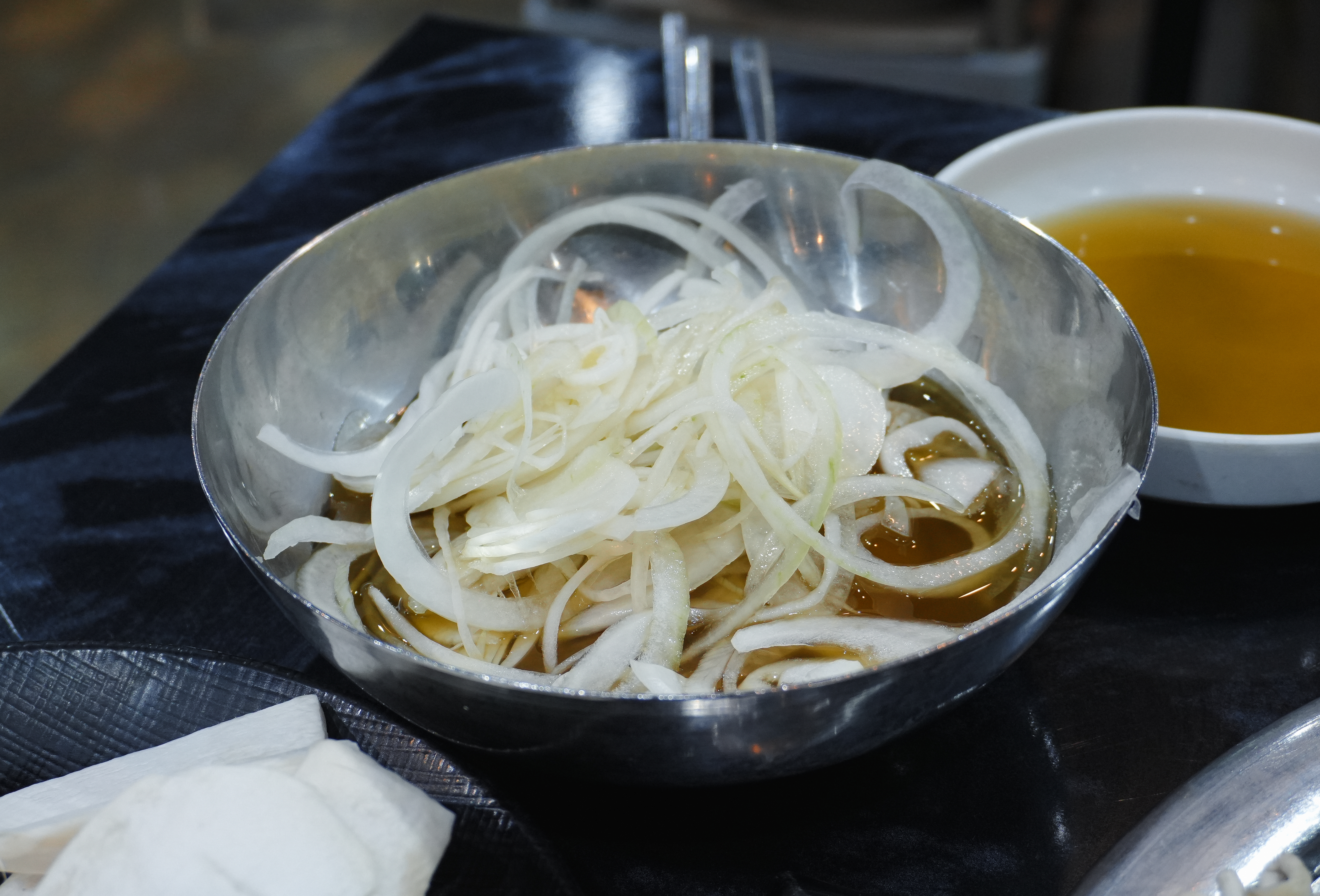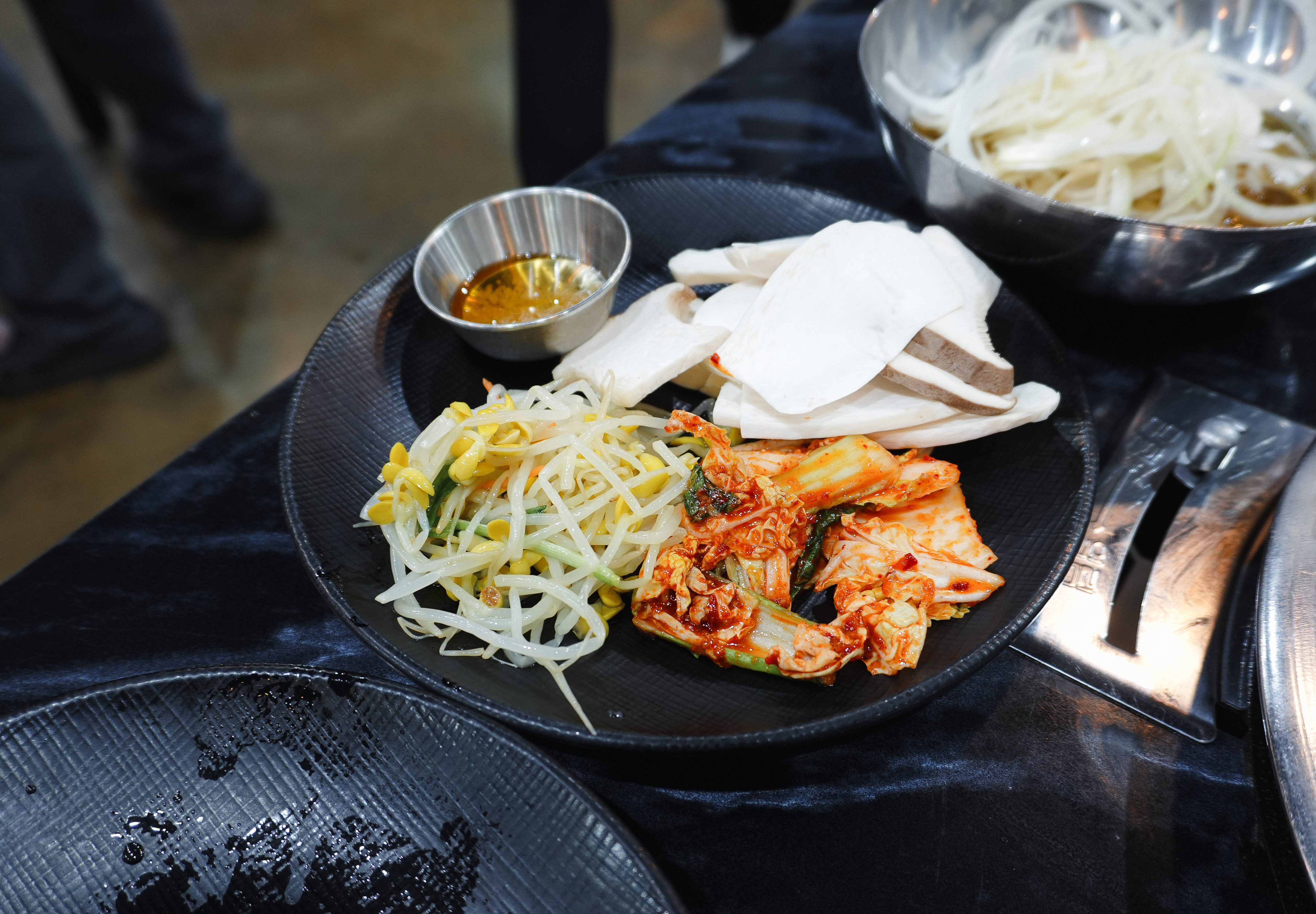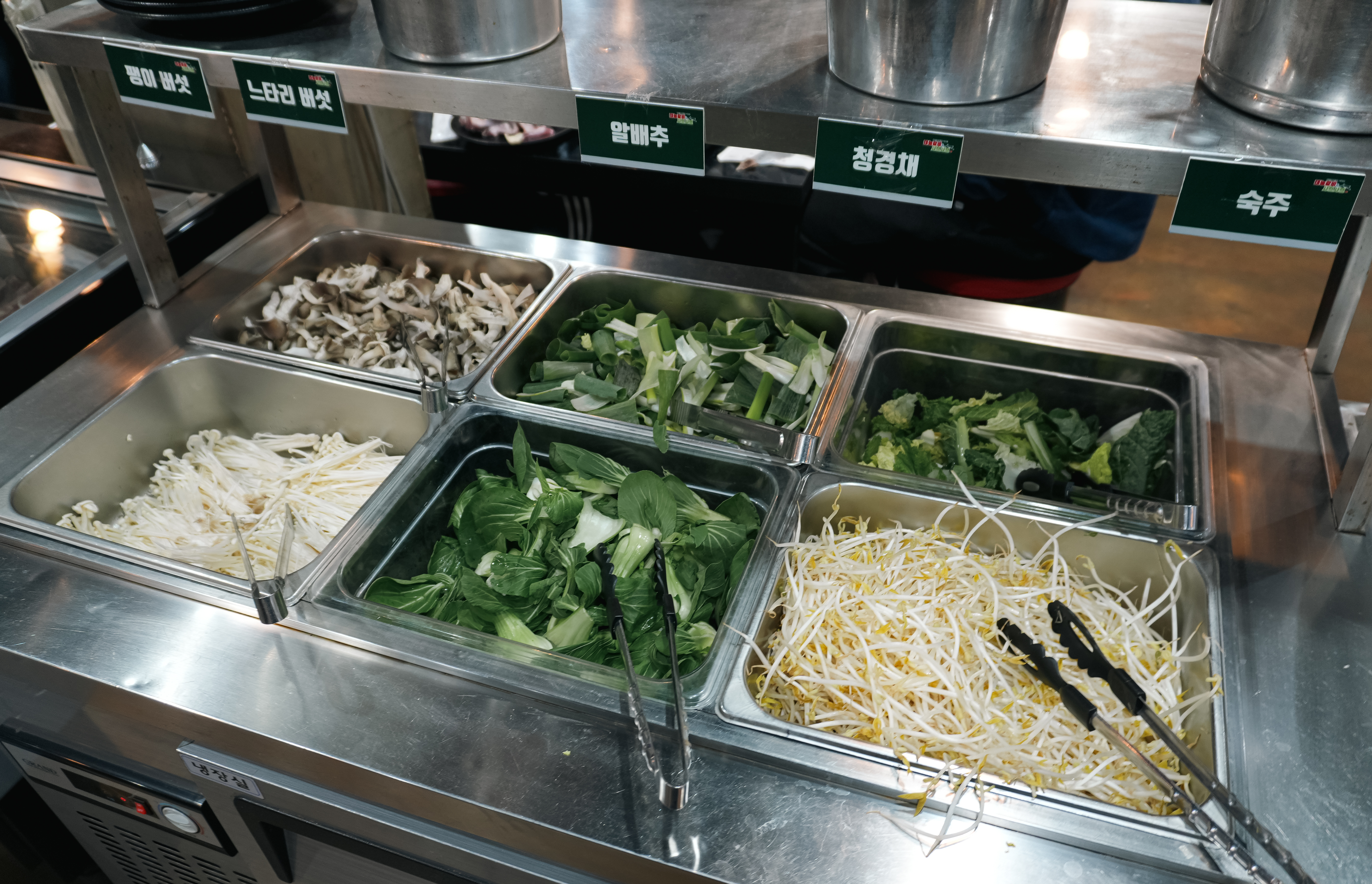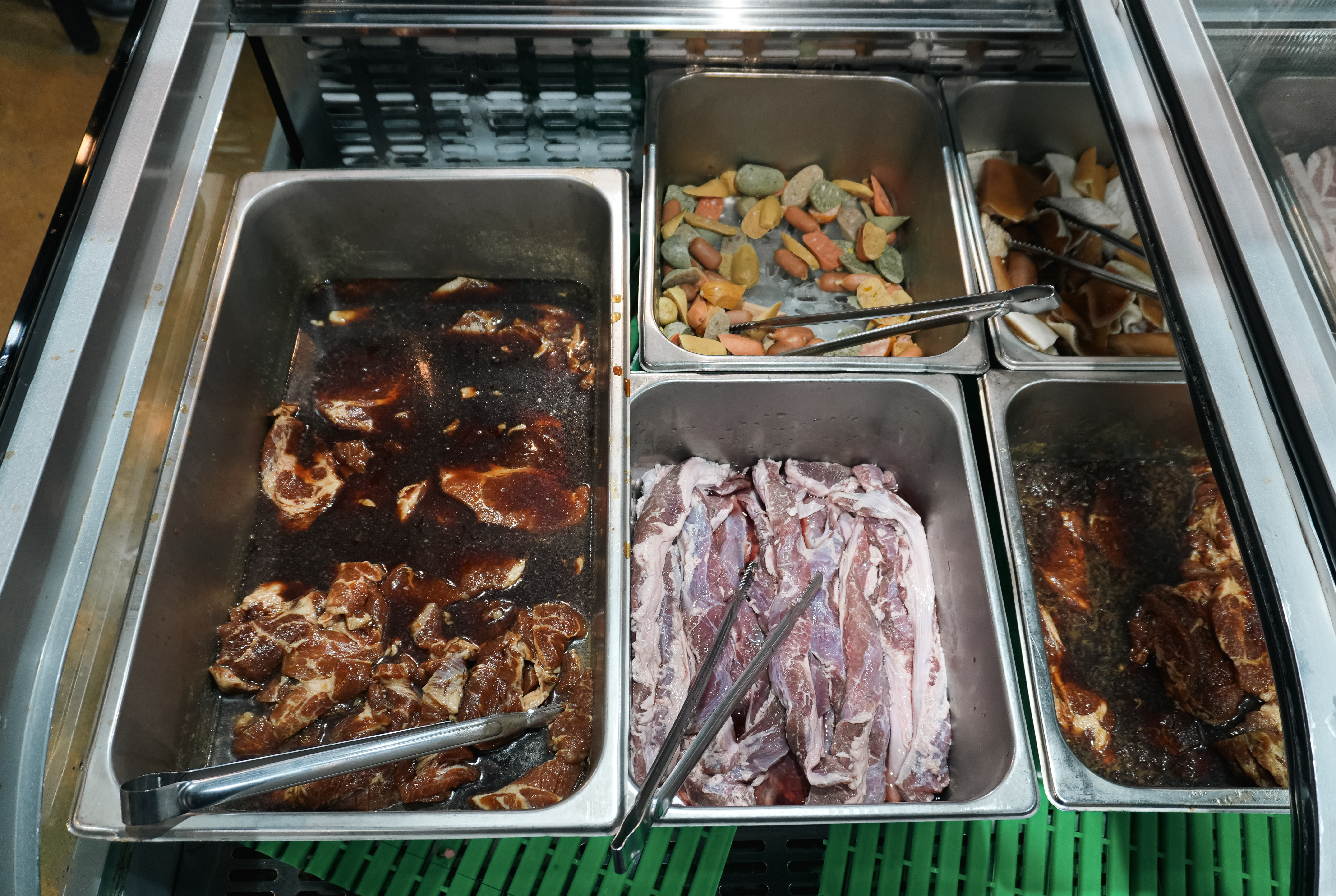 최근 샤브샤브도 무한리필로 제공하면서 라면, 채소, 버섯, 당면, 만두, 김치 등을 가져다 먹을 수 있게 되어있었고, 저는 고기에 어울리는 반찬들을 접시에 담아와 먹었습니다. 이제 테이블로 돌아가 고기를 살펴보시죠.
