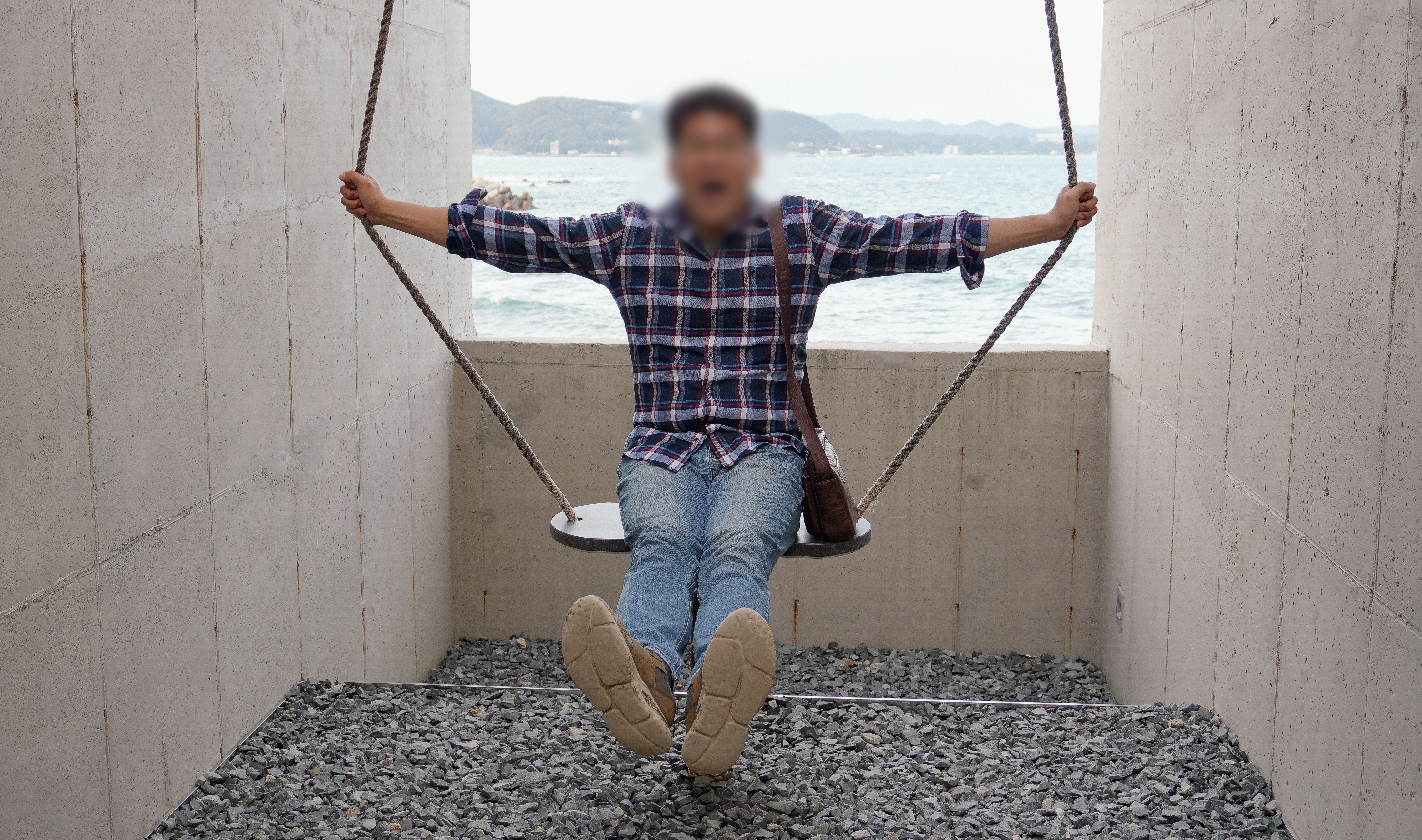 2층 카페 외부로 나가면 위 사진과 같은 포토존이 나타납니다. 그네 모형 포토존인데, 실제 그네는 아니었고 바닥에 고정된 형태였습니다. 실제 그네였으면 더 좋았을 텐데, 바닥 부분이 안 보이도록 조정해서 잘 찍어주셔야 사진이 잘 나옵니다. 사진은 모델이 못나서 이쁘게 안 나왔지만, 감안하고 봐주시면 되겠습니다.