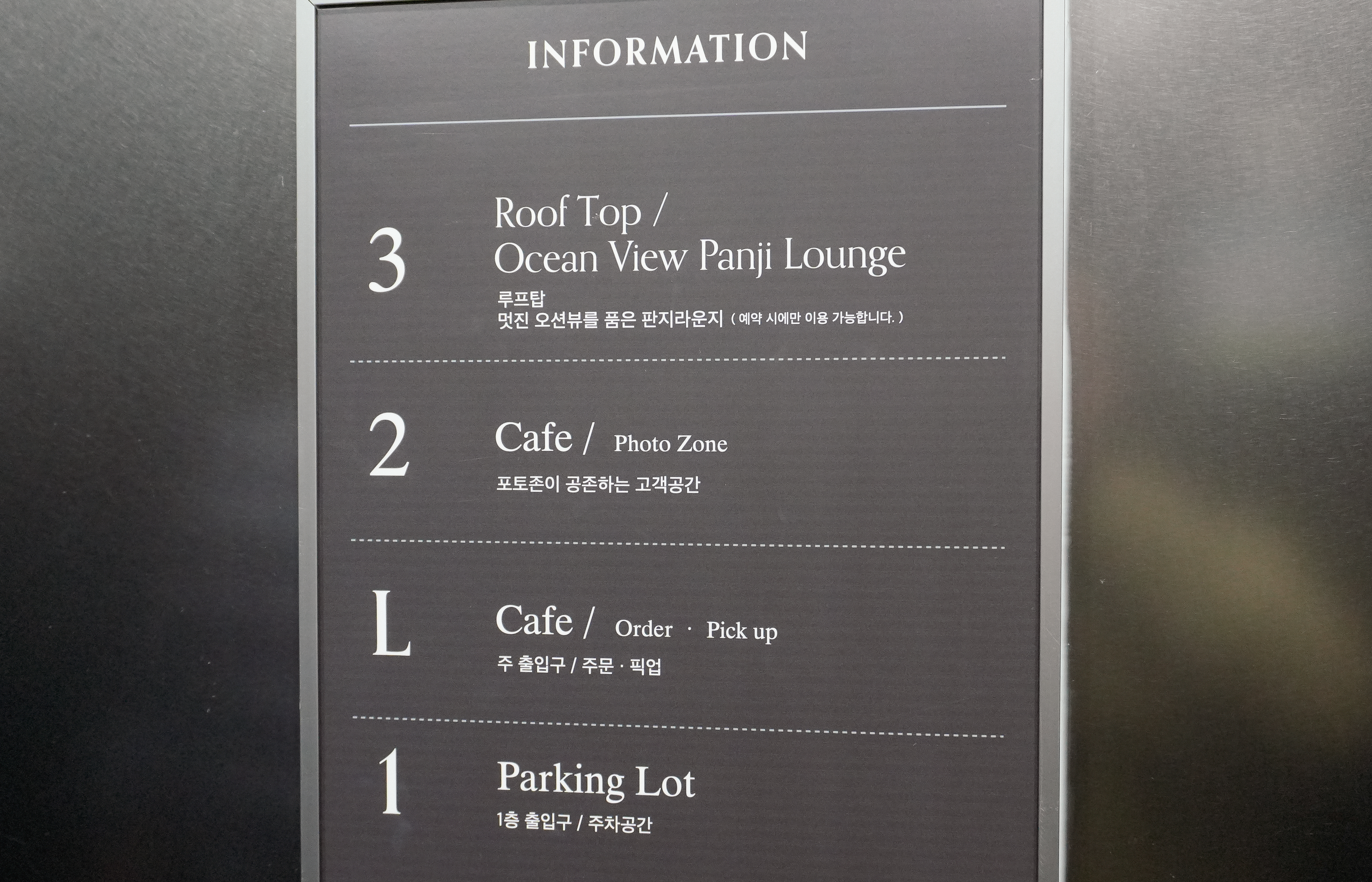 라메르판지는 울산 북구 판지1길 30, 1-2층 입니다. 1층 로비로 가는 방향에서 보면, 위와 같이 수로가 위치해 있어 포토 스팟으로 많이 사용되는 것 같습니다. 이제 가게 내부로 들어가 보겠습니다. 카페는 주문과 픽업이 가능한 1층, 포토존이 있는 2층, 오션뷰가 보이는 루프탑이 있었습니다.