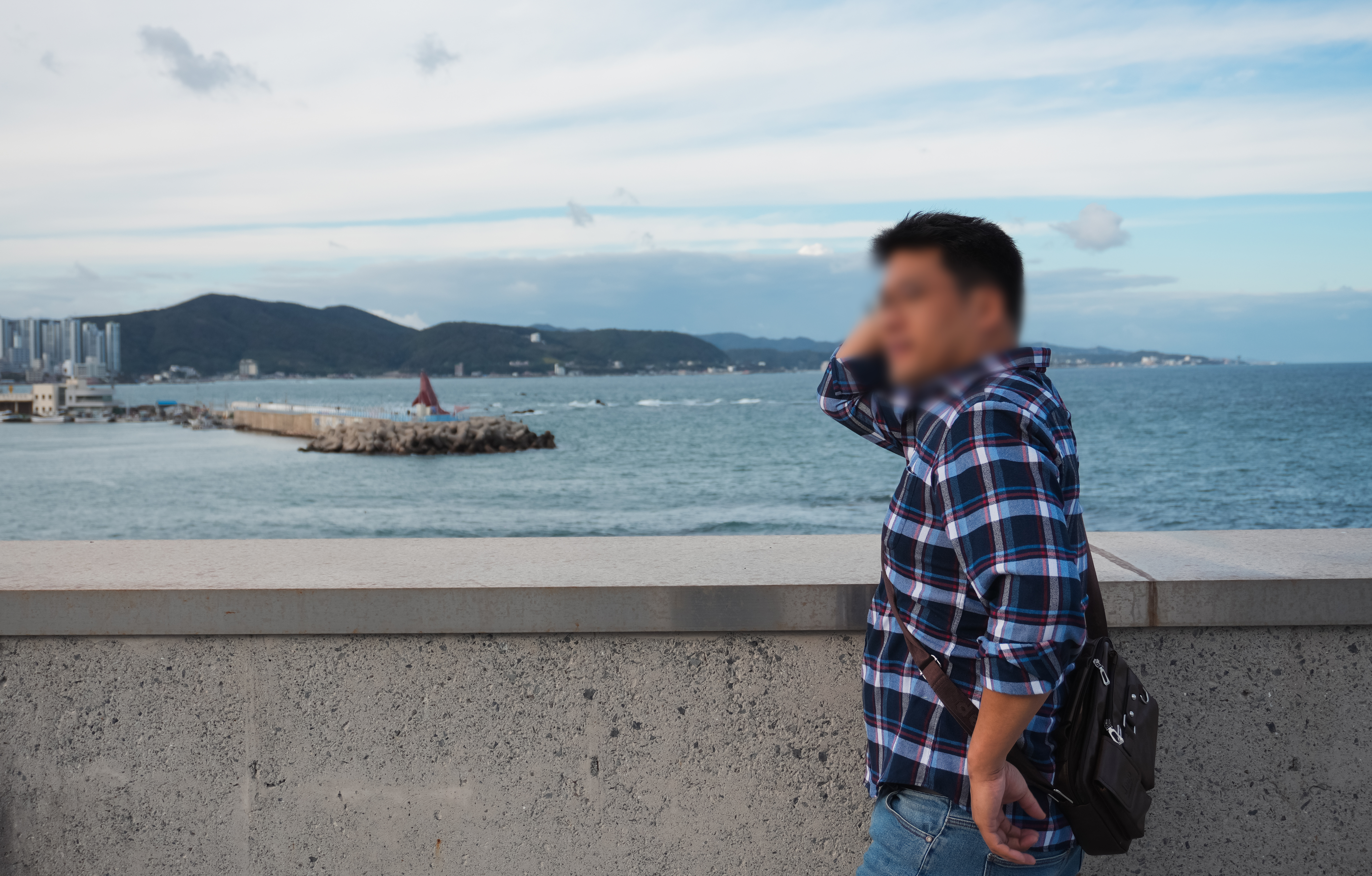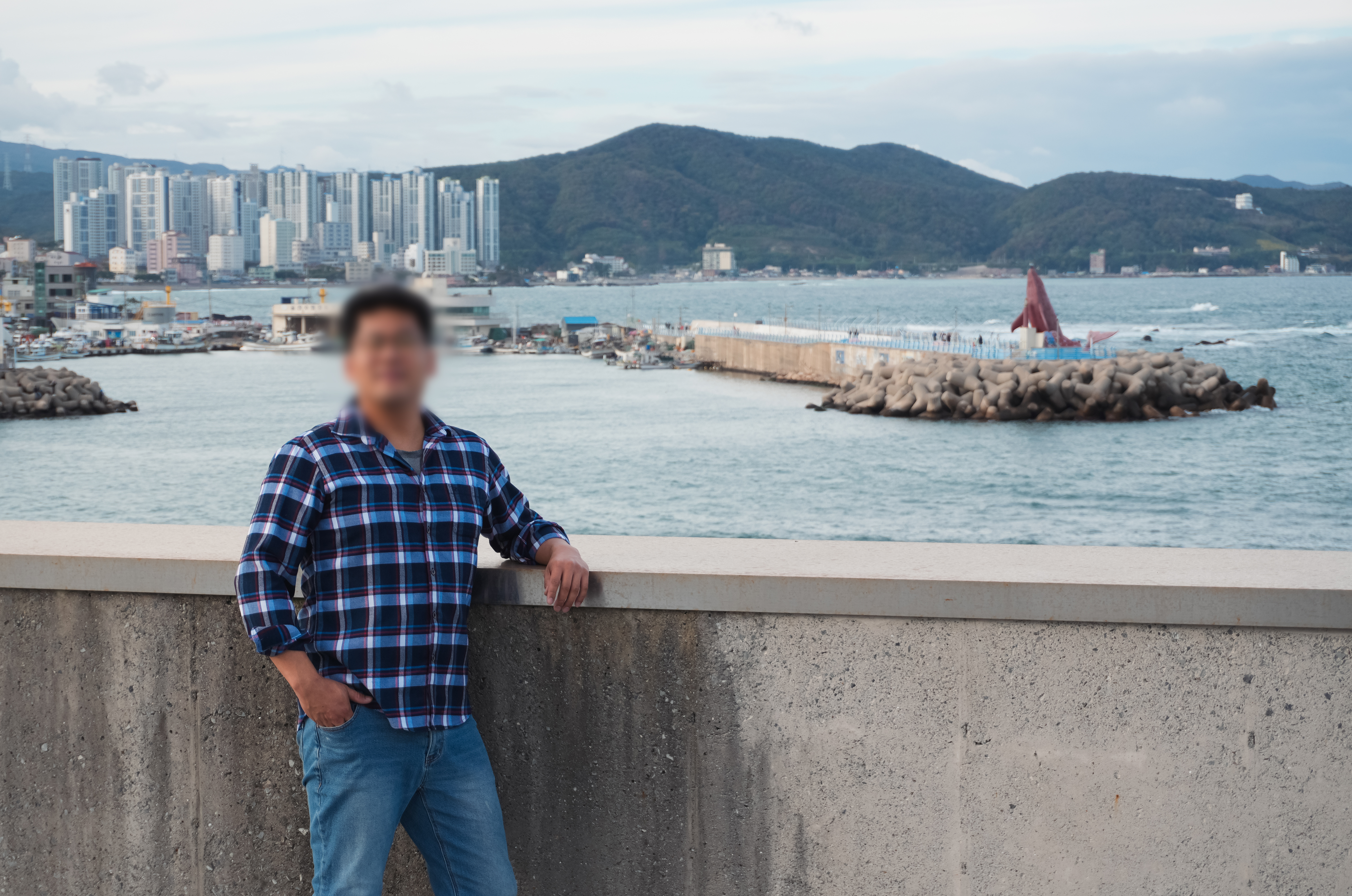 차라리 이상한 조형물이 없는 곳으로 피해서, 다른 곳에서 사진을 찍어보았습니다. 울산 정자항의 상징 귀신고래 모양의 등대를 배경으로 사진을 찍어보았습니다. 빨간 고래등대를 배경으로 사진을 찍으니 이쁘게 잘 나온 것 같습니다. 이제 정리를 해볼까요?