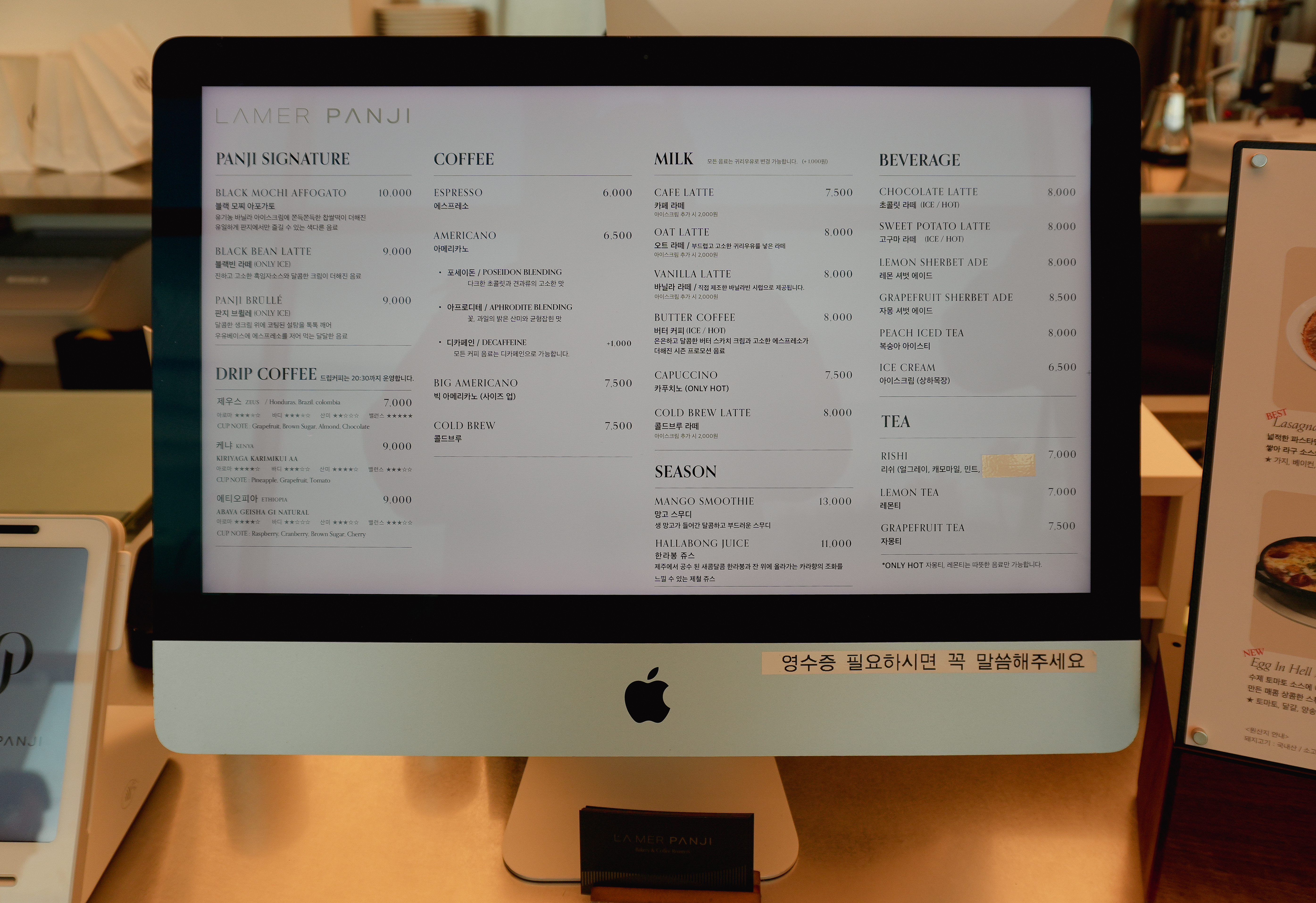 빵을 제외한 라메르판지의 메뉴를 살펴보겠습니다. 블랙모찌아포카토, 블랙빈라떼, 판지브륄레, 제우스, 케냐, 에티오피아, 에스프레소, 아메리카노(포세이돈, 아프로디테, 디카페인), 빅아메리카노, 콜드브루, 카페라떼, 오트라떼, 바닐라라떼, 버터커피, 카푸치노, 콜드브루라떼, 망고스무디, 한라봉쥬스, 초콜릿라떼, 고구마라떼, 레몬셔벗에이드, 자몽셔벗에이드, 복숭아아이스티, 상하목장아이스크림, 리쉬, 레몬티, 자몽티가 있었습니다. (베이커리류 제외)