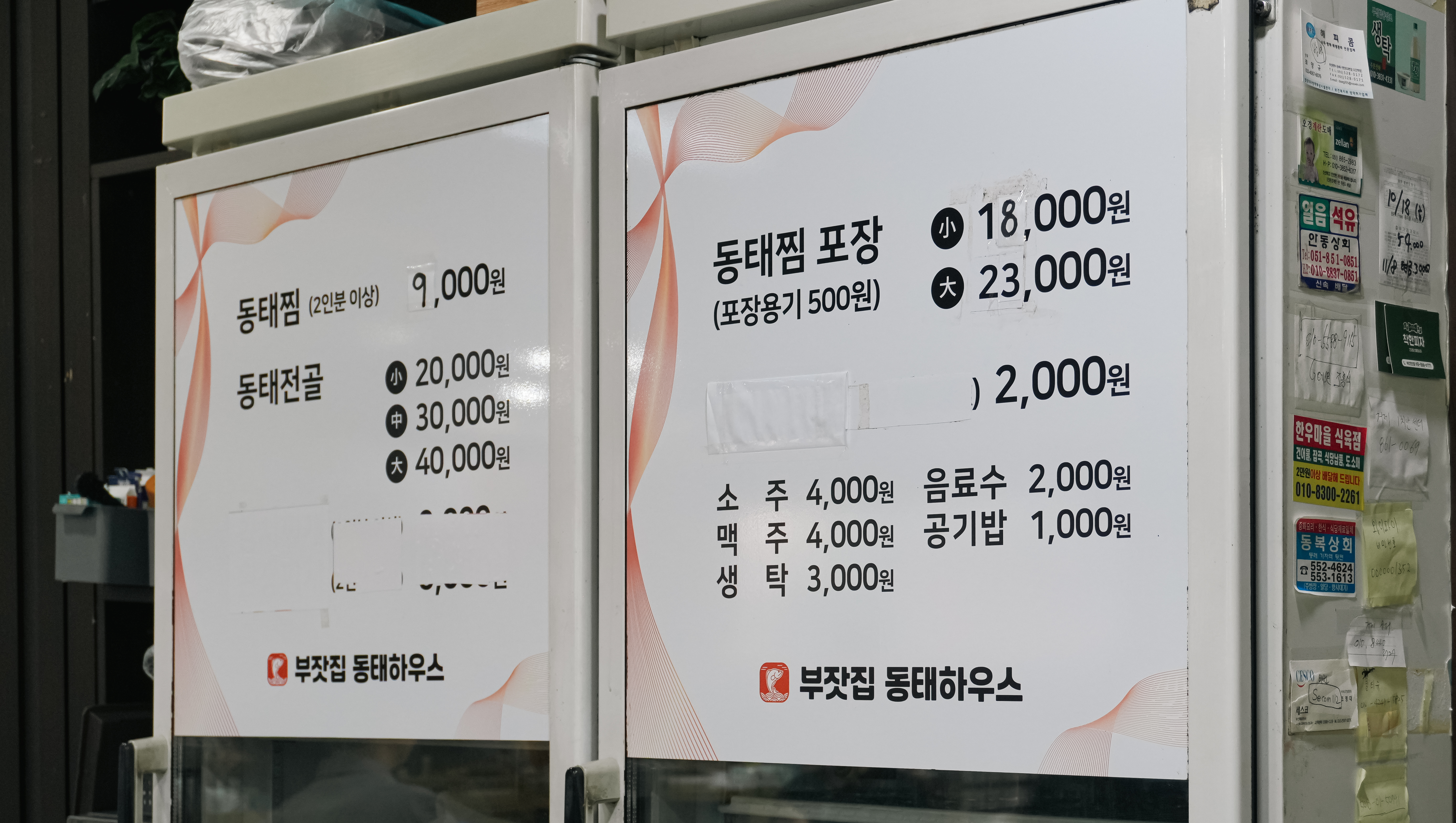 부산 거제동 부잣집동태하우스의 메뉴는 동태찜, 동태전골을 판매하고 있었고, 동태찜의 경우 1인 9,000원이라는 합리적인 가격에(2인분부터 주문가능) 판매하고 있었습니다. 가격이 저렴한 대신 동태찜의 내용물이 부실하지 않을까 걱정하시는 분들은 다음을 주목해 주시기 바랍니다.