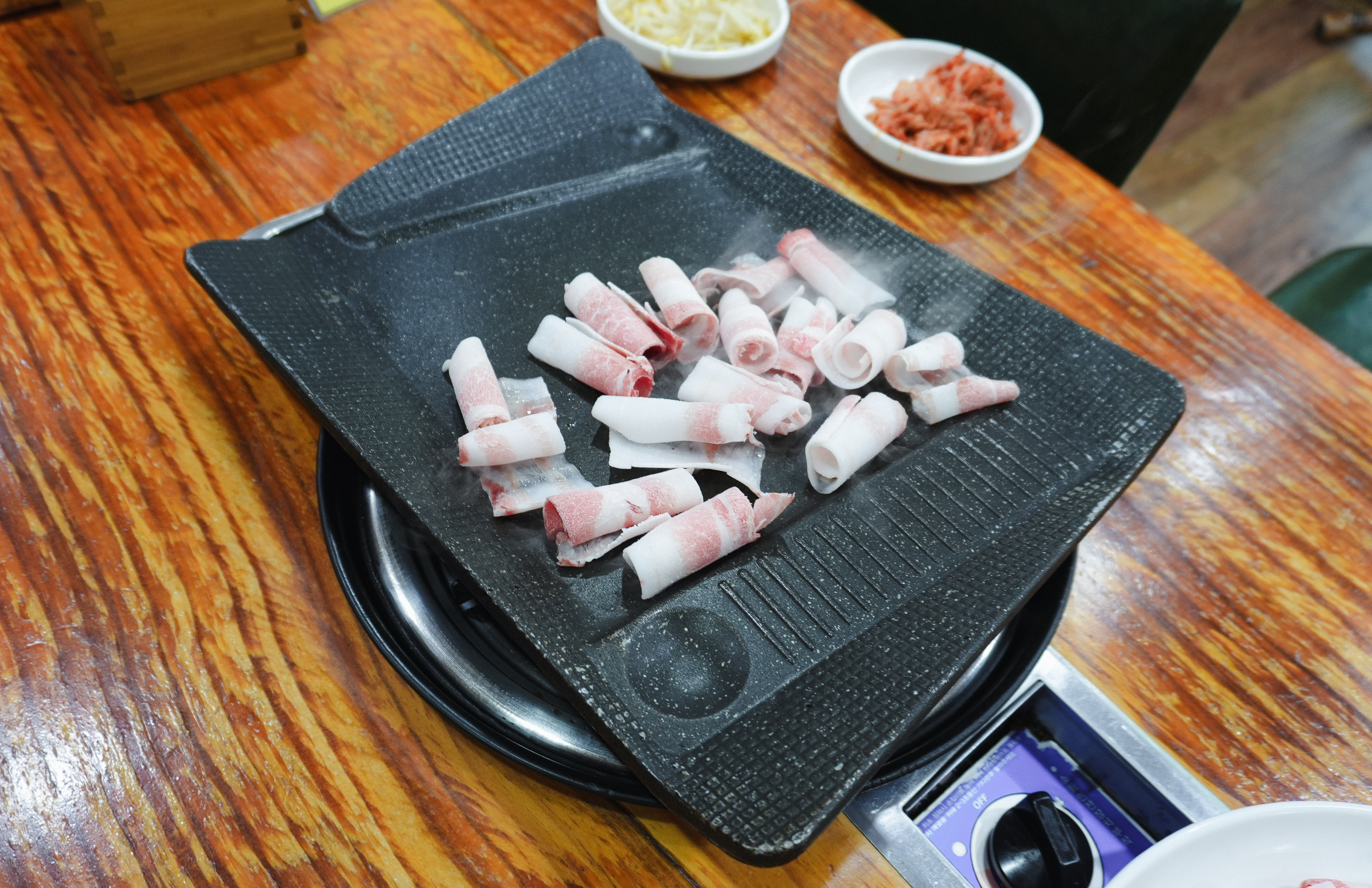 대구 대박집 중동점은 정확한 명칭으로 '정가대박집 중동점'이라 불리고 있는 듯합니다. 이곳은 대패삼겹살 무한리필 맛집으로 친구 말에 의하면 "한때는 100g에 꽤 저렴한 가격으로 판매하고 있어서, 5인분~10인분 주문하고 먹었다"라고 하더라고요. 요즘은 100g당 3,900원으로 예전처럼(?) 주문은 못했고, 500g 정도 주문해서 먹었습니다.