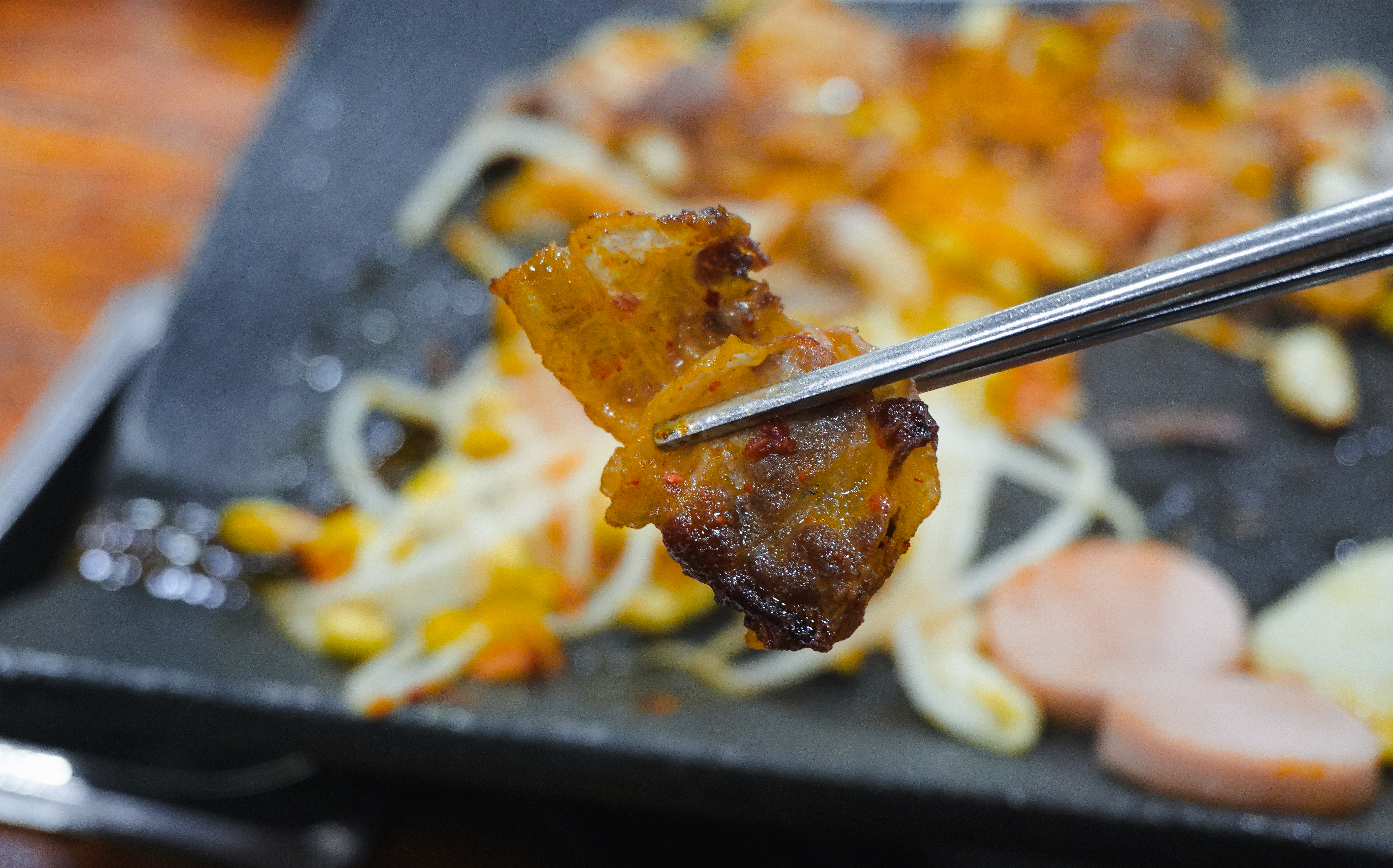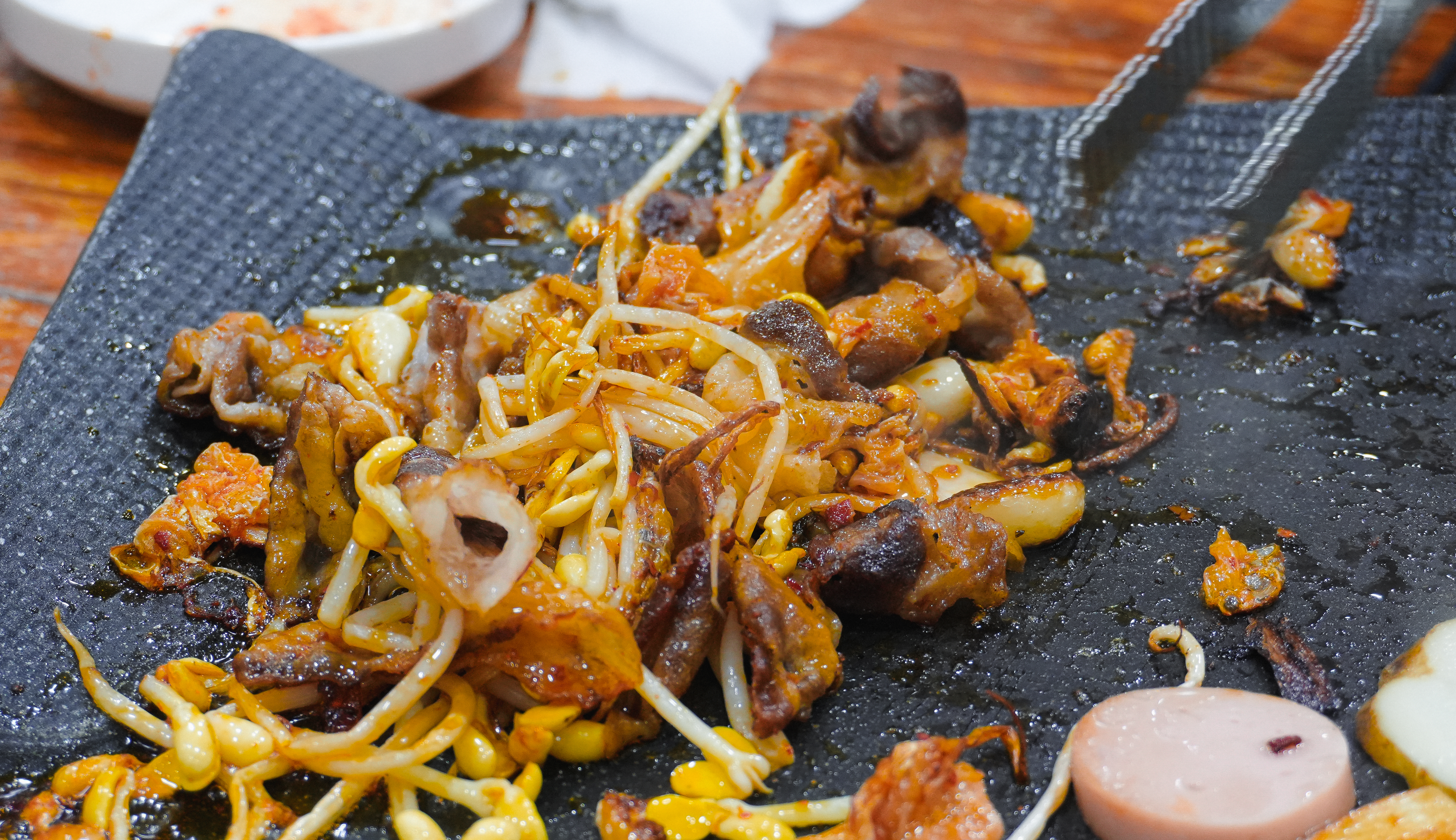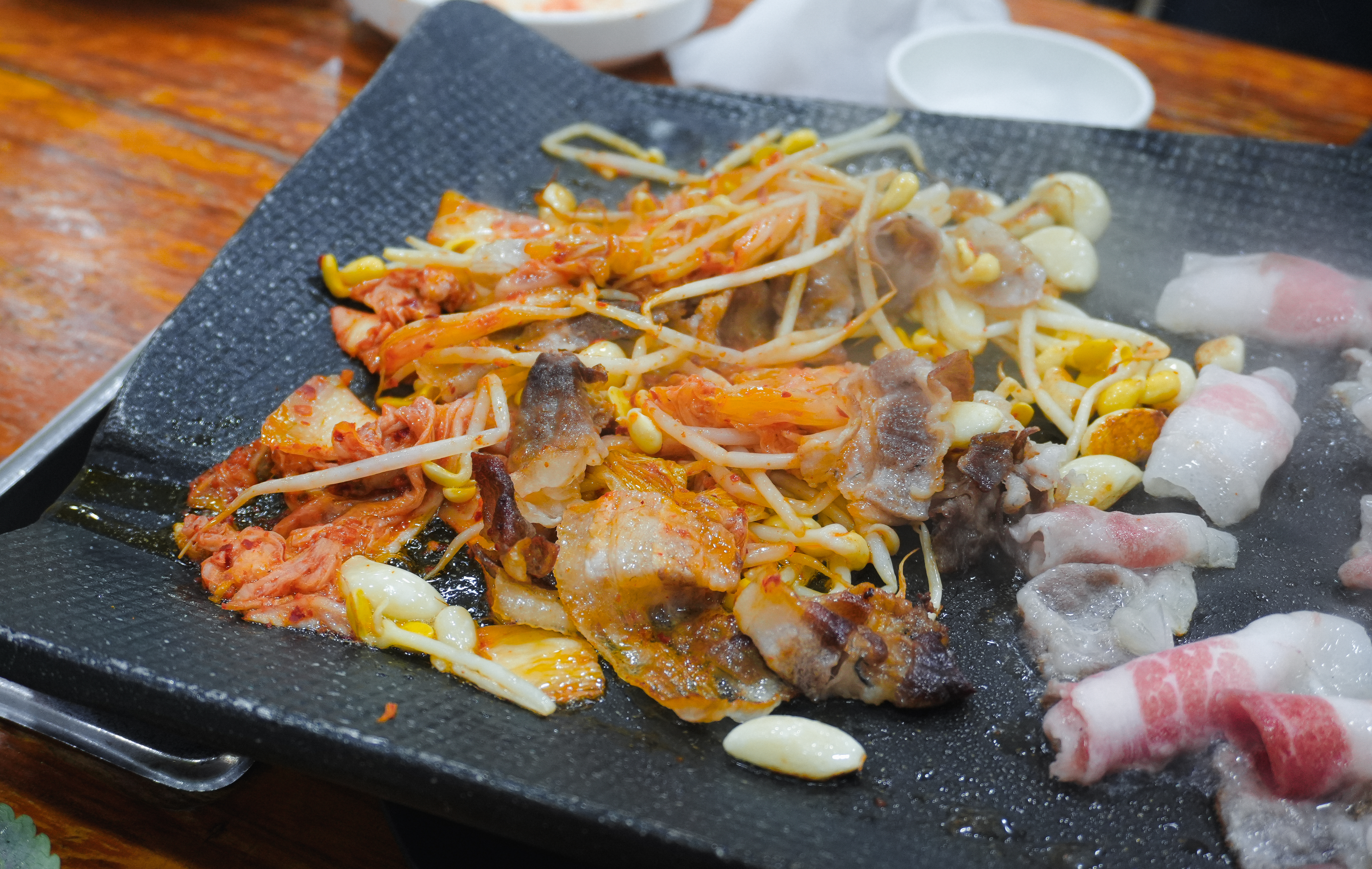 대박삼겹살로 불리는 대패삼겹살 5인분의 모습입니다. 불판 위에 대패삼겹살과 곁들일 콩나물, 김치 등을 올려 구워줍니다. 기름이 빠지는 방향으로 채소를 올려 기름을 머금을 수 있게 구워주었습니다.