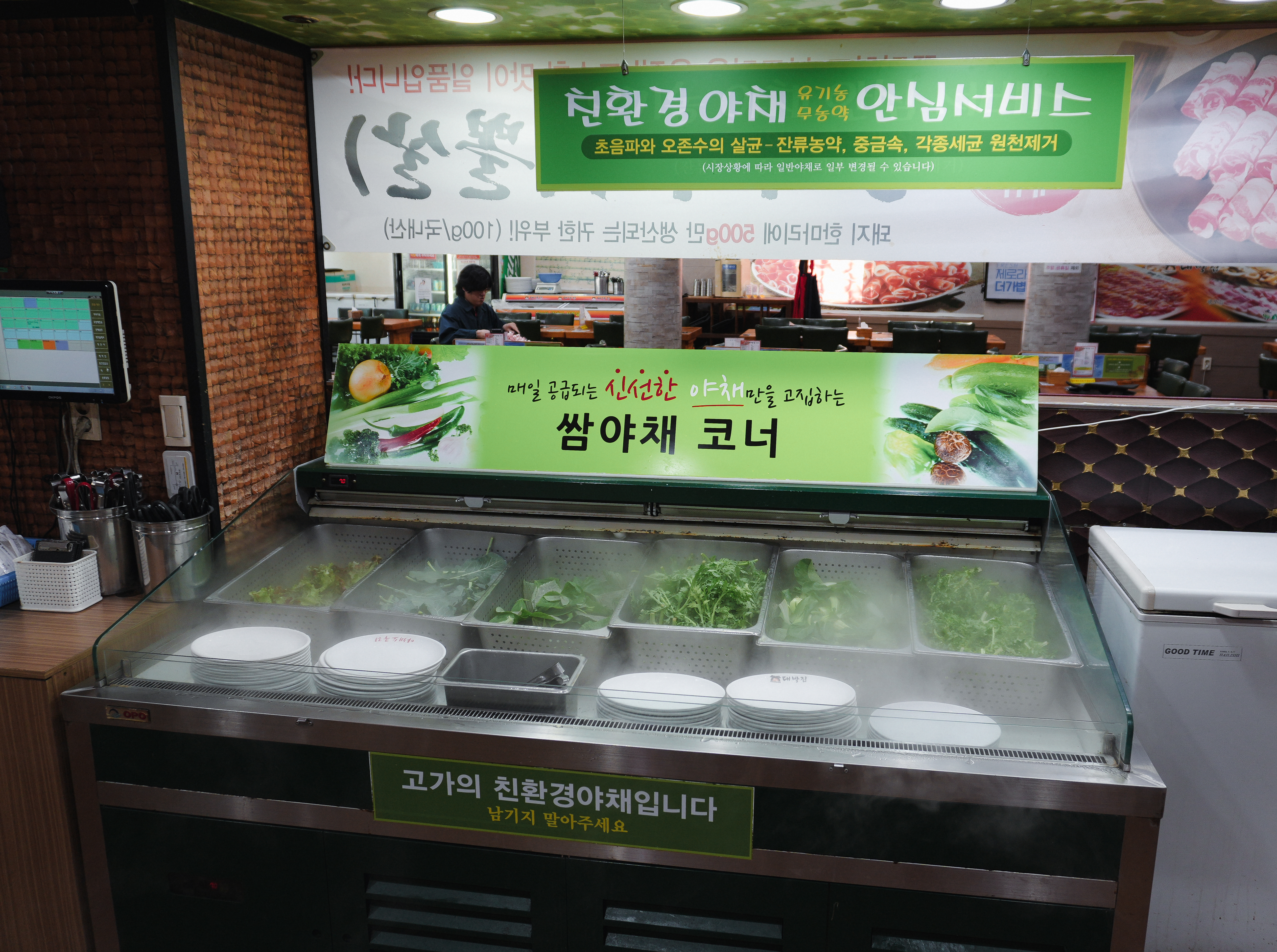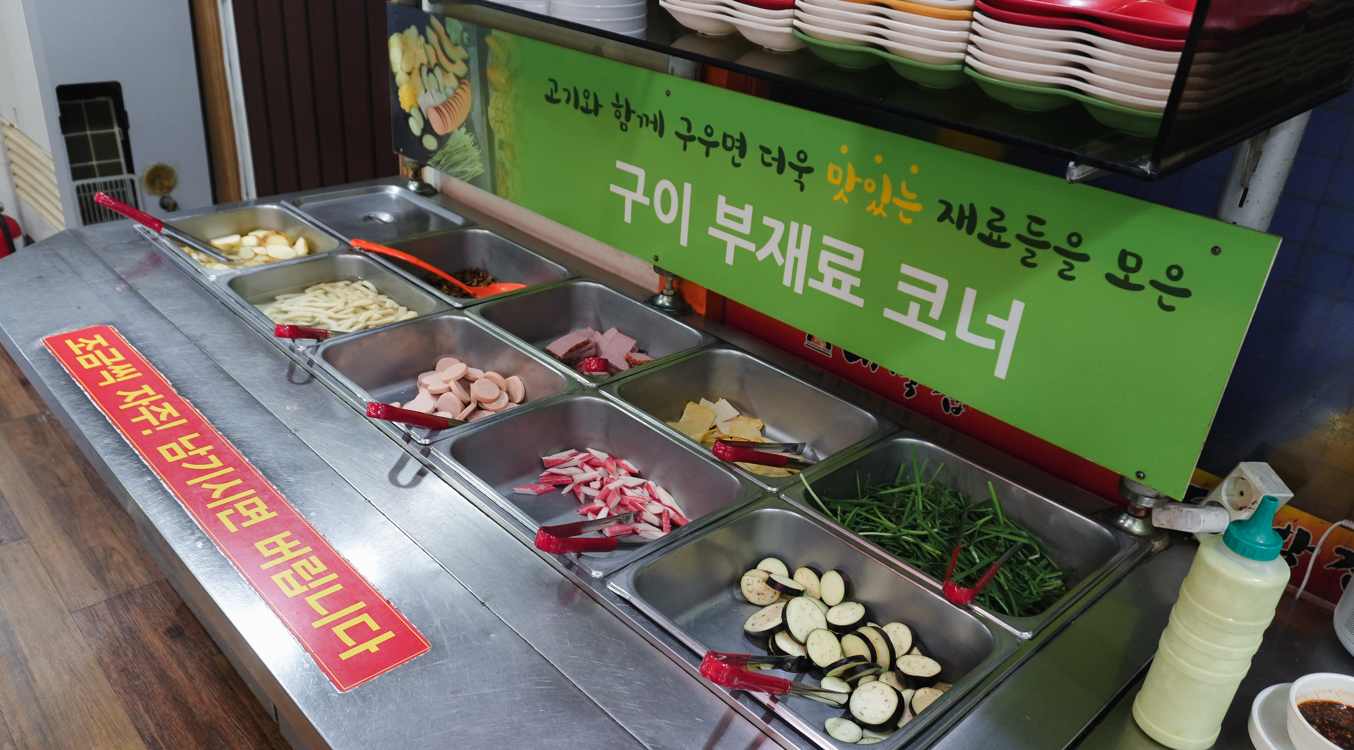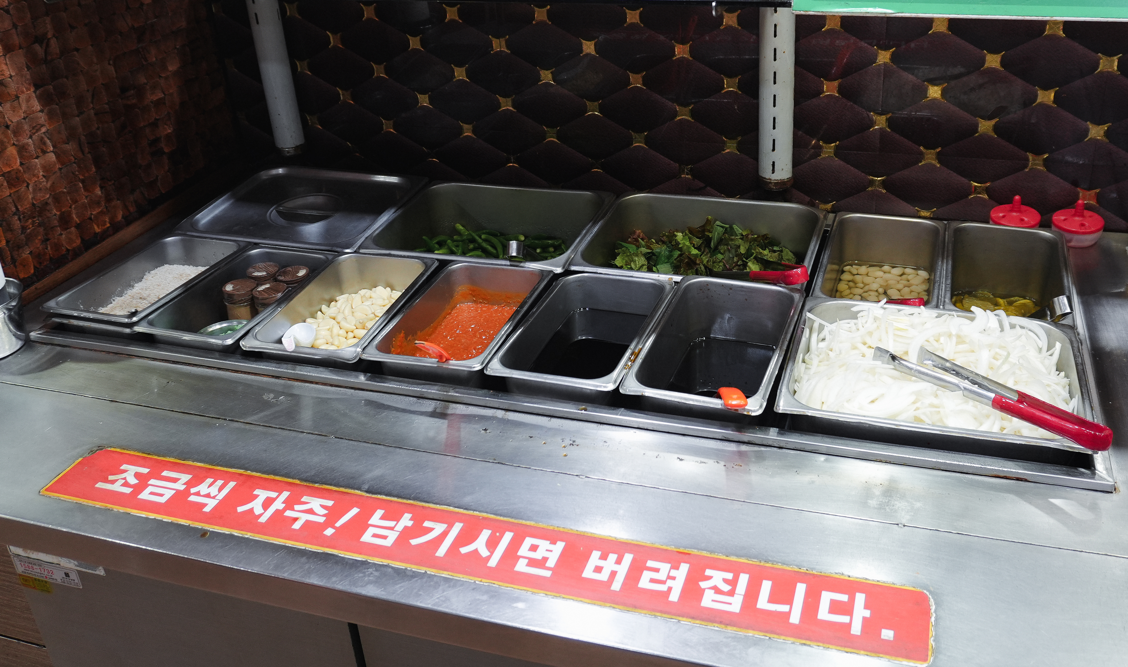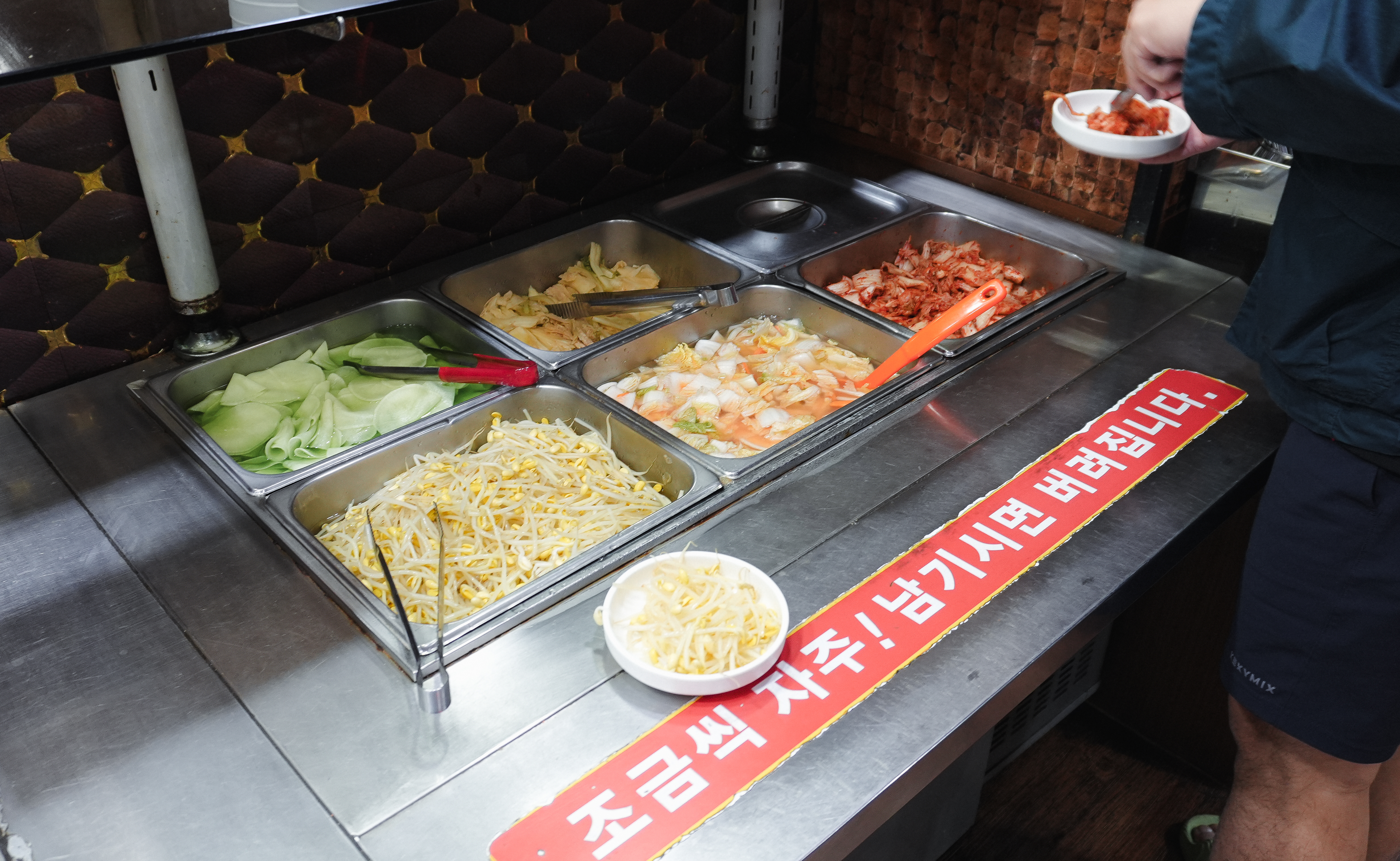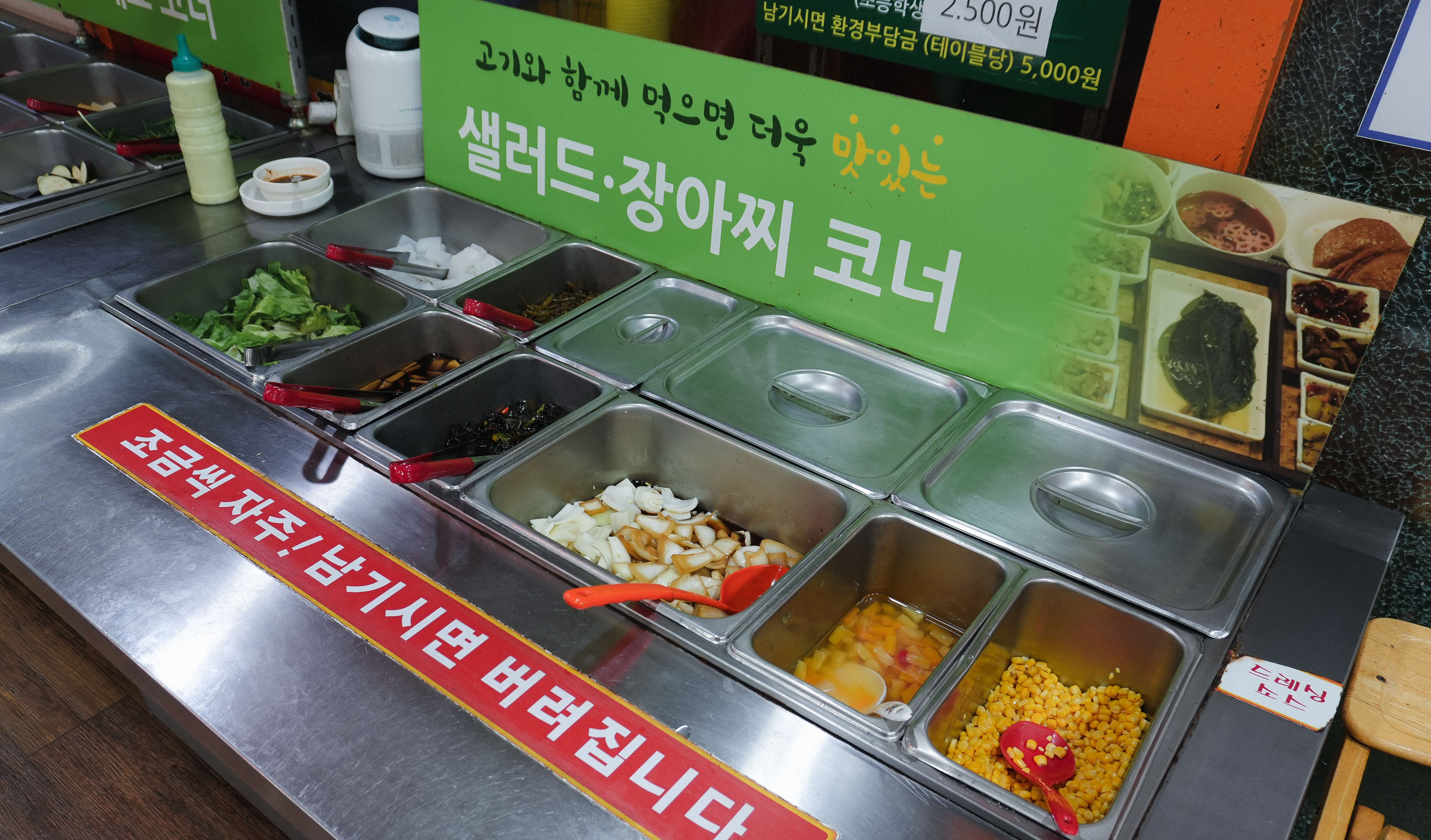대구 대박집은 셀프바가 잘 되어있는 고깃집이었습니다. 각종 샐러드와 장아찌, 감자, 떡, 햄, 소시지, 부추, 소스, 장류, 김치, 쌈무, 쌈채소 등으로 다양한 구성으로 입맛에 따라 골라서 먹을 수 있게 되어있었습니다. 친구랑 저는 반찬 먹는 취향이 달라서 각자 가져다 먹었습니다.