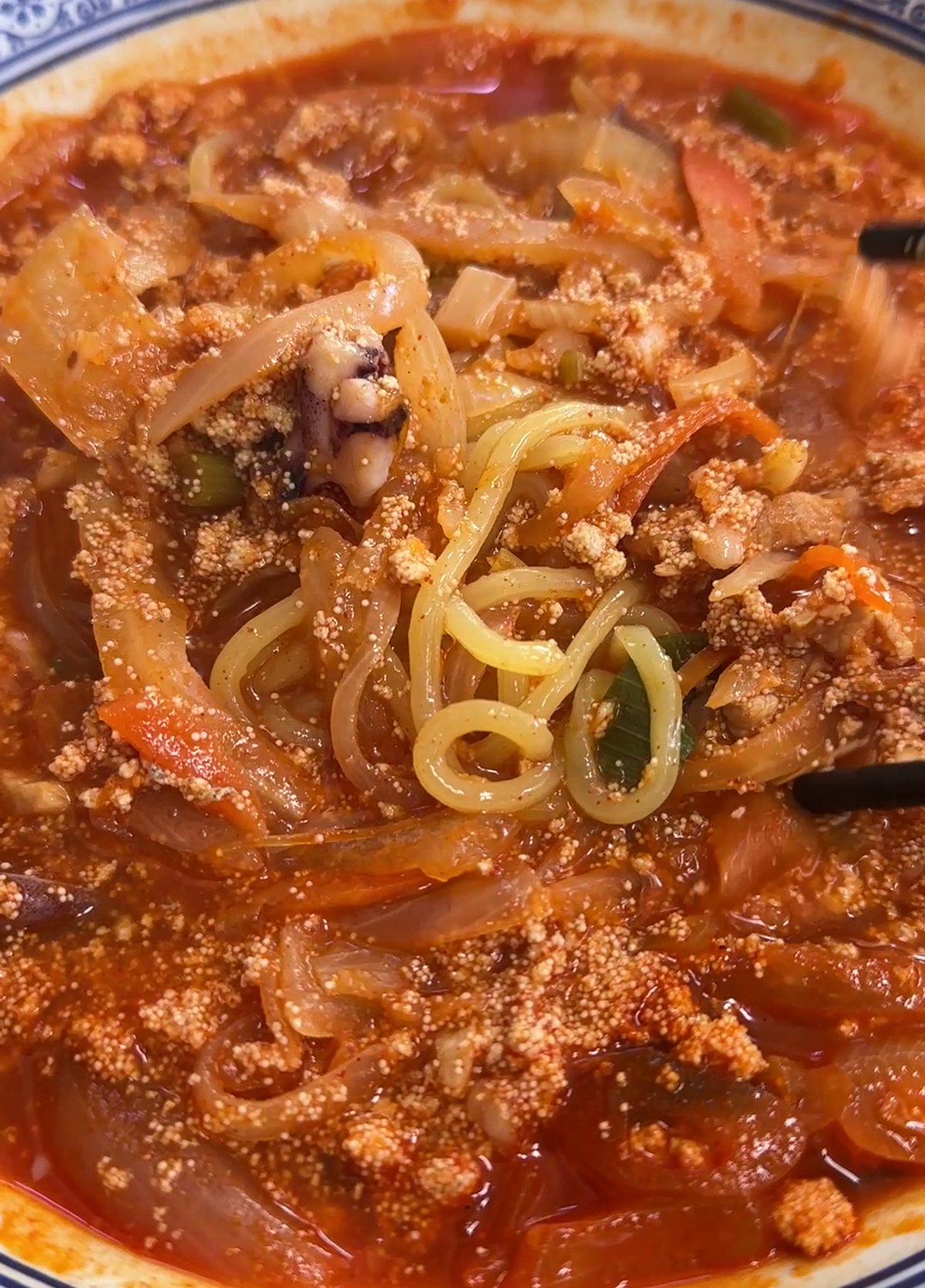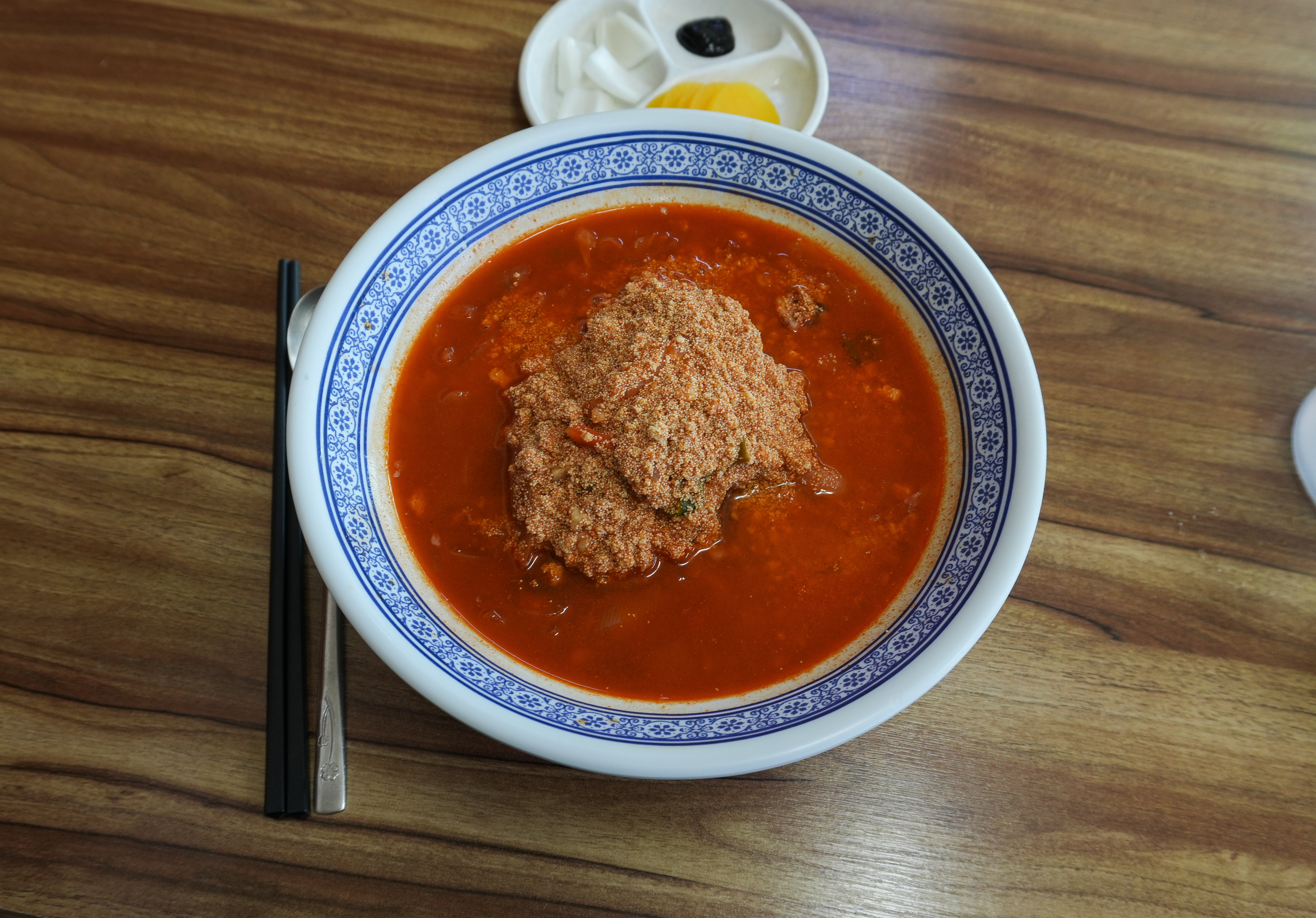비룡짬뽕의 알탕짬뽕은 위와 같이 제공되었습니다. 멀리서 봤을때는 마치 캔참치를 덮어놓은 듯한 비주얼인데, 가까이서 보면 생선알이 풀어져 올라간 모습을 하고 있었습니다.